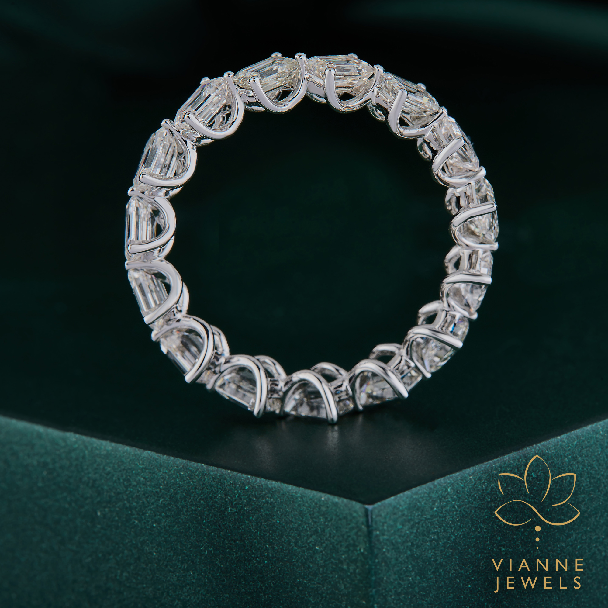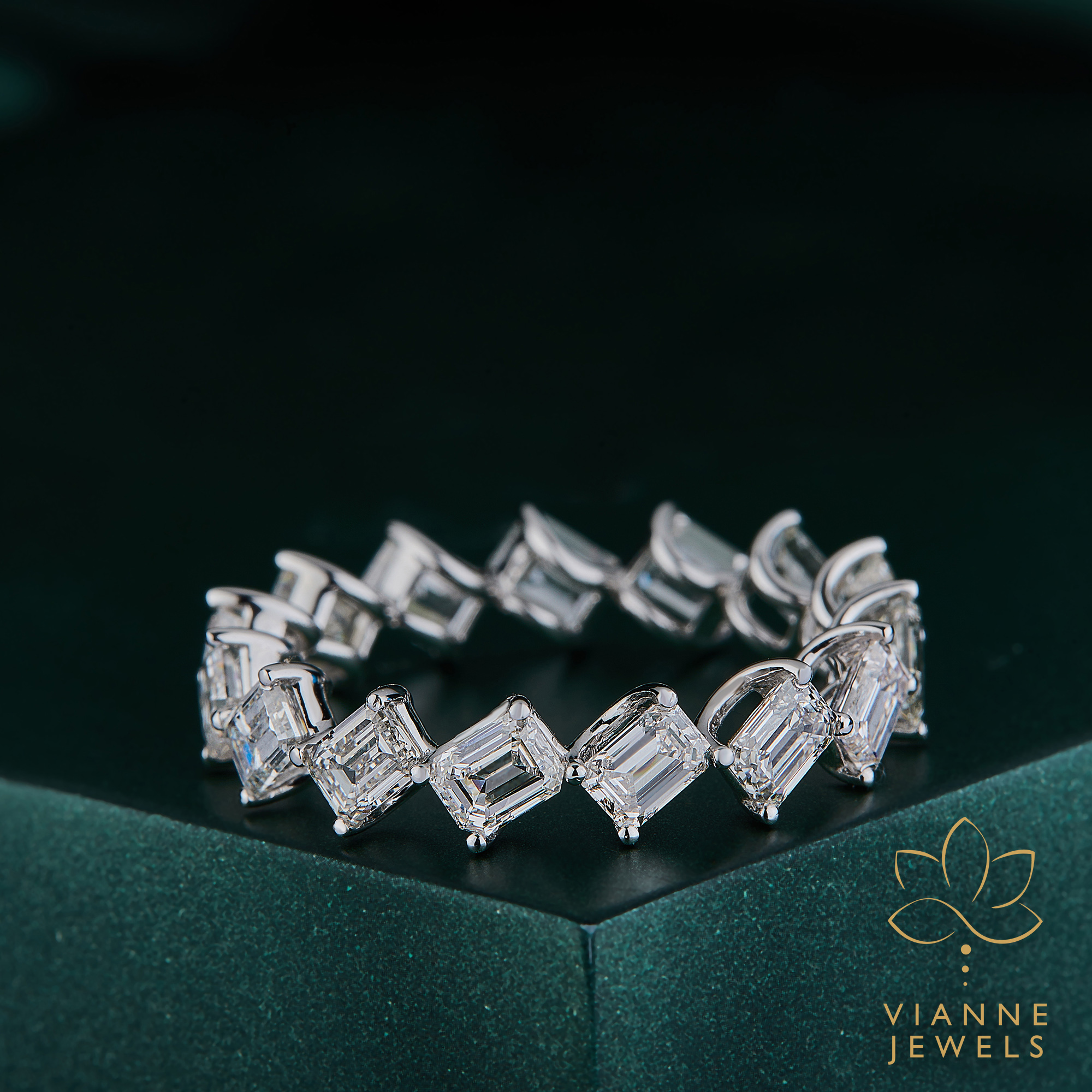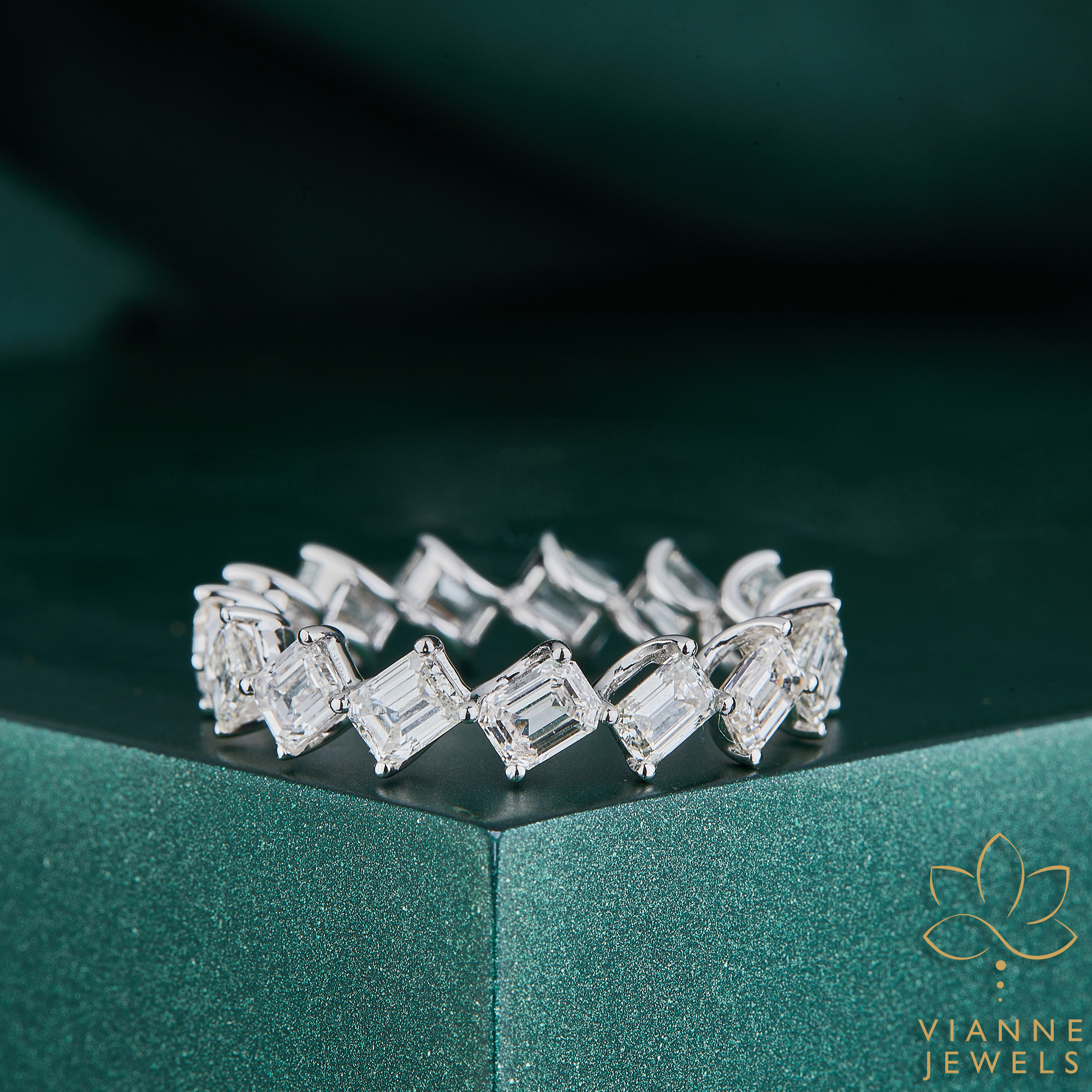 “The ‘Architectural Allure’ Diamond Zigzag Band is a celebration of modern design and innovative craftsmanship. This distinctively styled ring features a striking pattern of emerald-cut lab-grown diamonds, each set in an alternating zigzag pattern within a sleek white gold band. The clean, architectural lines create a dynamic interplay of light and shadow, showcasing the diamonds’ precise cuts and pristine clarity.