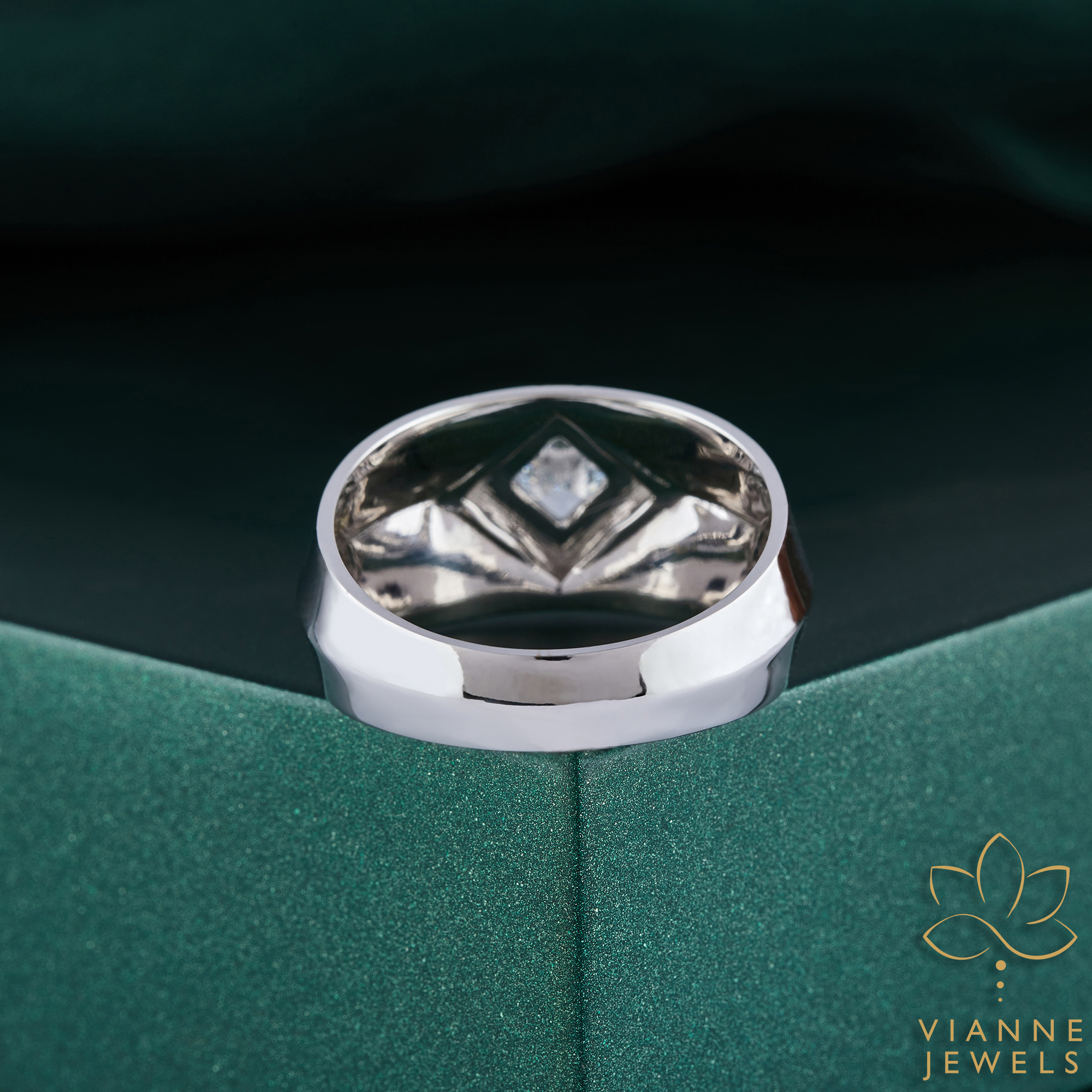 The ring itself is forged from high-quality sterling silver, known for its durability and mirror-like finish. The substantial band tapers smoothly towards the back, ensuring a comfortable fit while maintaining its bold aesthetic. The diamond is bezel-set, protecting its edges and enhancing its visual impact.