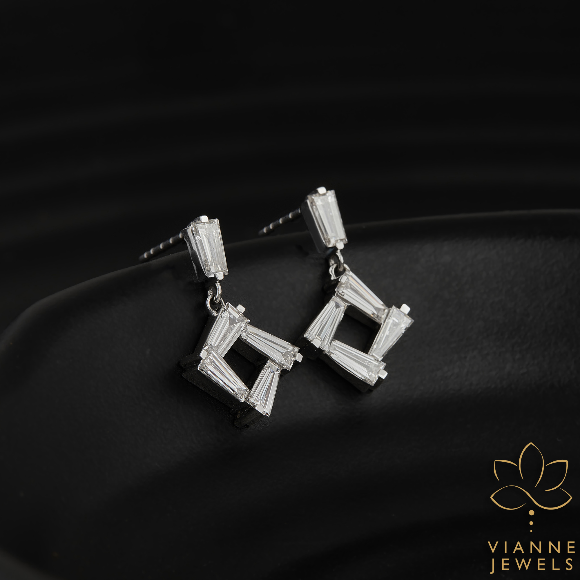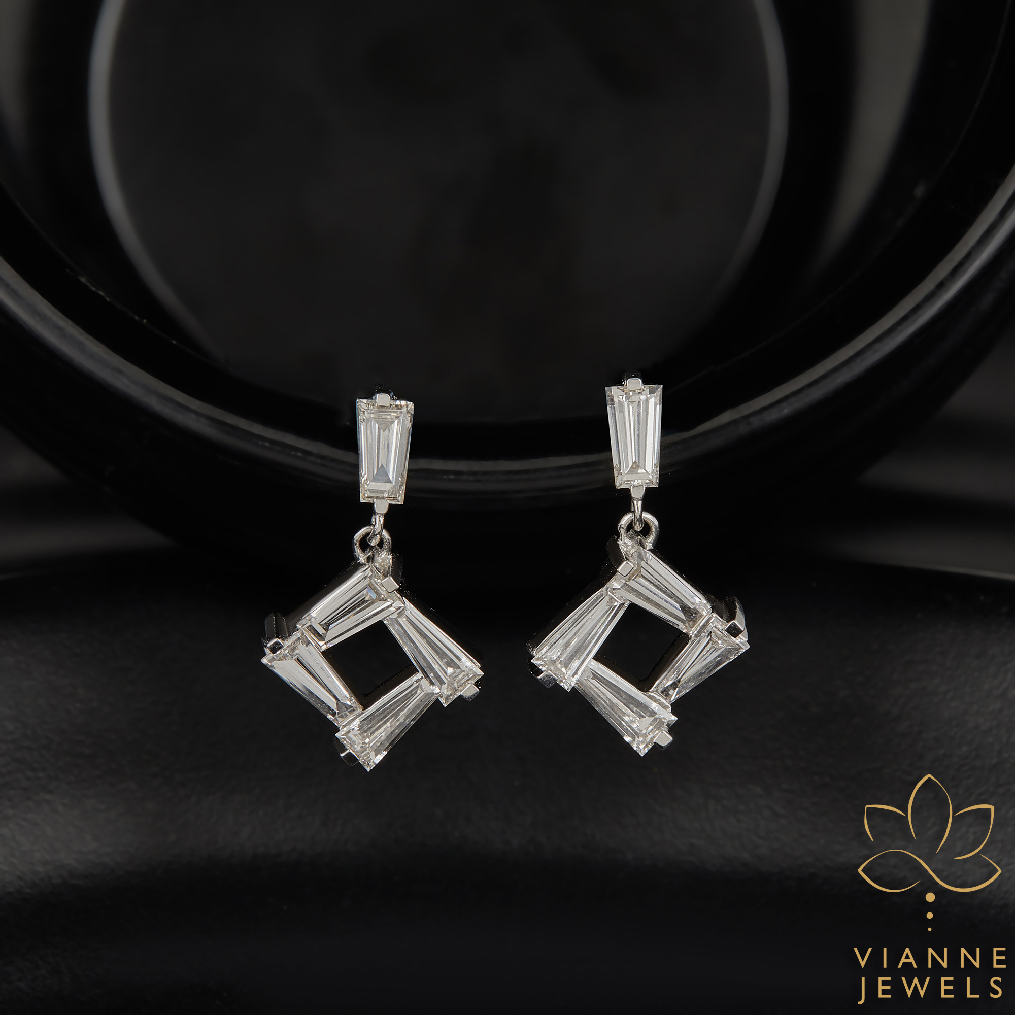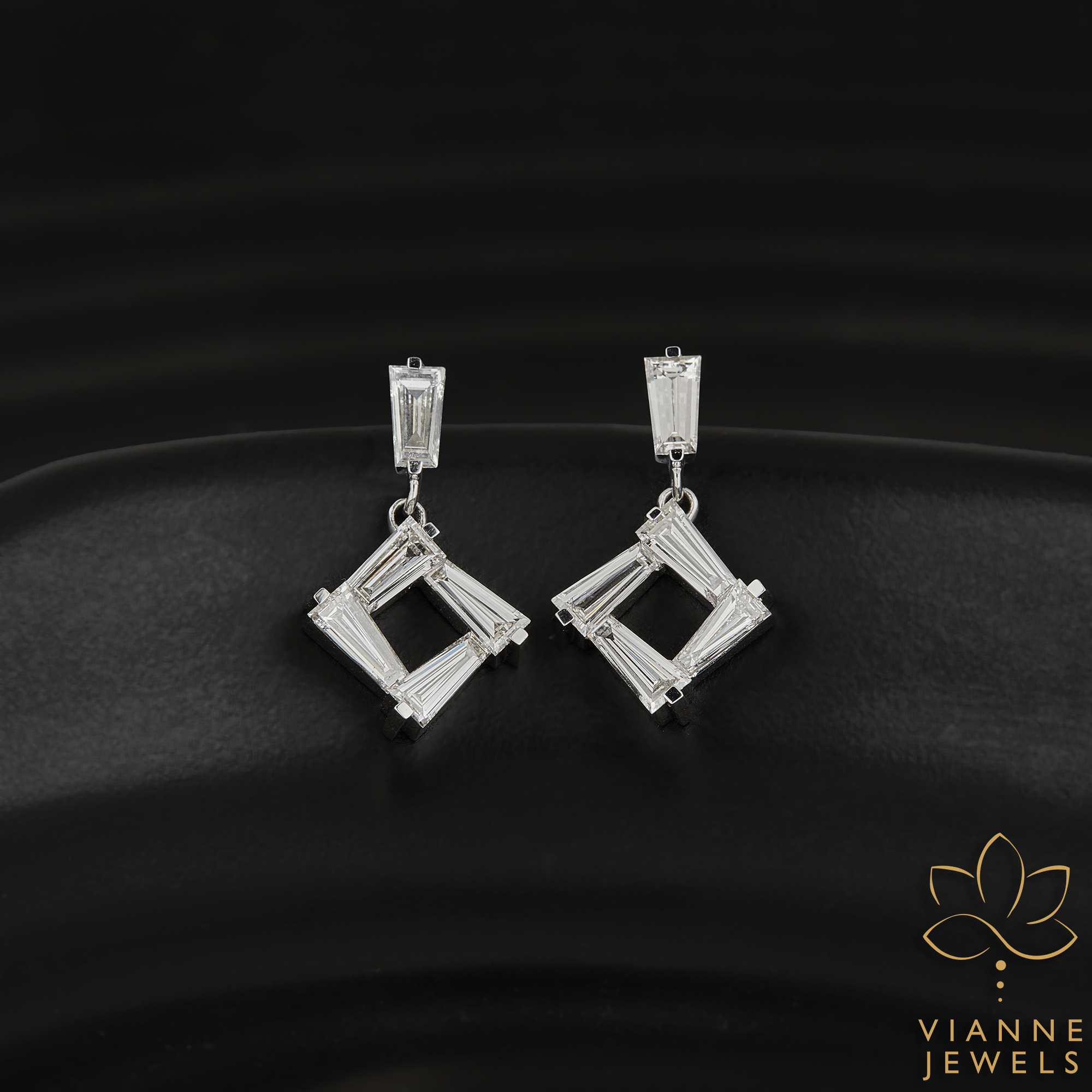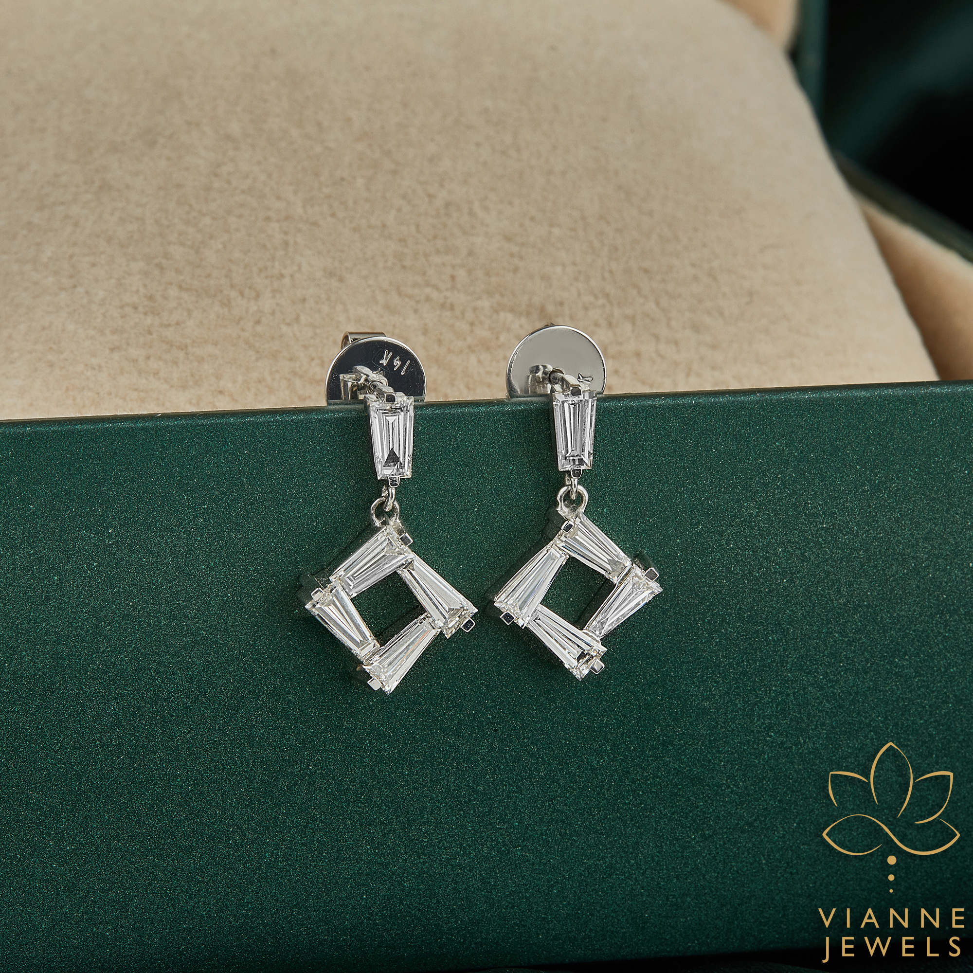 Step into a world of sophistication with our Art Deco Inspired Dangle Earrings, showcasing elegant baguette lab-grown diamonds in a polished white gold setting for a timeless look.