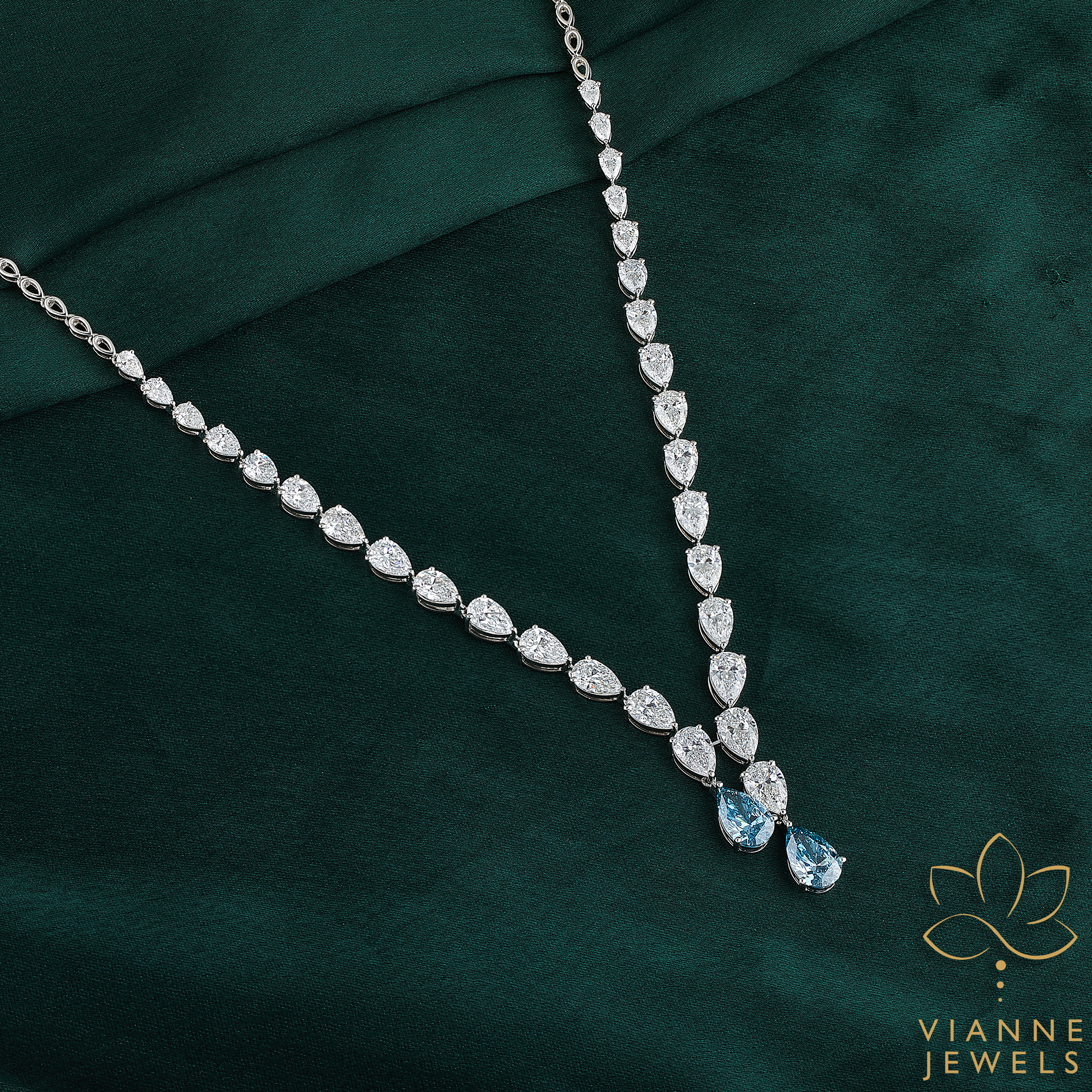 “Azure Teardrop Elegance” is a sterling necklace adorned with sparkling lab-grown diamonds and captivating blue gemstone teardrops, combining classic charm and modern allure.