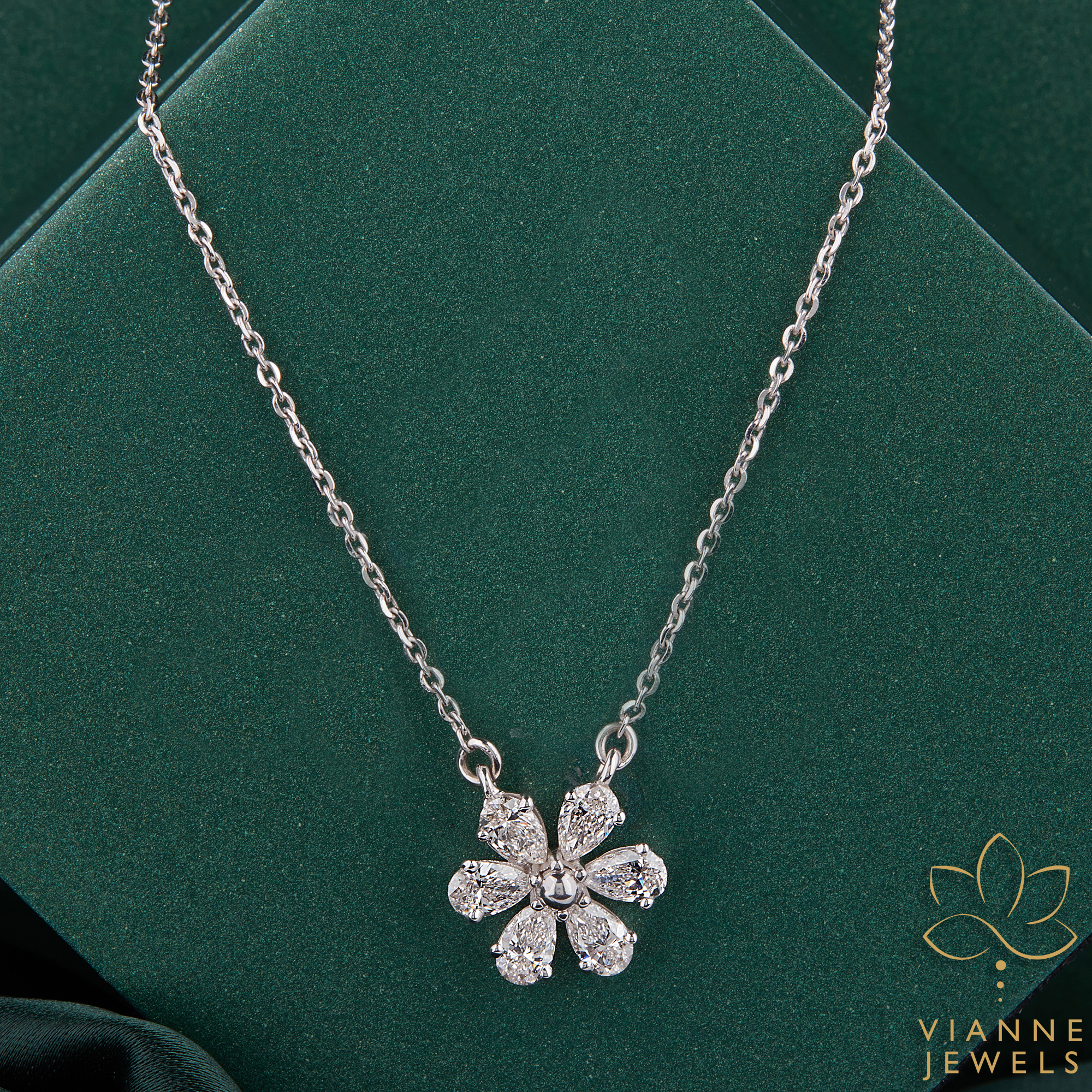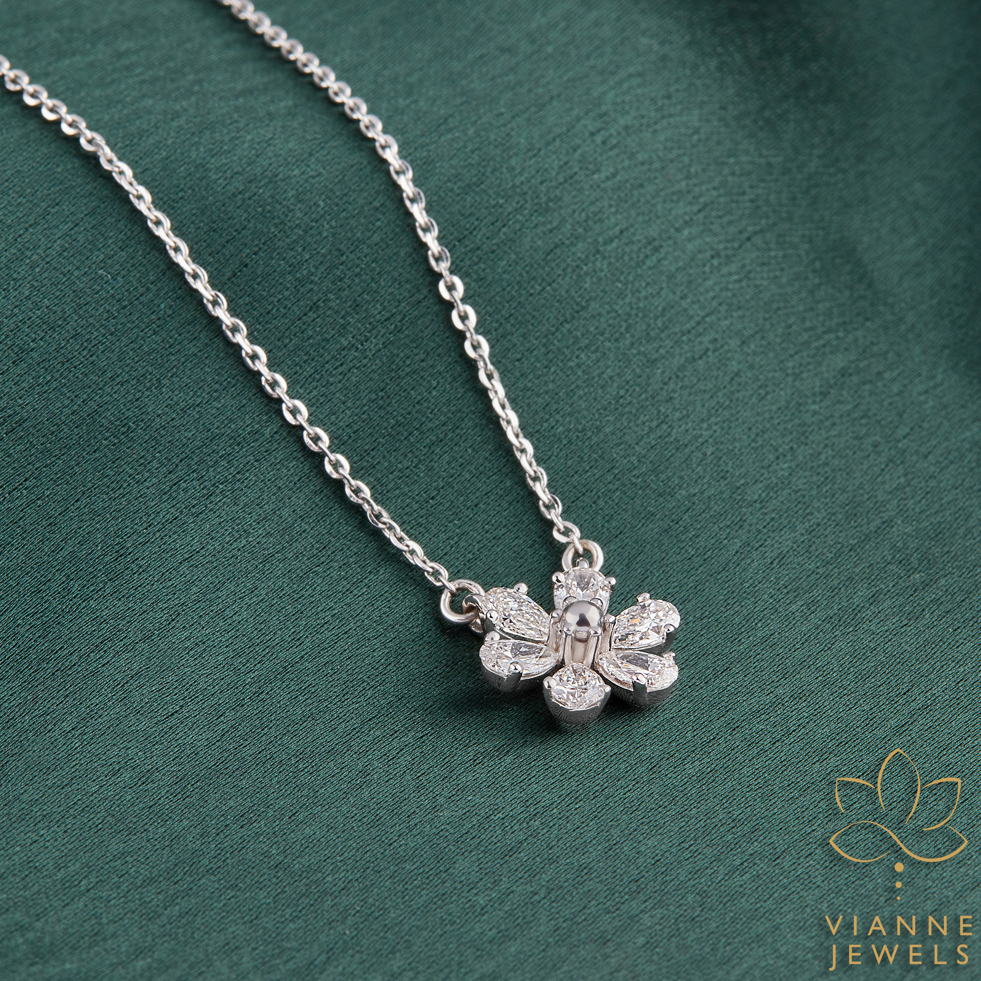 “Capture the essence of springtime elegance with the ‘Blossom Sparkle’ pendant, a delicate flower-shaped masterpiece crafted with precision and care. At the heart of this enchanting piece is a cluster of lab-grown diamonds, each selected for its exceptional purity and brilliance, forming a dazzling floral motif that blooms eternally.