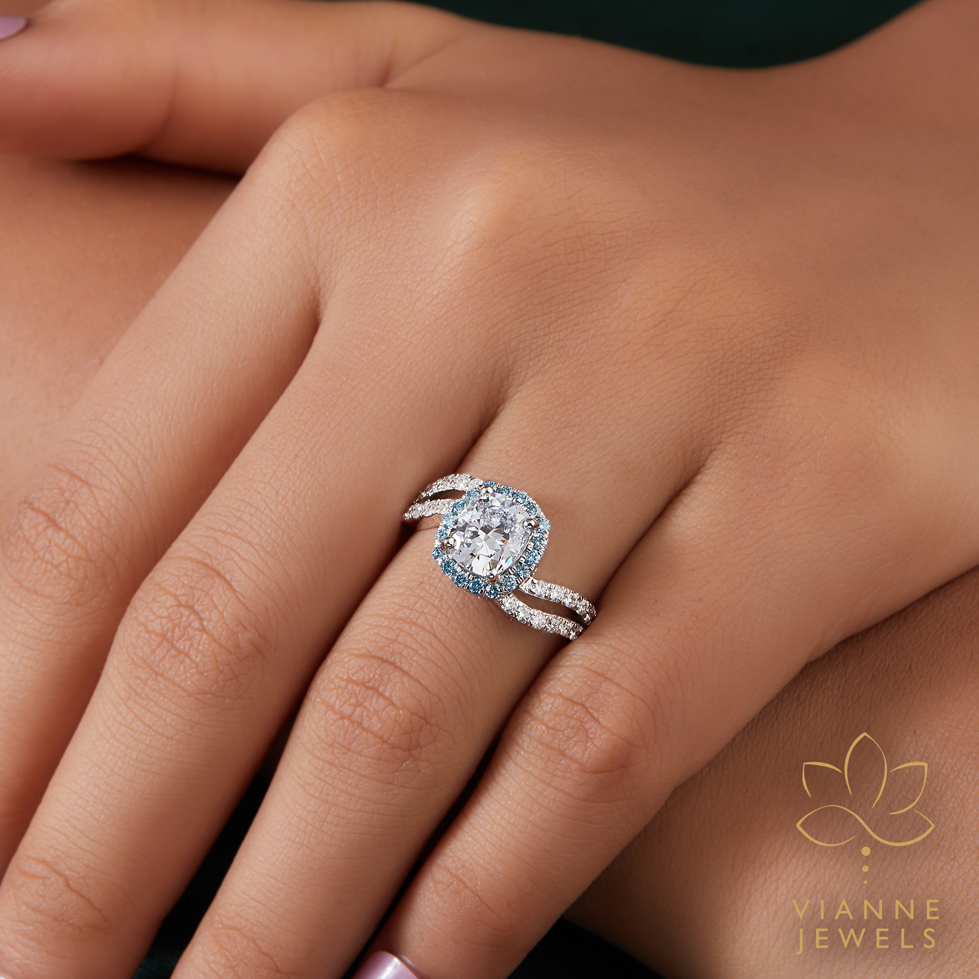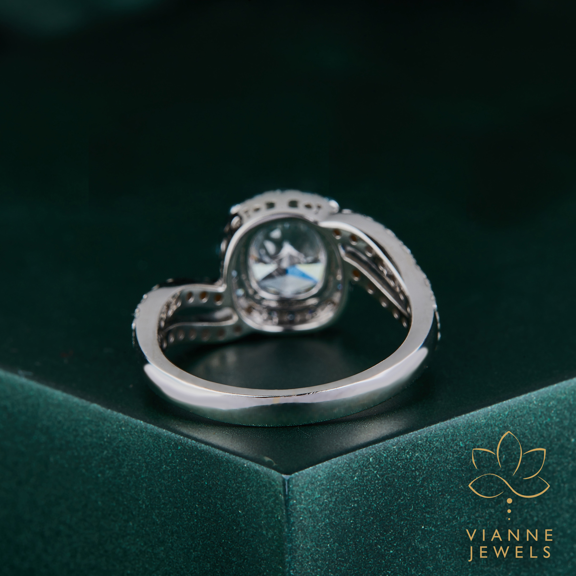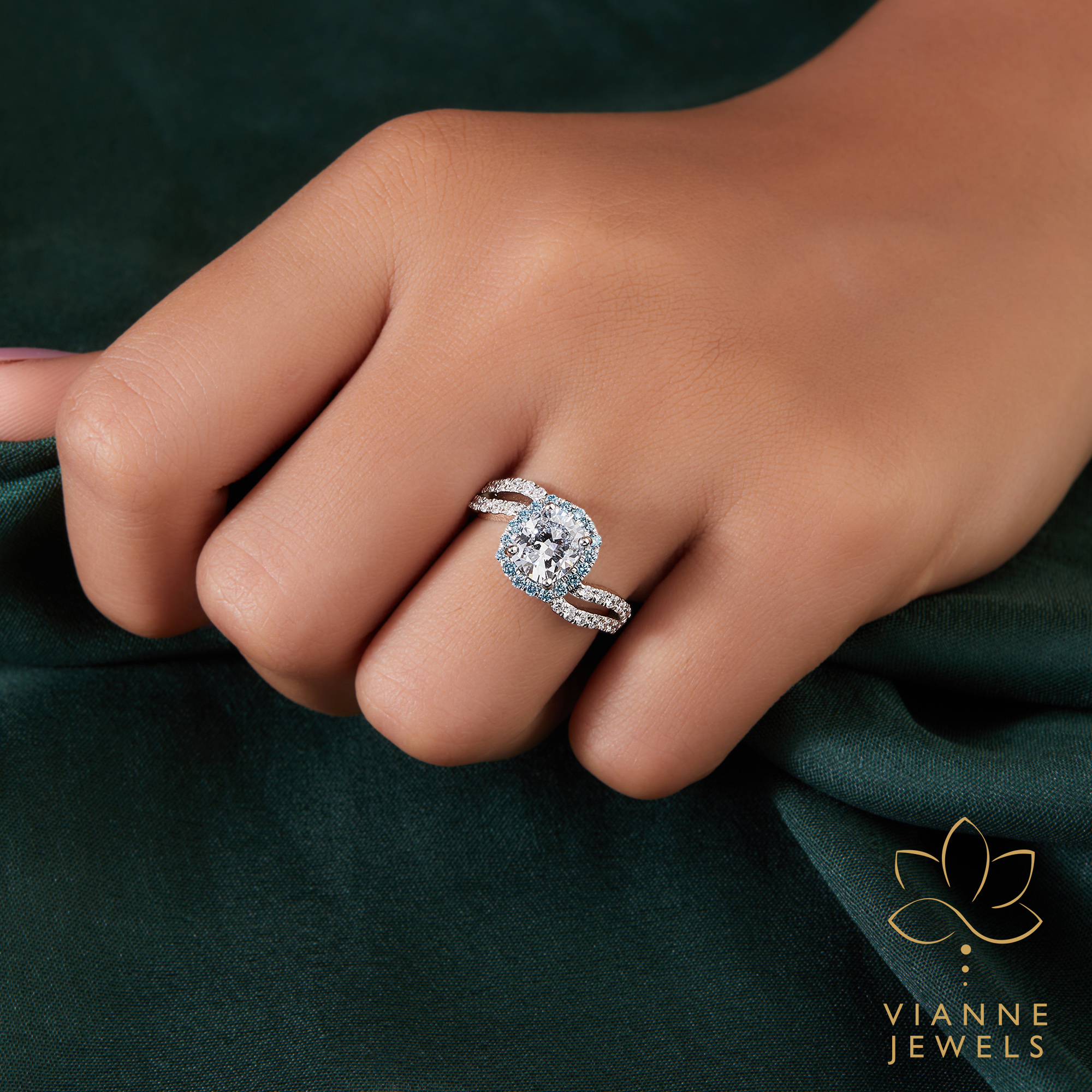 This ring is not just an accessory; it’s a statement. Perfect for an engagement, a milestone celebration, or simply as a testament to one’s personal style, the ‘Celestial Ice’ Cushion-Cut Diamond Ring with Blue Halo is a piece that will be cherished for lifetimes to come. Embrace this stunning symbol of love, as enduring and infinite as the stars above.”
