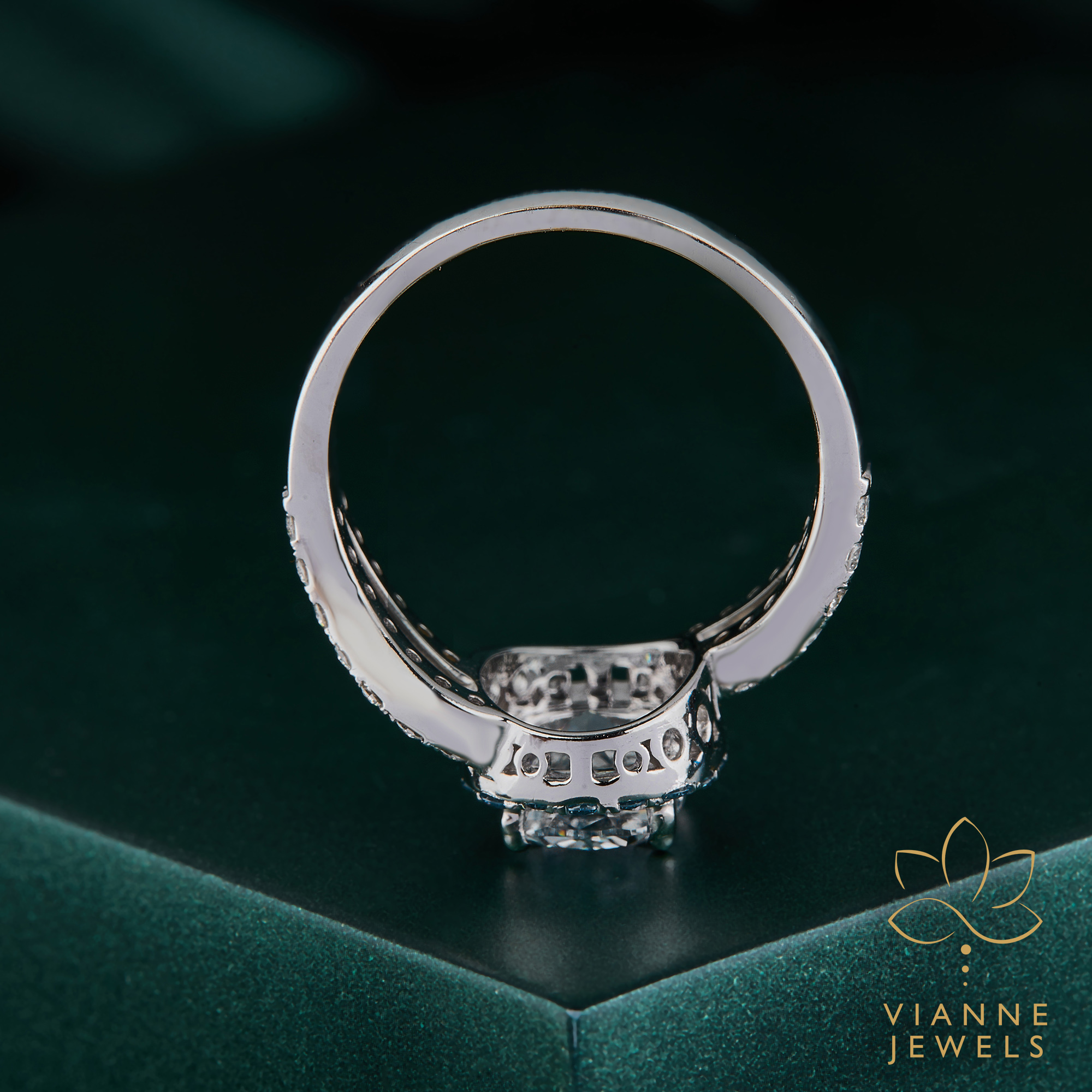 Lab-grown diamonds are the heart of this piece, providing an ethical and sustainable choice that does not compromise on the luxury expected of such a significant piece of jewelry. Each diamond is chosen for its clarity, color, and cut, ensuring that your ring will be an object of envy and admiration.