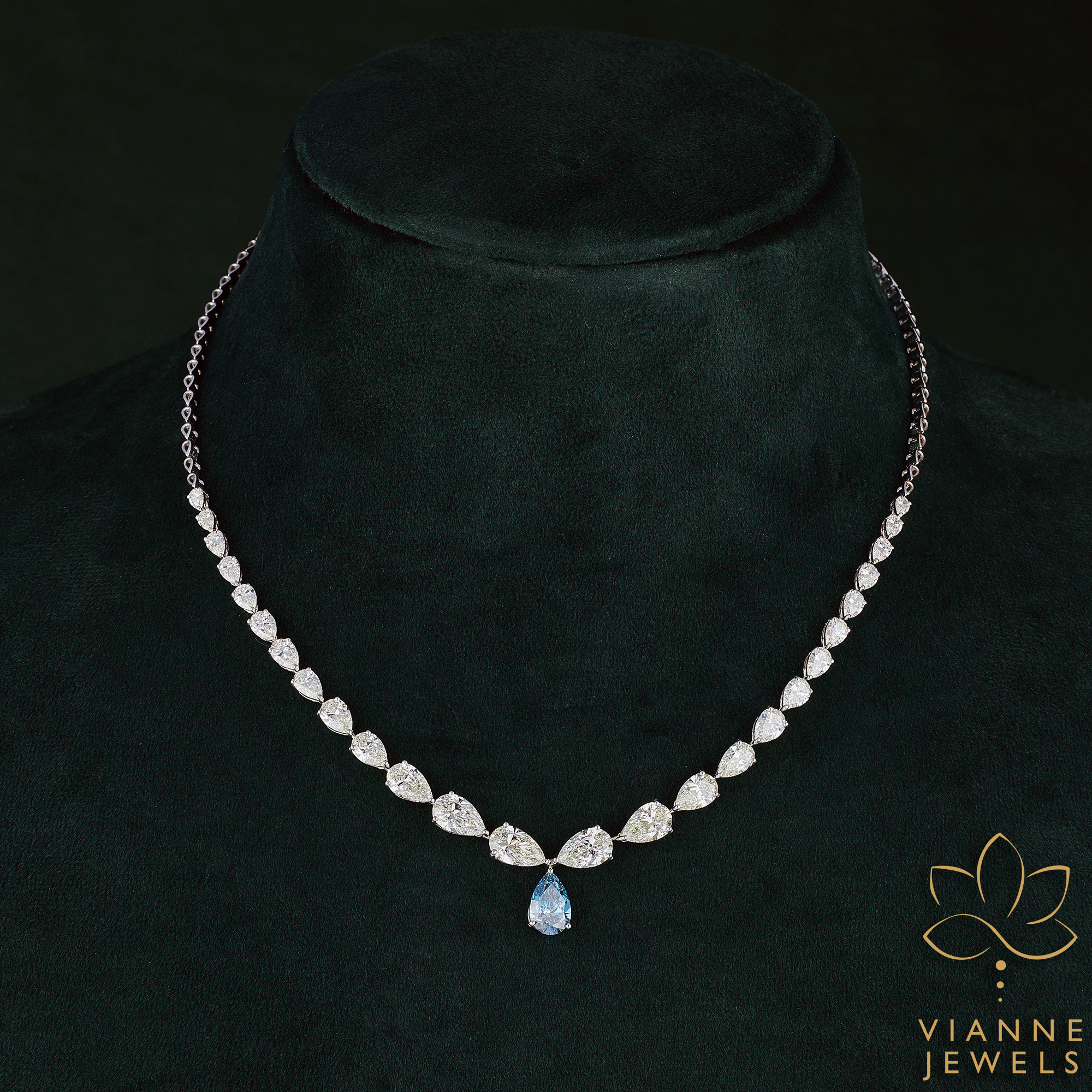 The lab-grown diamonds are arranged in a harmonious pattern that accentuates the neck’s natural curve, culminating in the blue gemstone’s poignant drop. These diamonds reflect a commitment to ethical luxury, offering all the sparkle and fire expected of the finest quality gems, while the sterling silver setting provides a timeless and durable elegance.