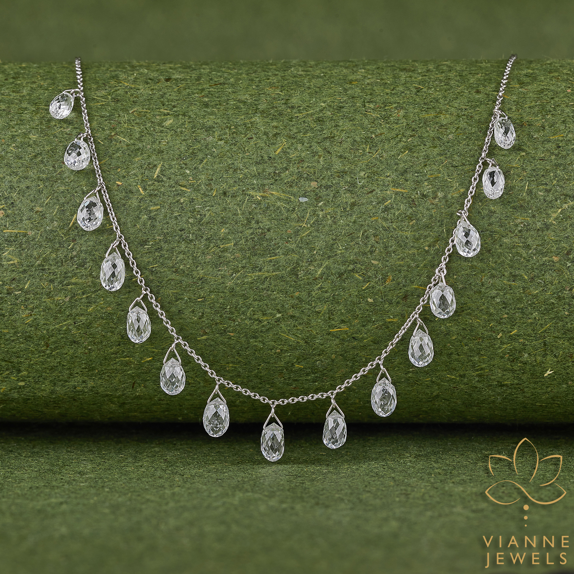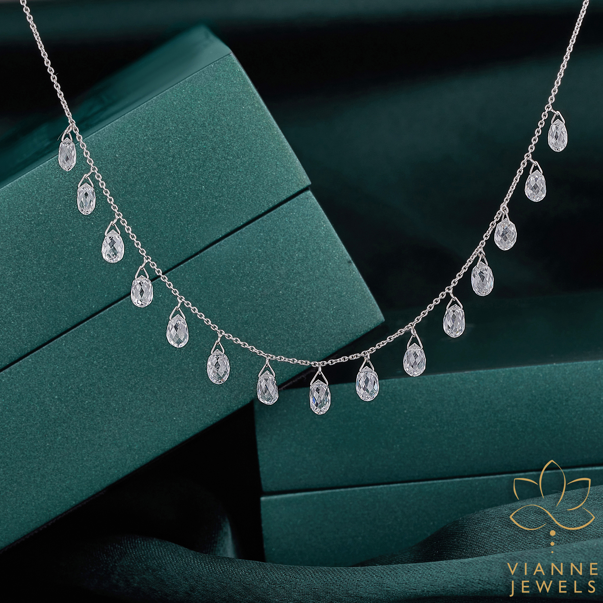 Inspired by the night sky’s serene beauty, “Celestial Teardrops” is a breathtaking necklace that gracefully adorns your neckline with a constellation of sparkling teardrops. Crafted with care from 14K white gold, this necklace features an array of lab-grown diamonds, each cut into a perfect teardrop to catch and reflect the light like a droplet of starlight. The lab-grown diamonds ensure that your piece is not only environmentally responsible but also shines with the fire and brilliance of the finest natural diamonds. Suspended in a delicate waterfall arrangement, the diamonds create a harmonious symphony of light, bringing an element of sophisticated glamour to any look. This necklace is an exquisite choice for those who seek to combine sustainable luxury with a touch of the ethereal. It’s an ideal gift for marking life’s special moments or simply celebrating the everyday beauty that surrounds us. “Celestial Teardrops” is more than a piece of jewelry; it’s a wearable piece of the night sky.