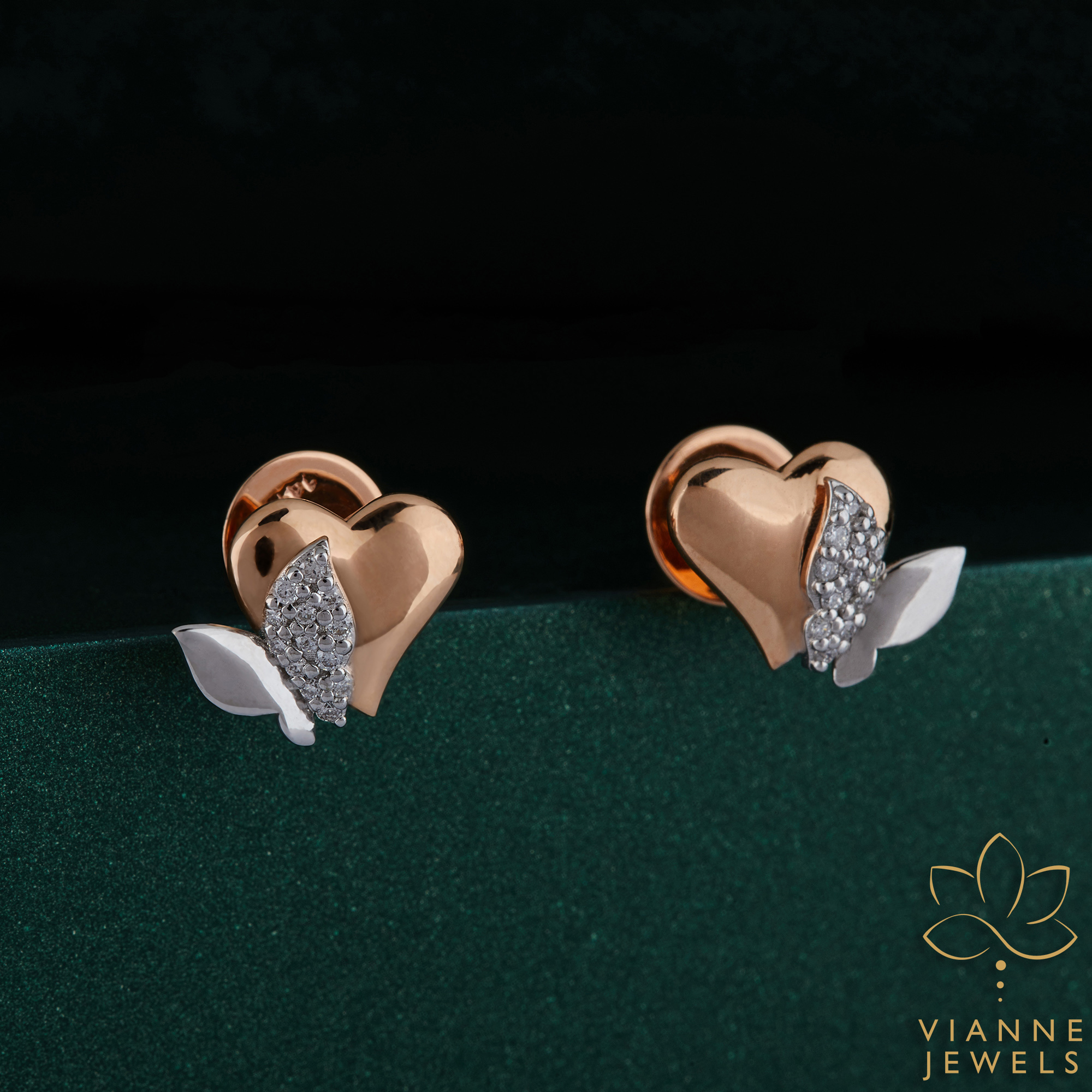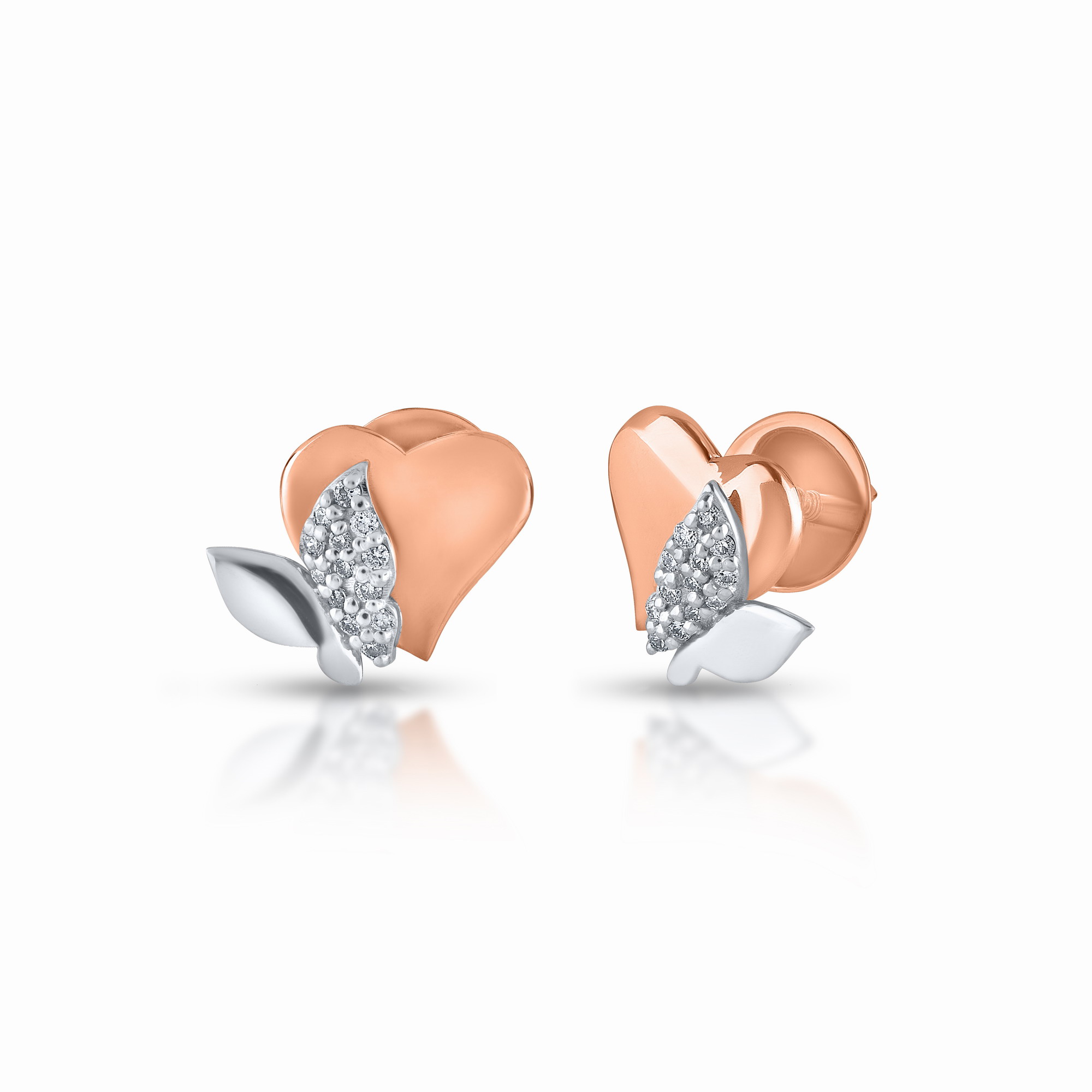 “Behold the subtle splendor of our Cherished Blossom Earrings, where the tenderness of rose gold meets the timeless twinkle of diamonds. These stud earrings are a symphony of affection, presenting a soft rose gold heart cradling a shimmering diamond petal. The contrasting metals harmonize to highlight the intricate detailing of the petal, reminiscent of a delicate bloom cradled within a loving embrace.
