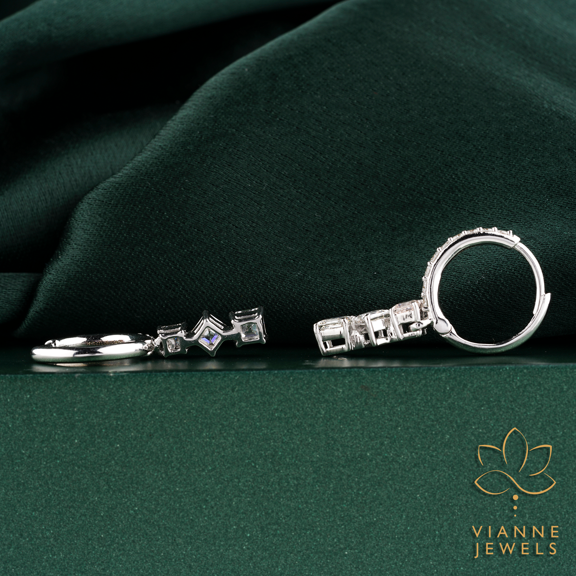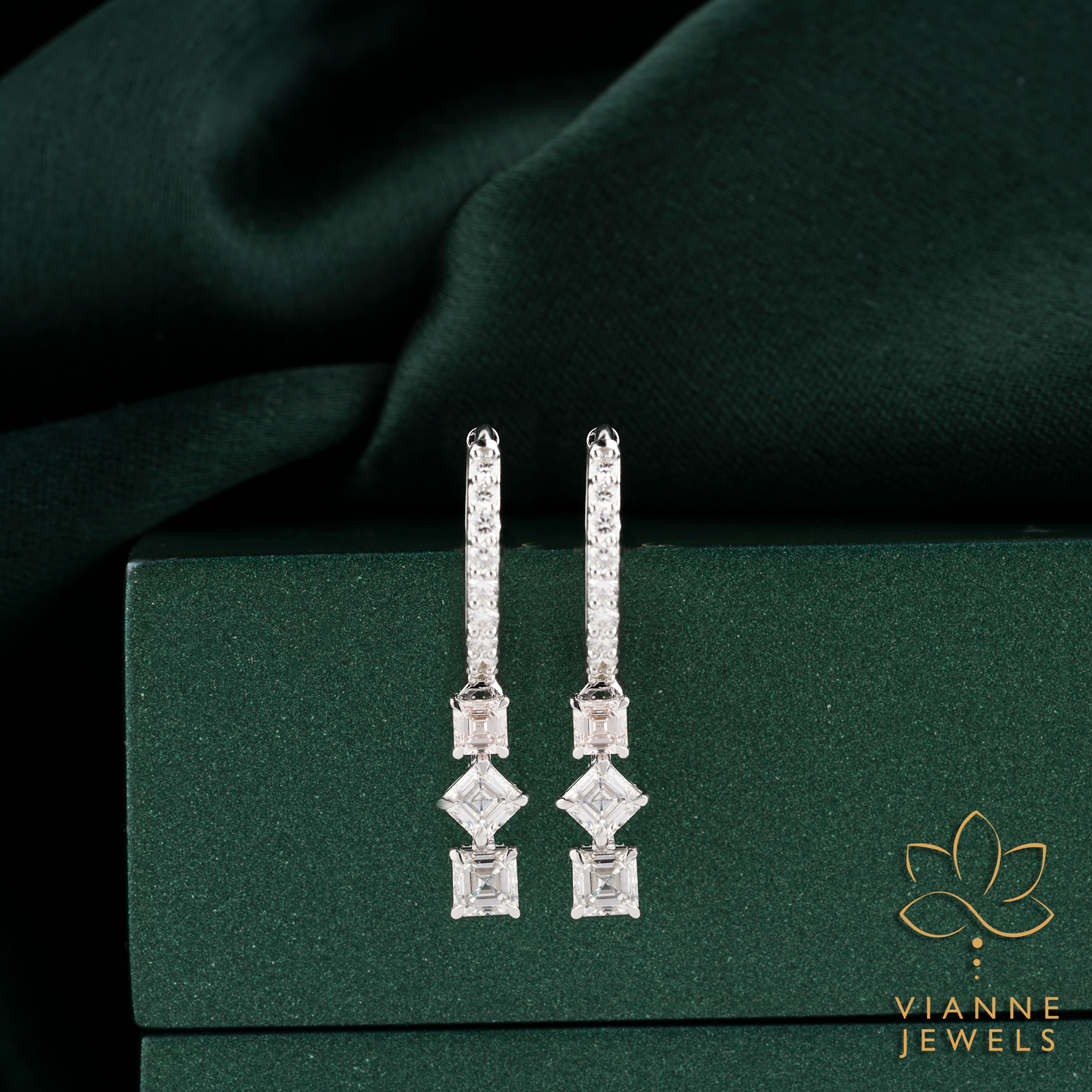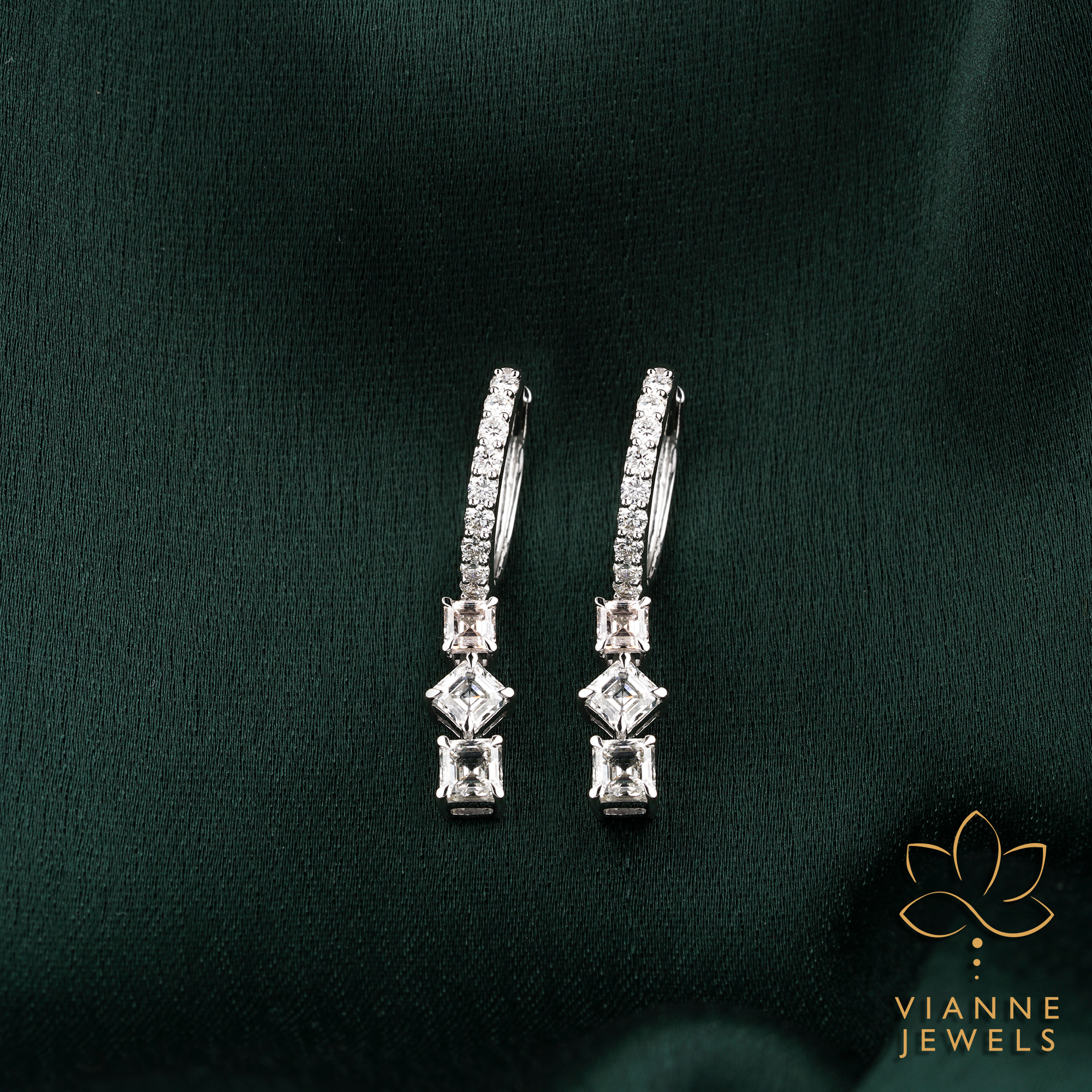 Each earring is composed of a series of lab-grown diamonds arranged in a linear drop, creating a sleek and elongated silhouette that draws the eye with its precision and sparkle. These diamonds are expertly cut to showcase their clarity and brilliance, mirroring the high standards of natural stones while promoting environmental responsibility.