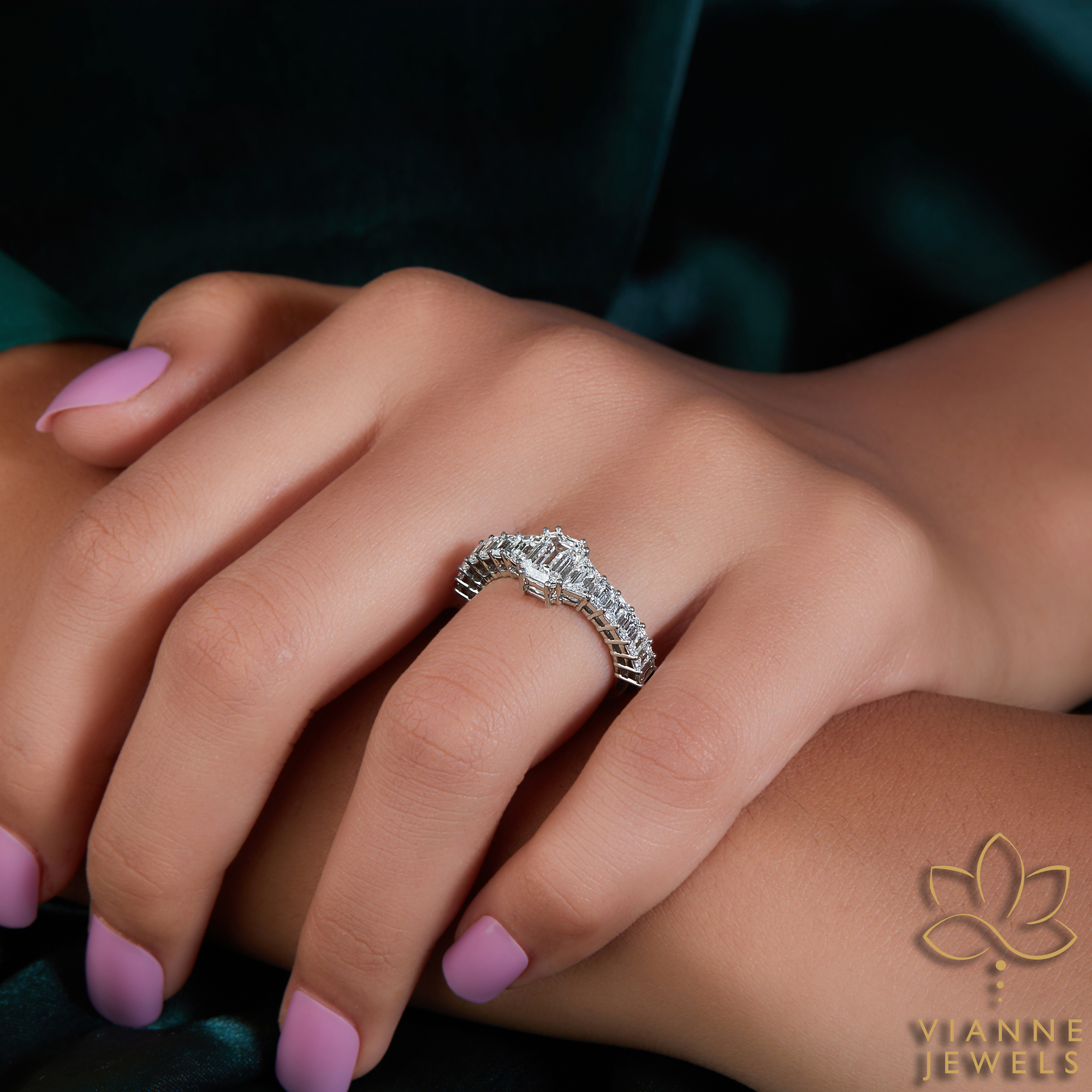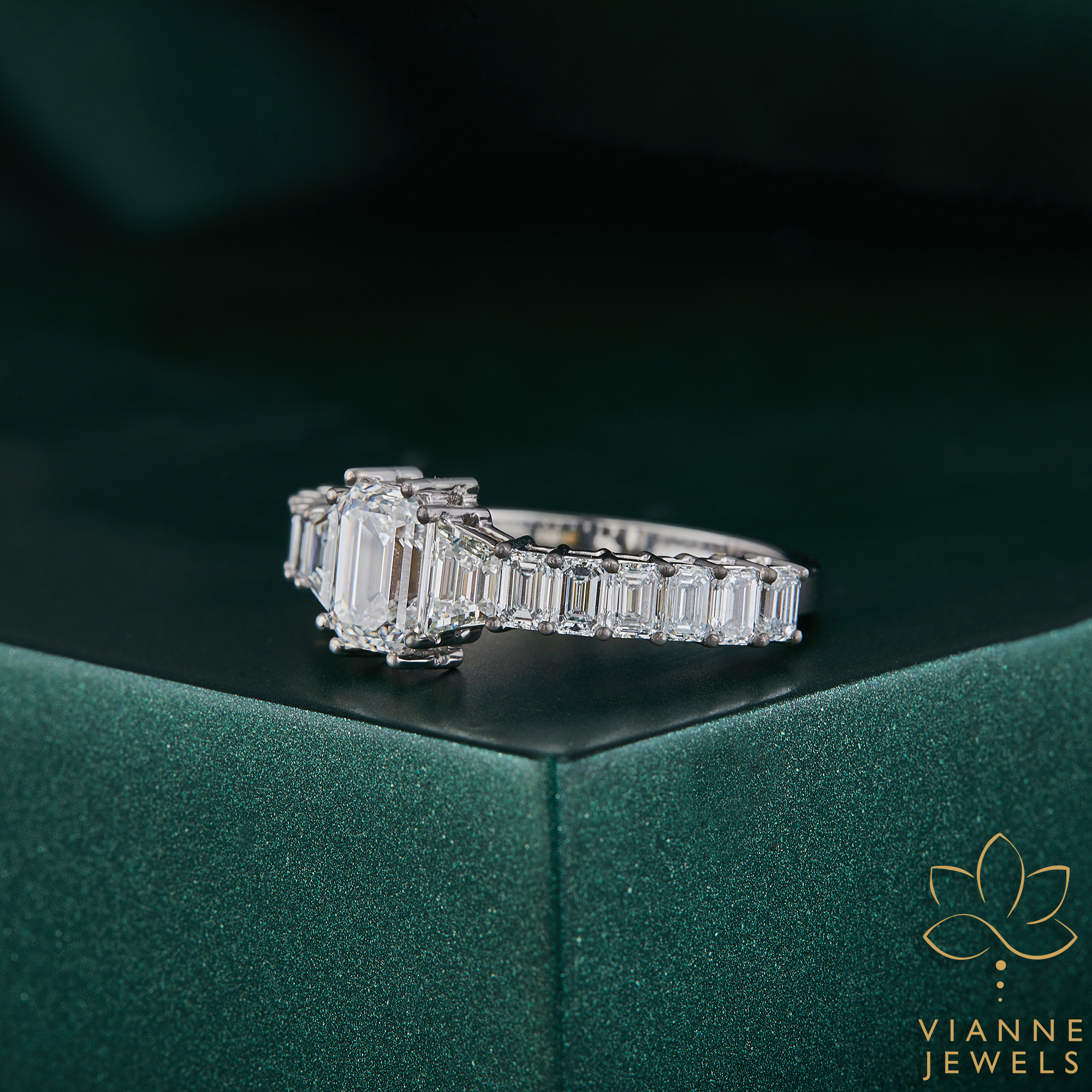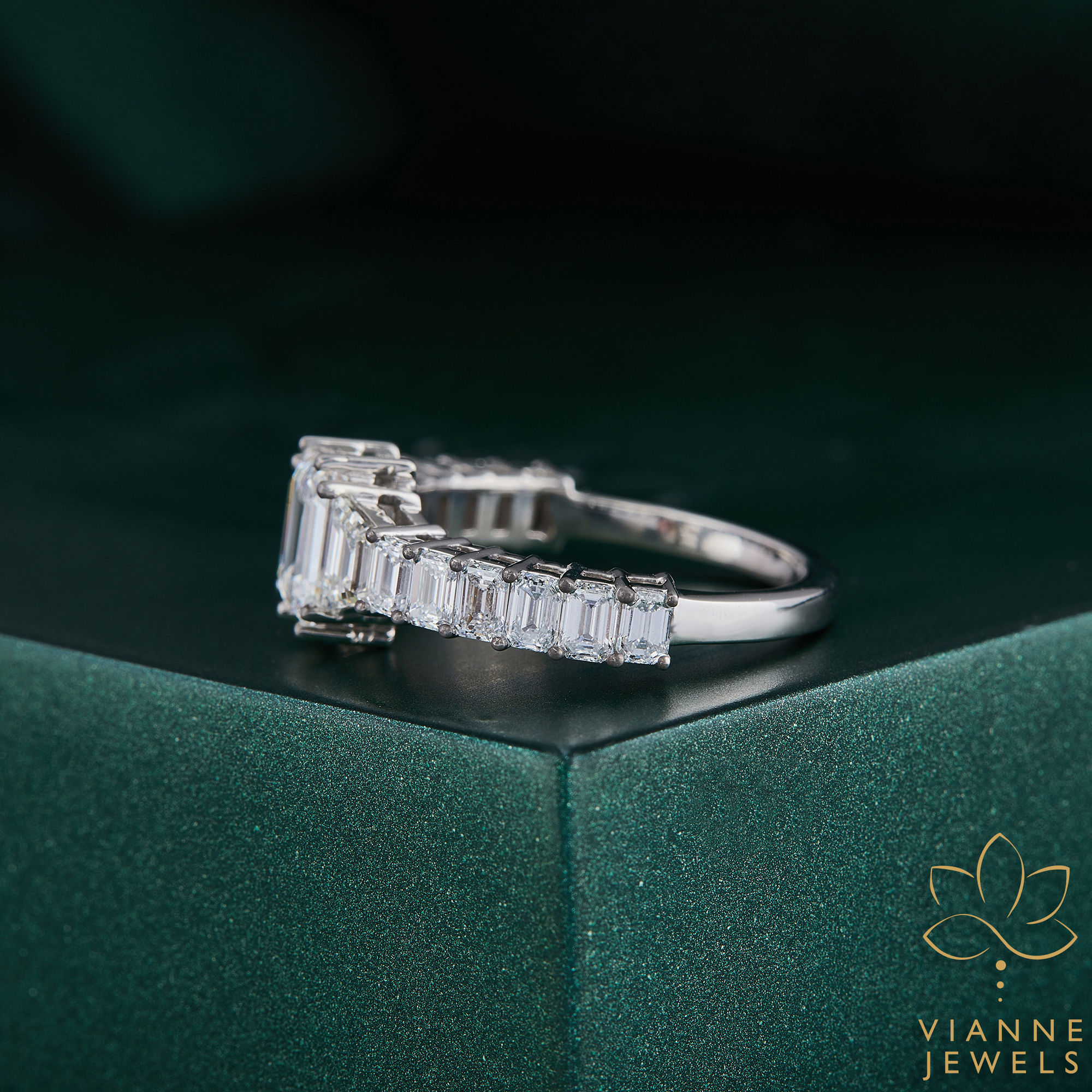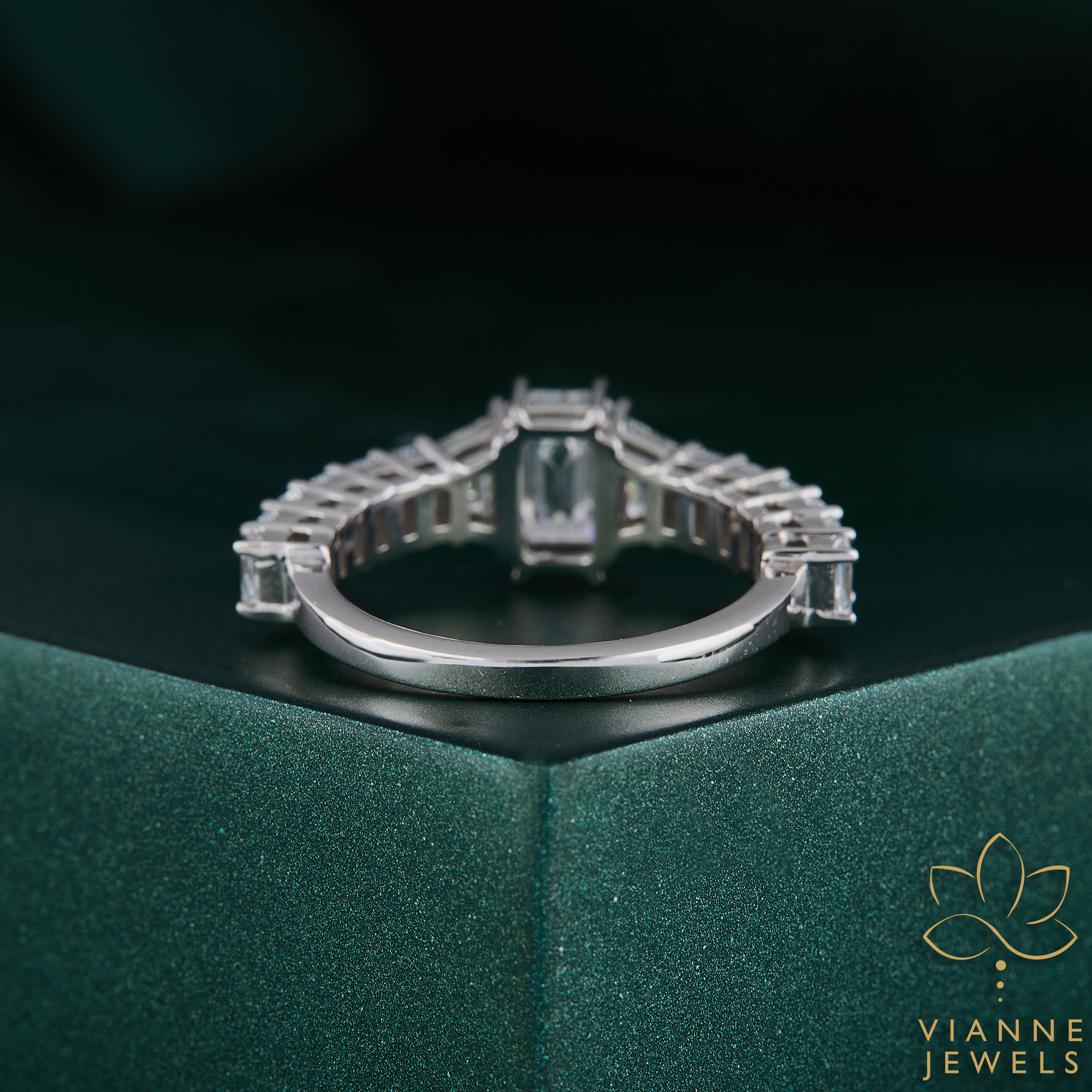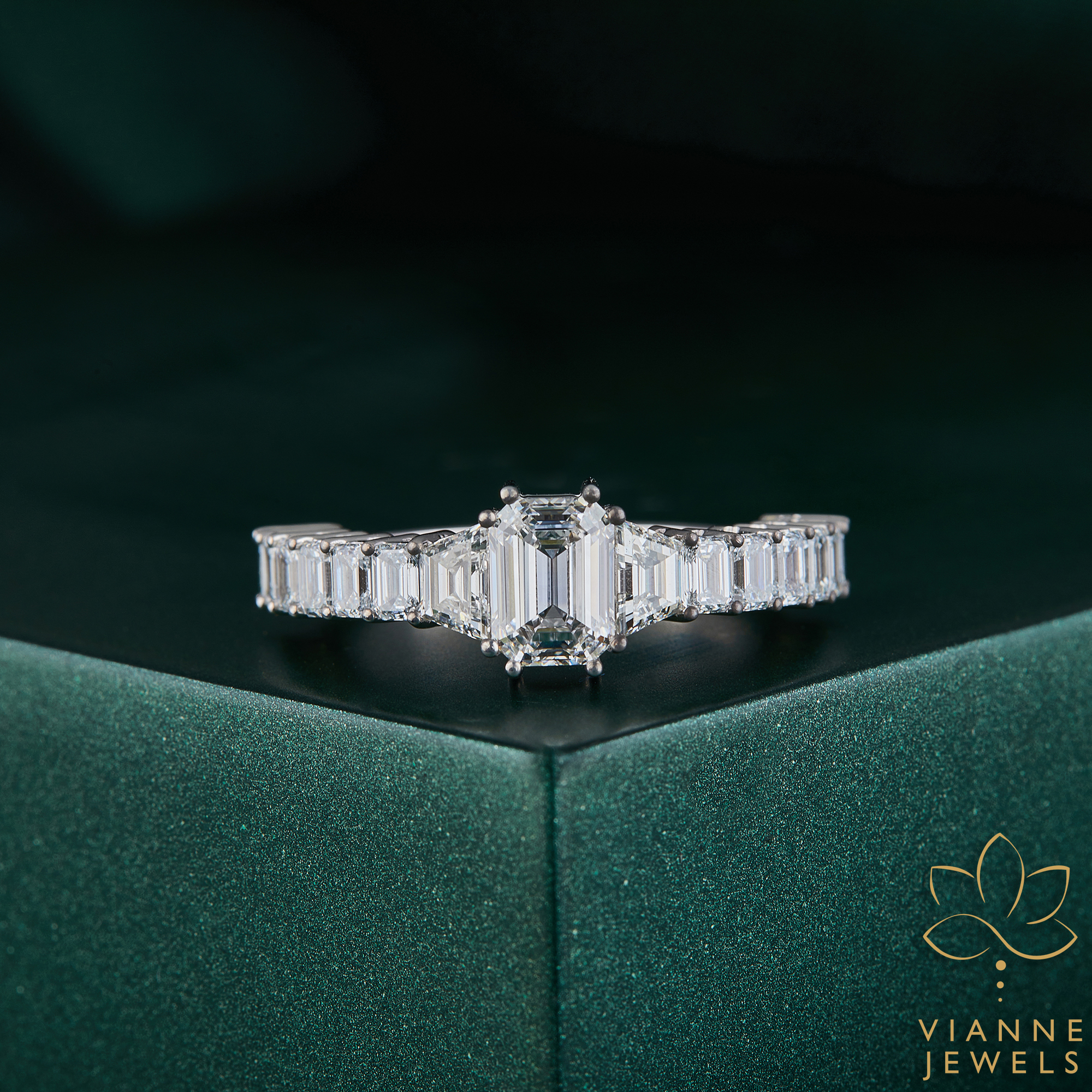 Each lab-grown gemstone in this ring has been selected for its exceptional quality and ethical sourcing, providing you with a symbol of love that’s not only beautiful but also kind to the Earth. The unique crown setting of the diamonds creates a silhouette that is both elegant and striking, ensuring that the ring stands out as a piece of wearable art.