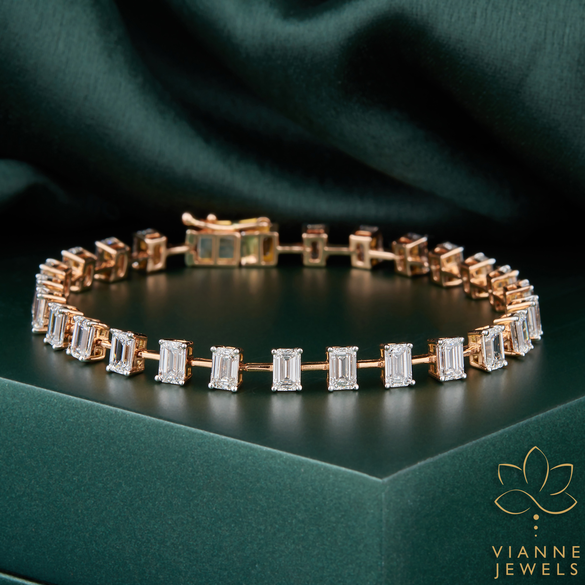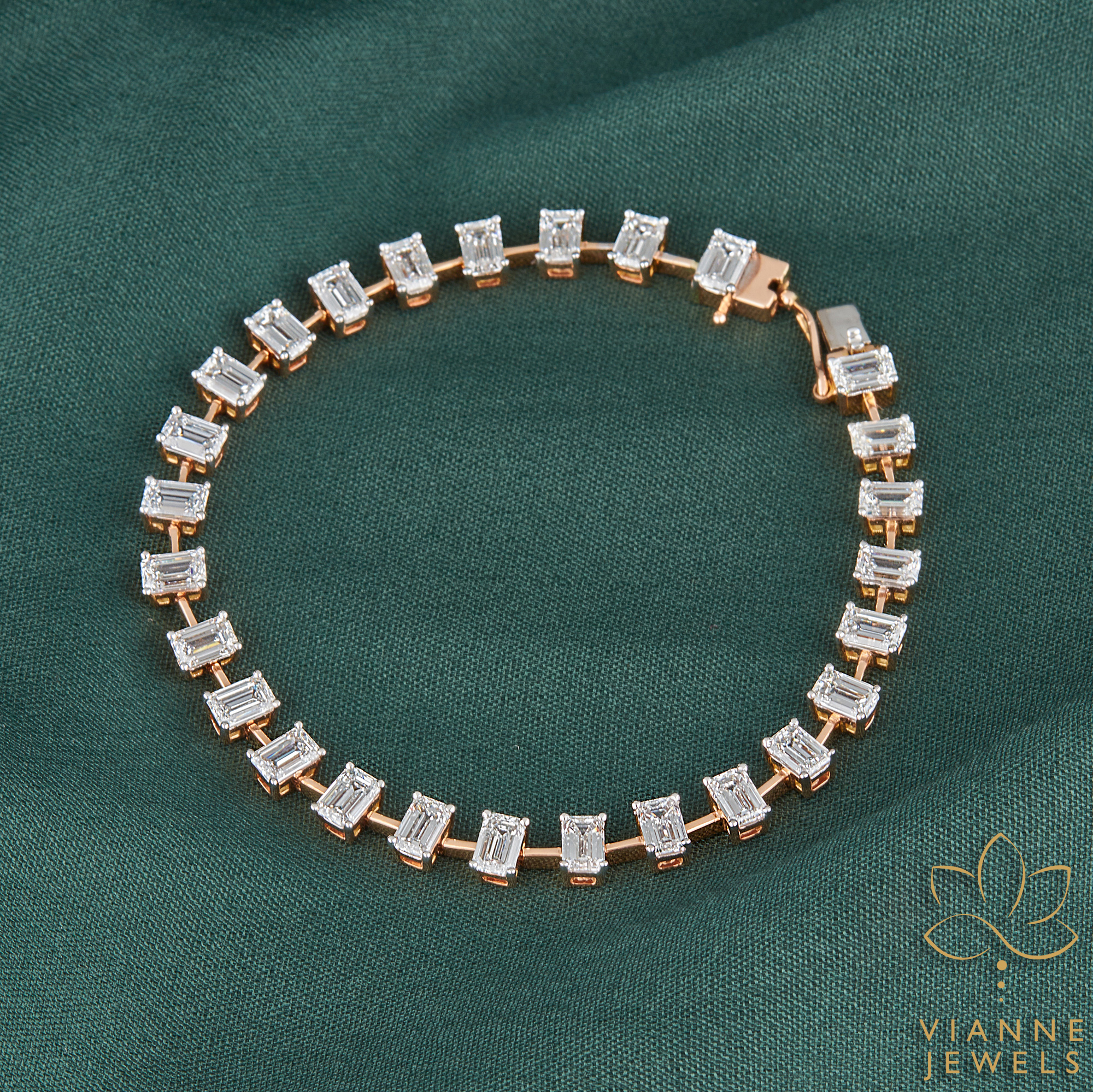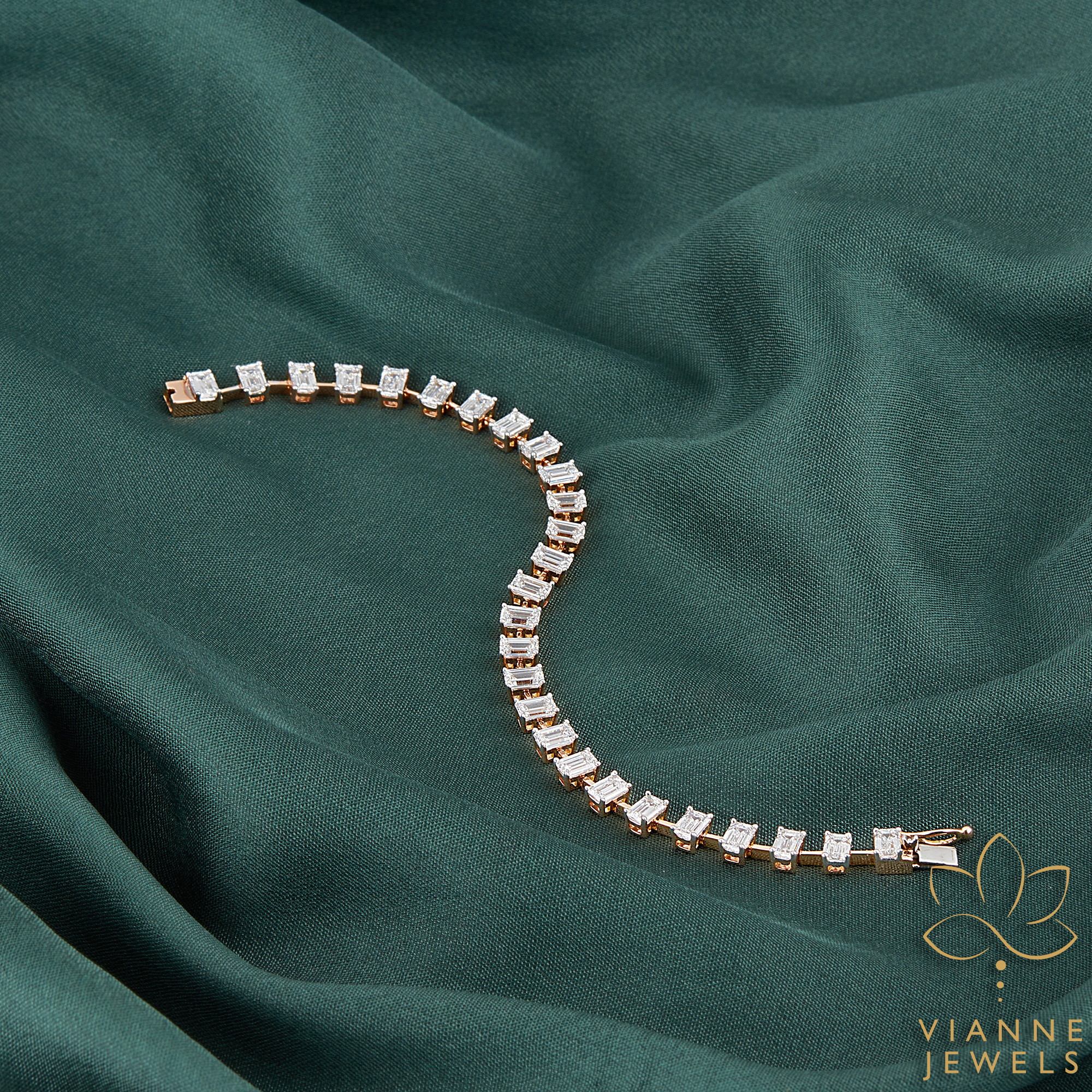 Introducing our ‘Copper Chic’ bracelet, a piece that captures the essence of art deco sophistication blended seamlessly with the values of the contemporary world. This bracelet features a succession of lab-grown diamonds, each encased in a stunning 14K rose gold setting that echoes the geometric lines and glamour of a bygone era.