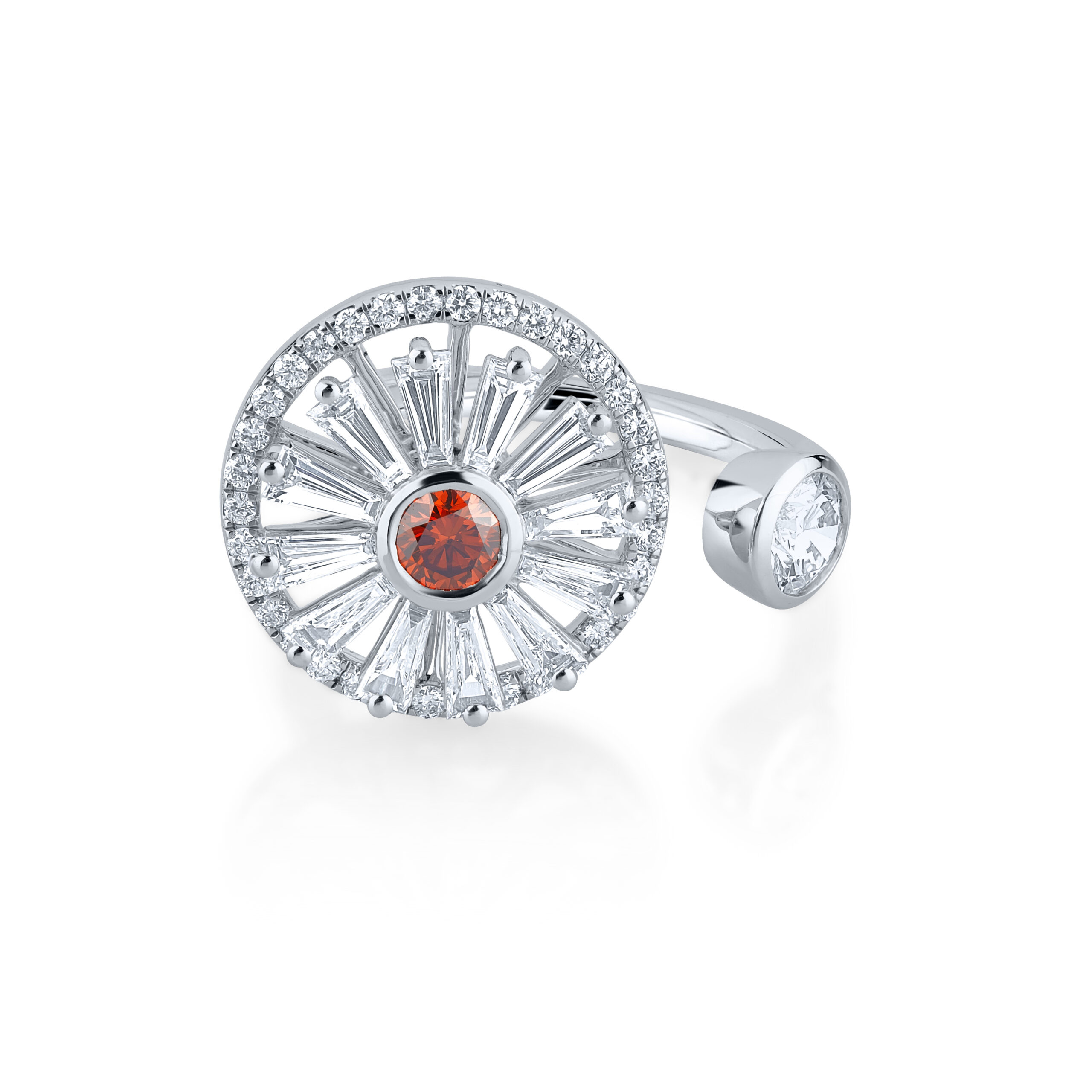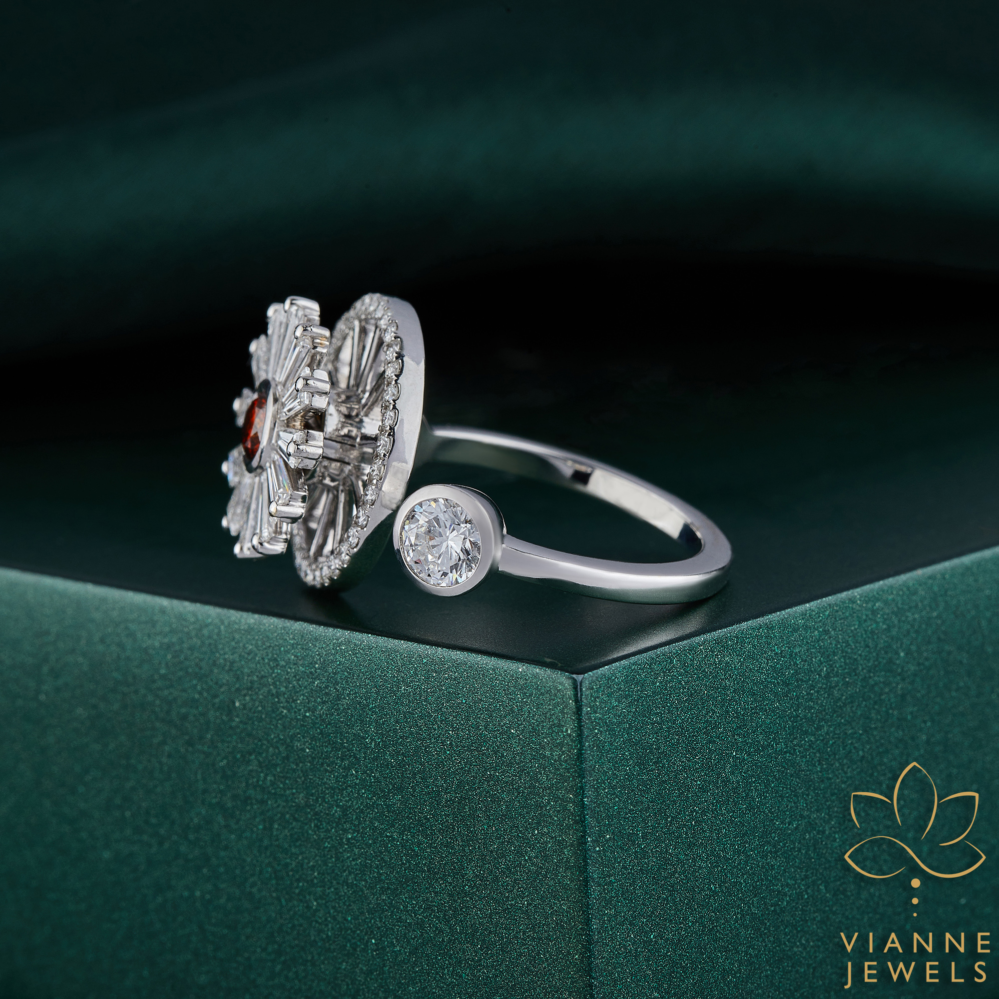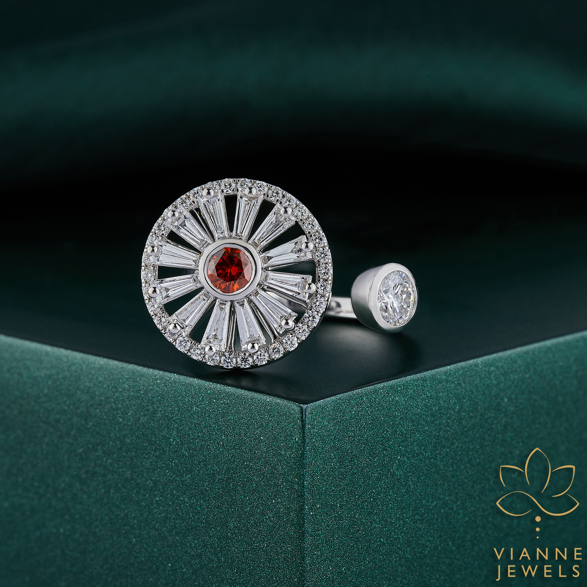 The ring is a celebration of innovation, with lab-grown diamonds offering an ethical and sustainable choice for the environmentally conscious individual. Whether worn as a statement piece or as a symbol of a new beginning, this Crimson Dawn Starburst Ring is sure to turn heads and ignite conversations.”