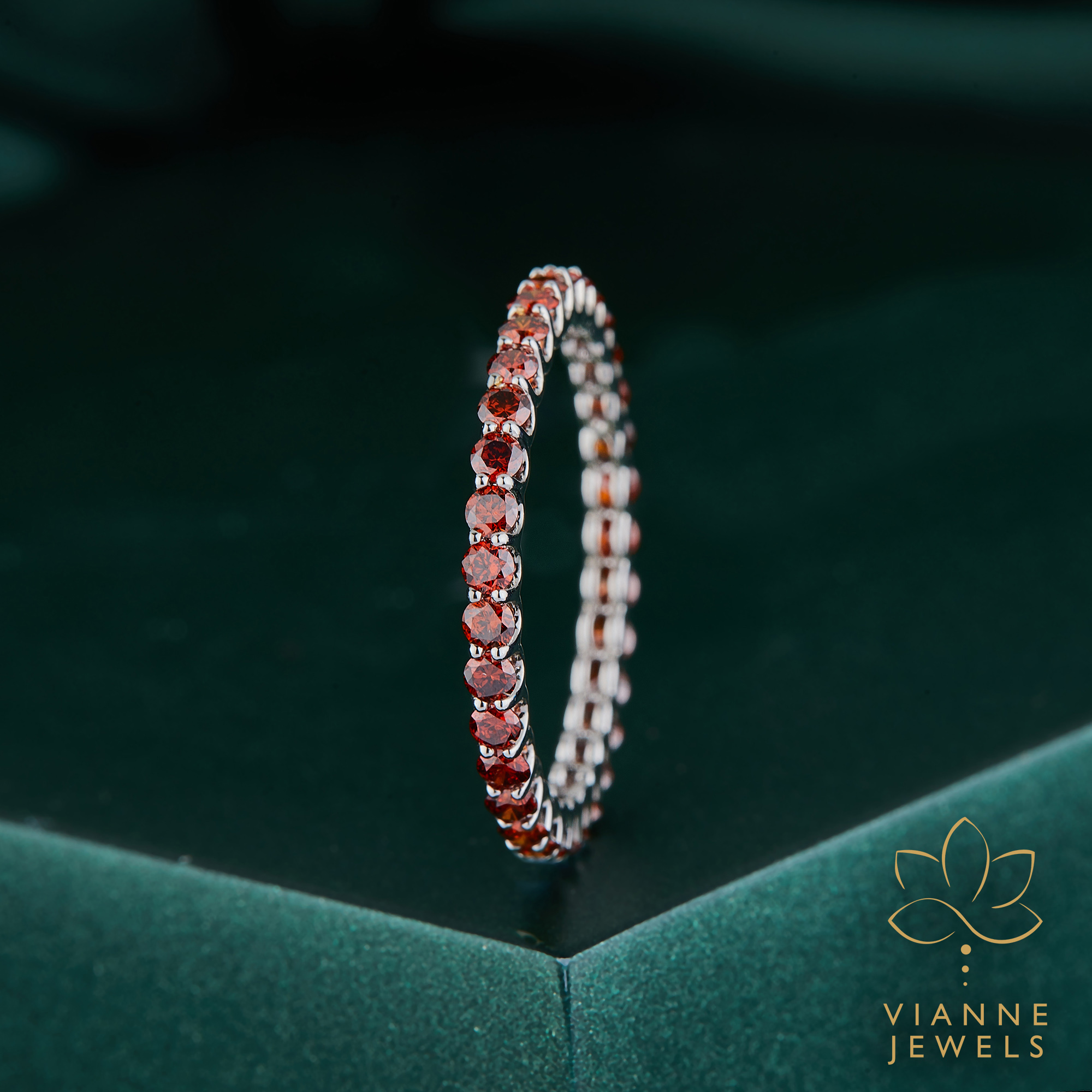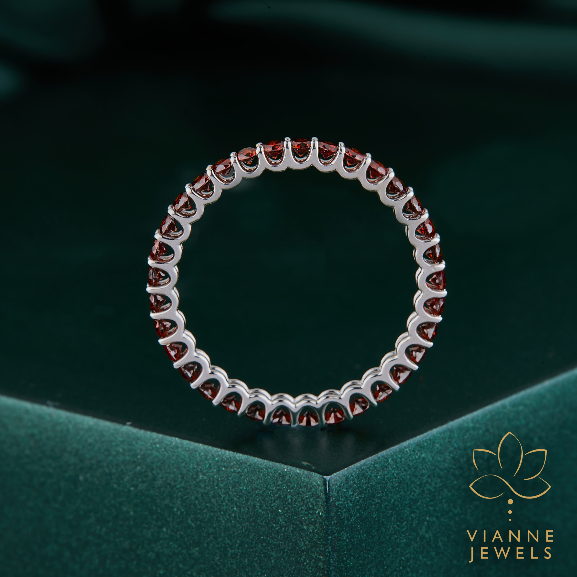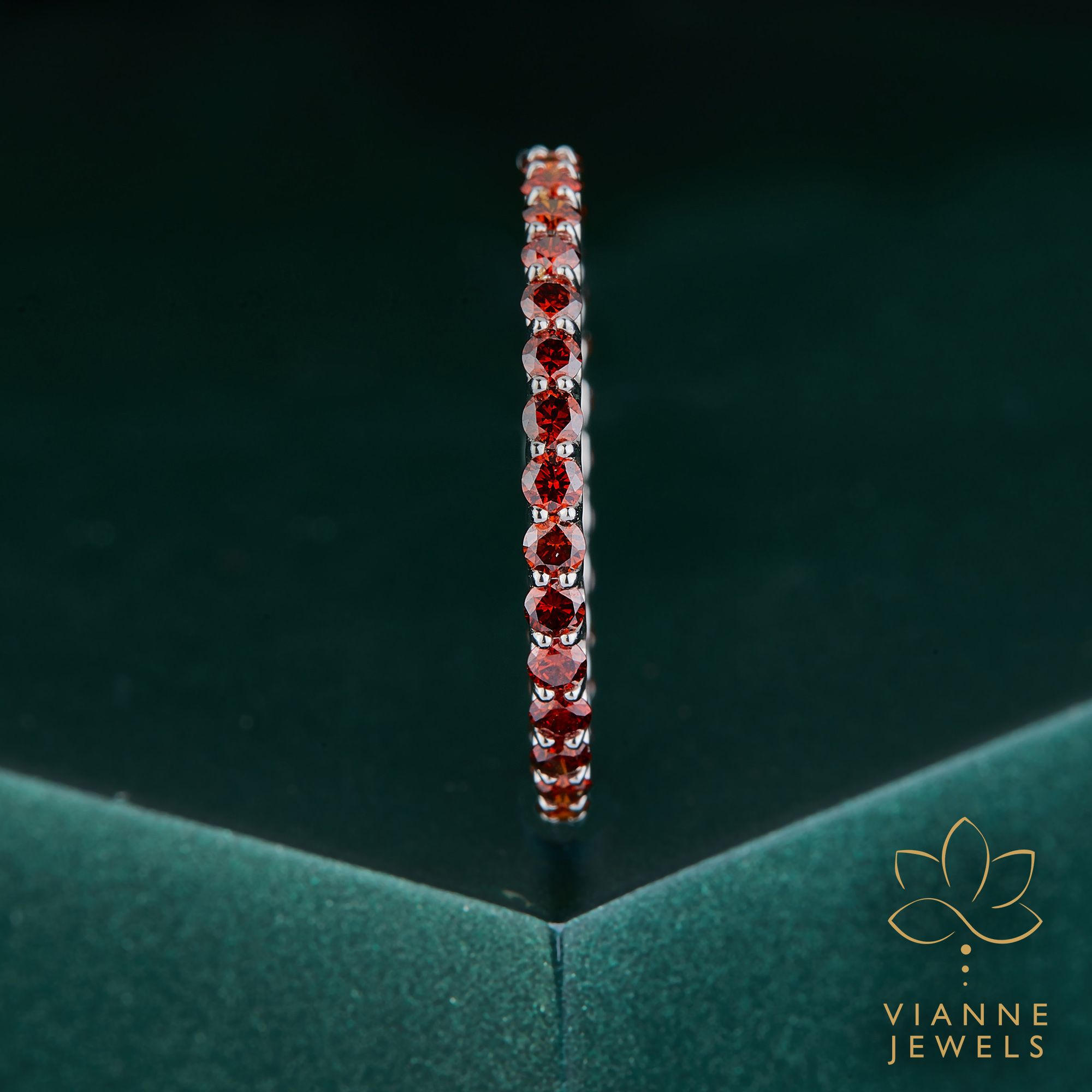 “Introducing the ‘Crimson Halo’ Eternity Band, a ring that wraps your finger in the warm embrace of love’s eternal flame. This elegant band is adorned with a full circle of lab-grown red diamonds, each one radiating with a deep, vibrant hue that symbolizes both love and vitality. The white gold setting enhances the rich color of the diamonds, creating a striking contrast that is both modern and timeless.