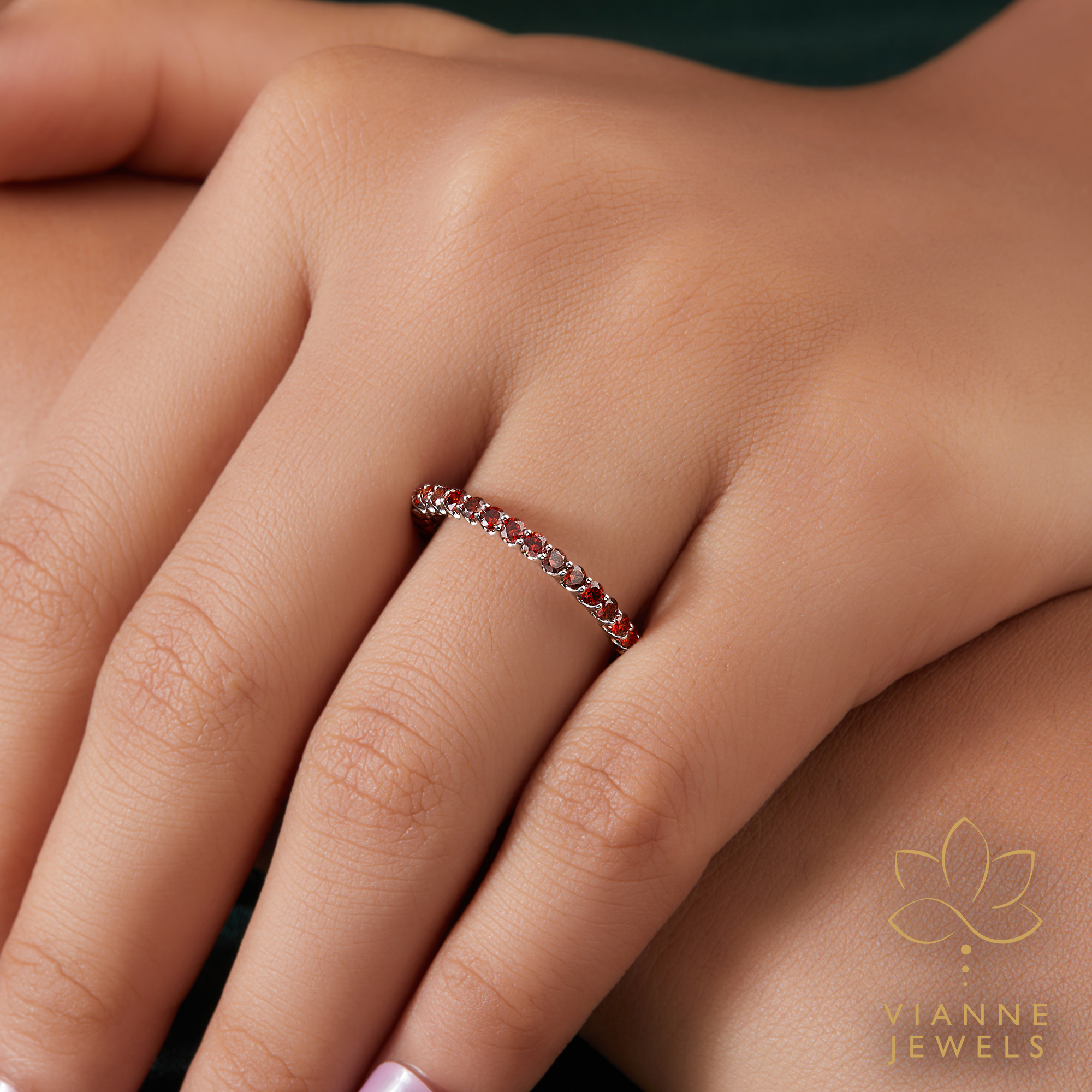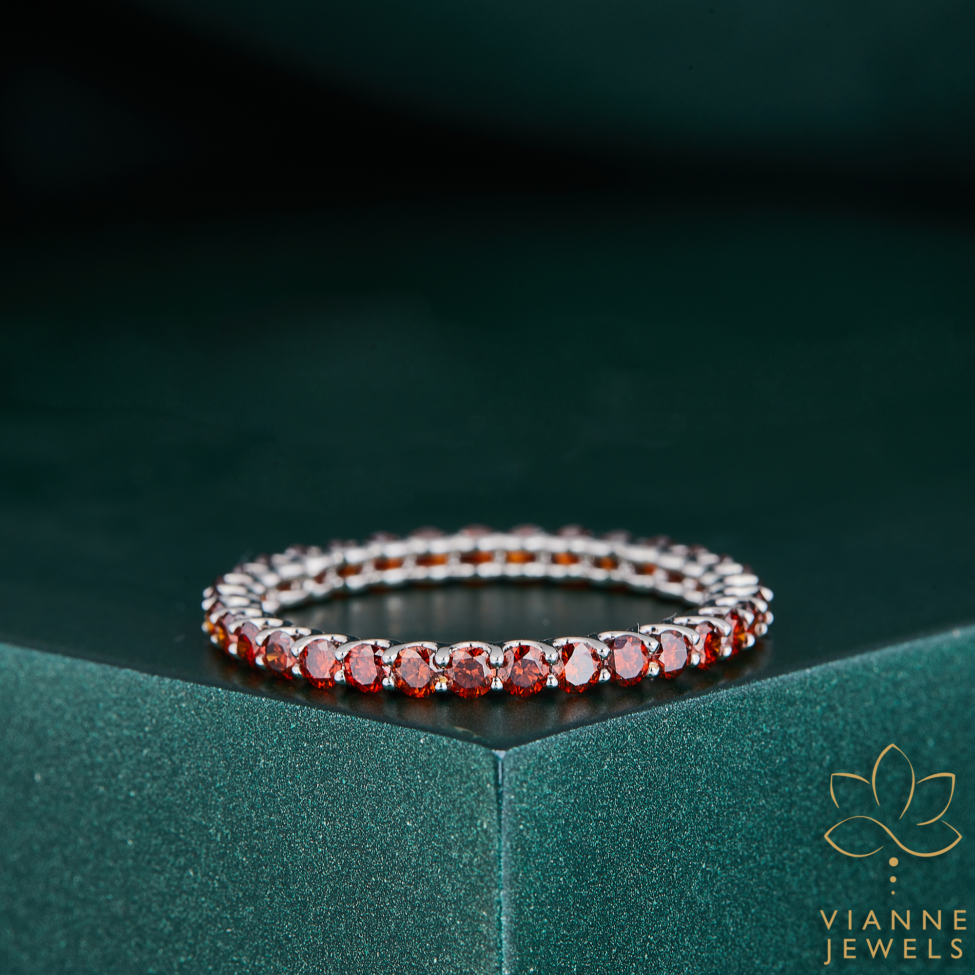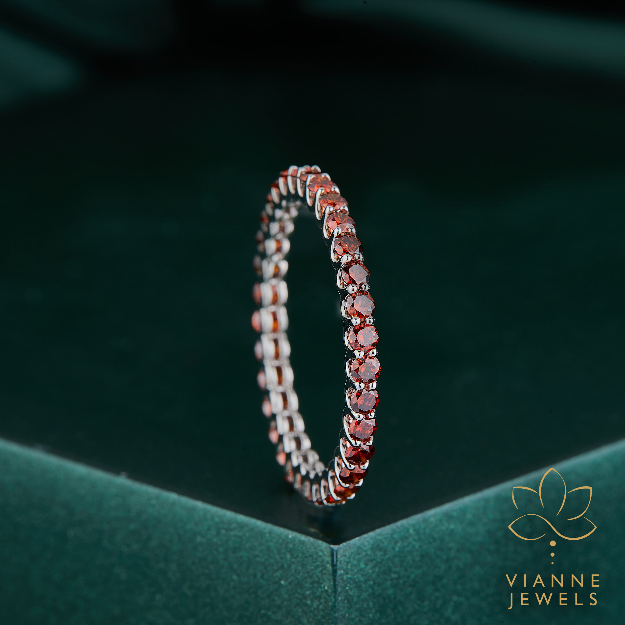 “Introducing the ‘Crimson Halo’ Eternity Band, a ring that wraps your finger in the warm embrace of love’s eternal flame. This elegant band is adorned with a full circle of lab-grown red diamonds, each one radiating with a deep, vibrant hue that symbolizes both love and vitality. The white gold setting enhances the rich color of the diamonds, creating a striking contrast that is both modern and timeless.