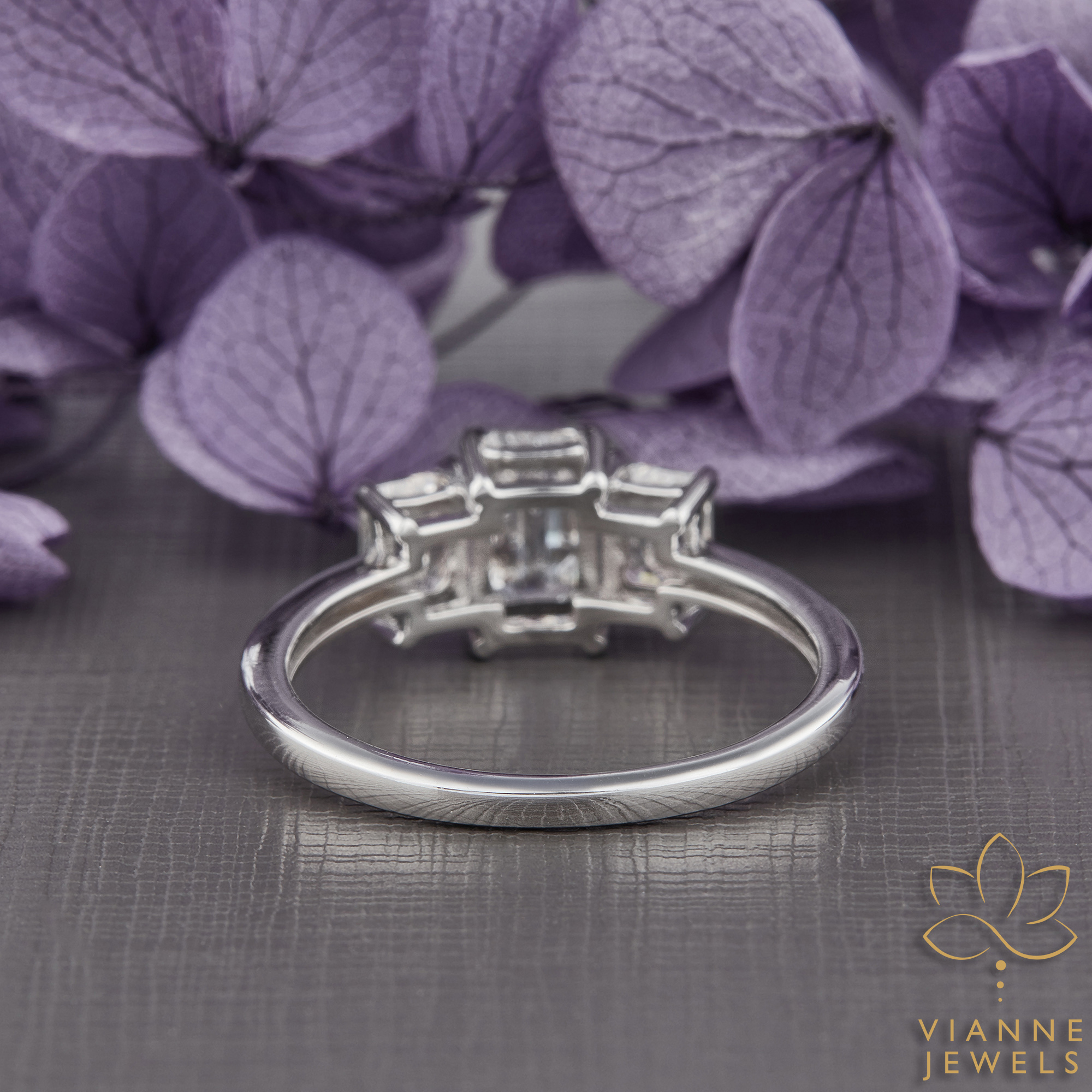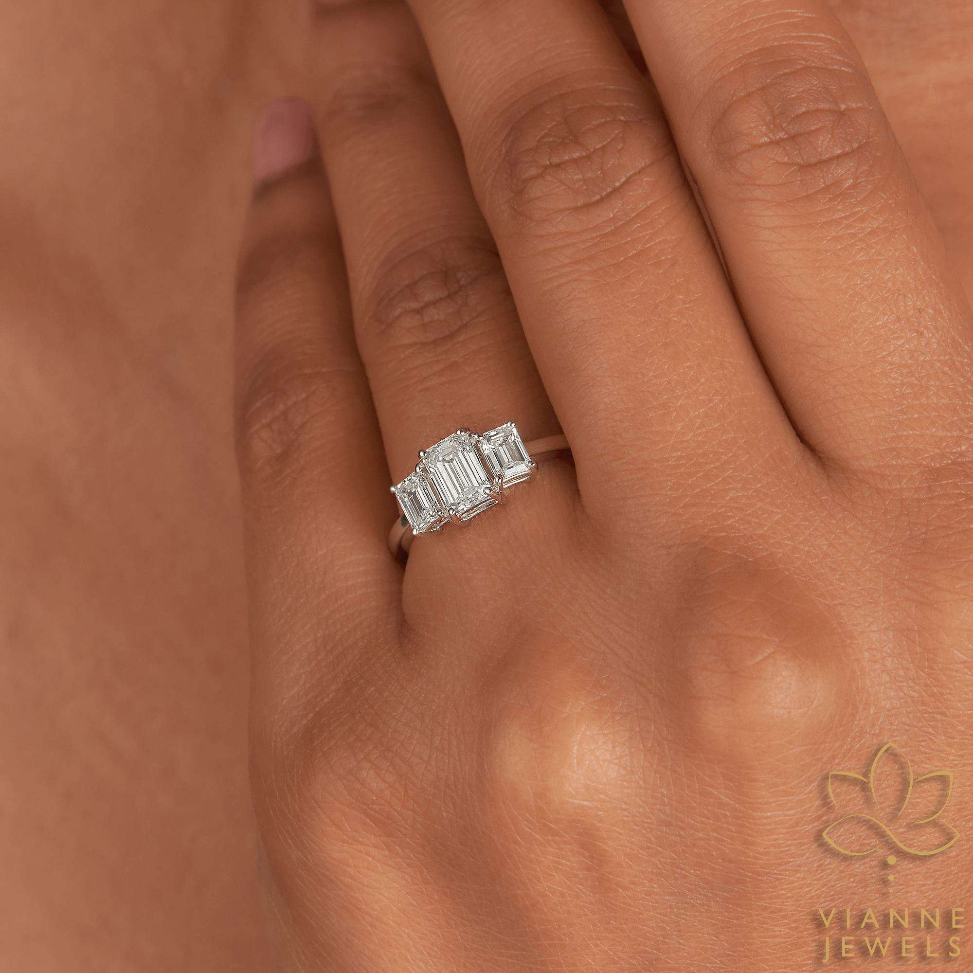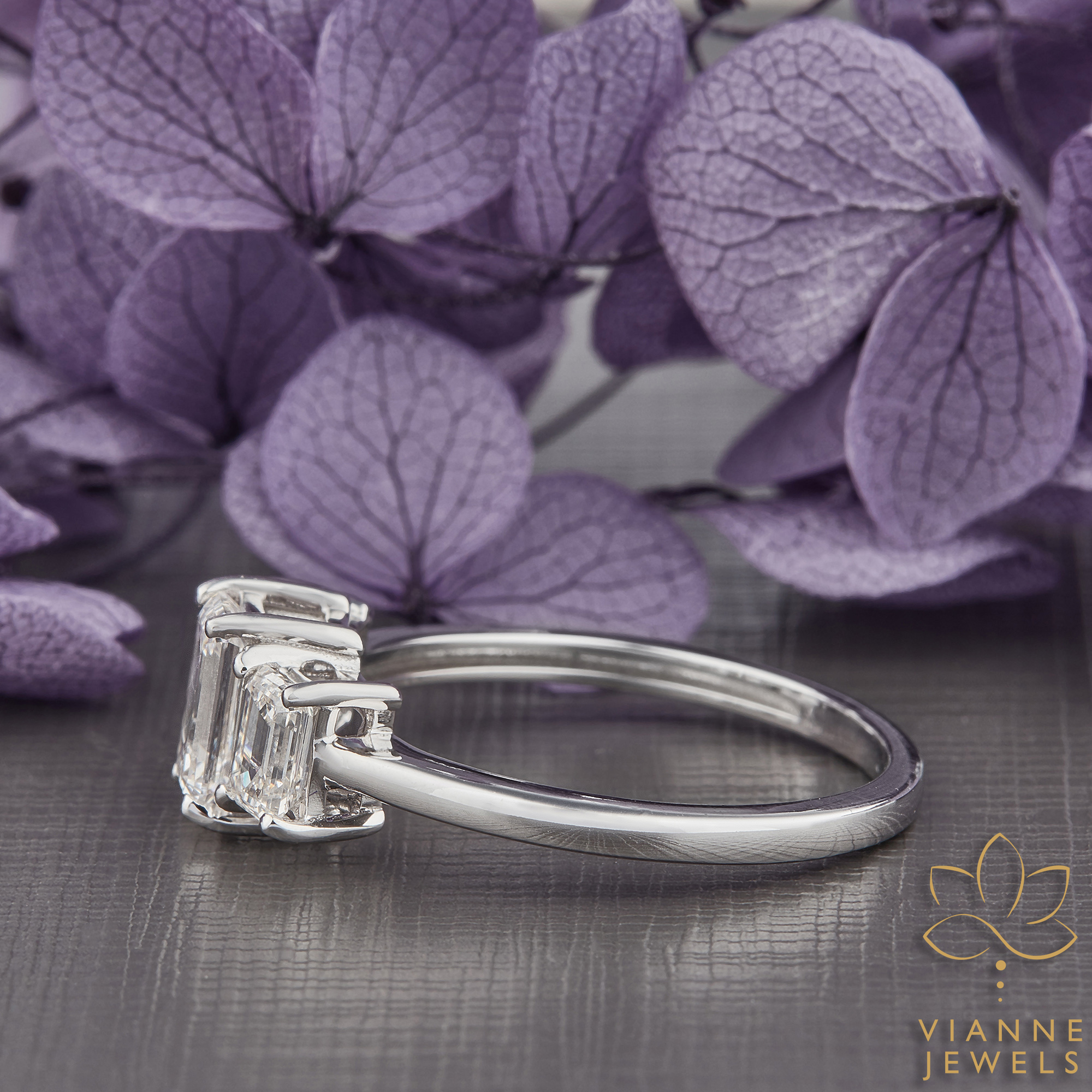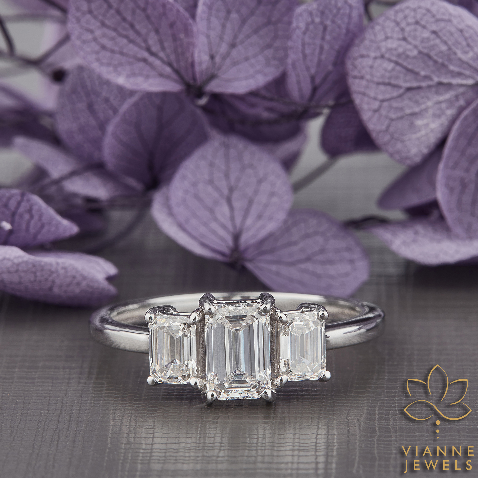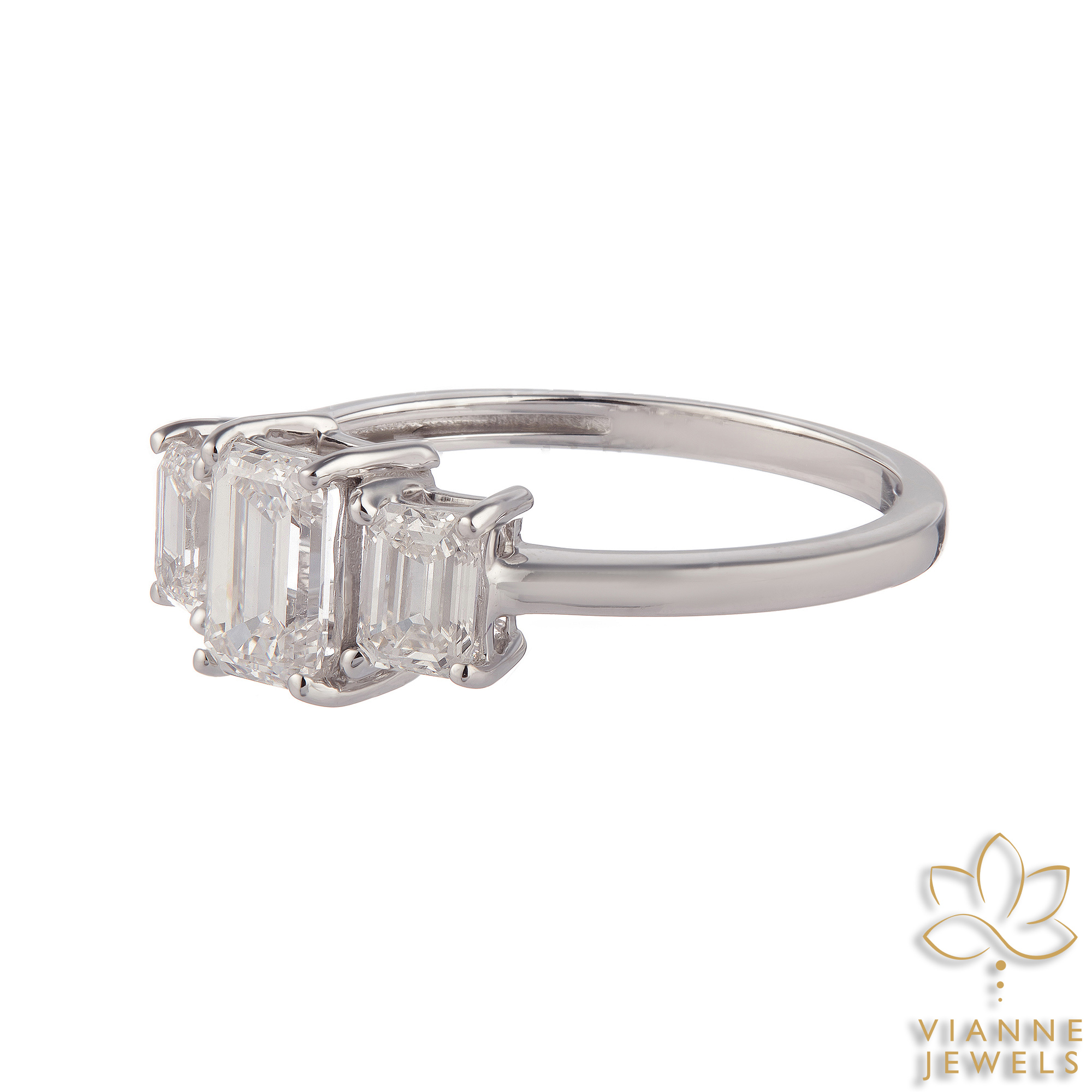 The Crisp Elegance Ring is a striking testament to the beauty of simplicity and the advancements of modern gemology. This piece features three emerald-cut lab-grown diamonds in a linear array, their hall-of-mirrors effect offering a display of understated, refined sparkle. The central diamond is flanked by two equally pristine emerald-cut stones, creating a seamless flow of brilliance.