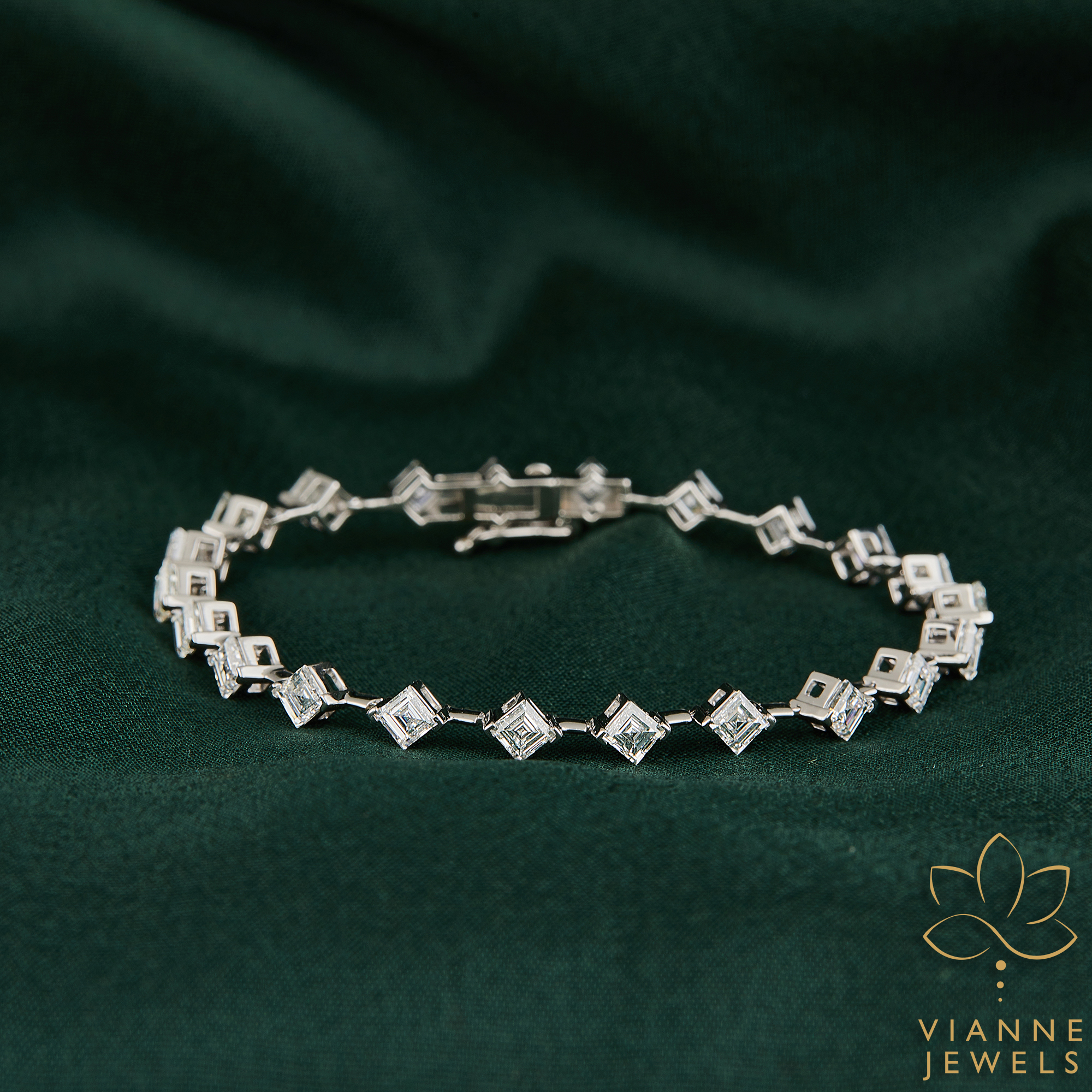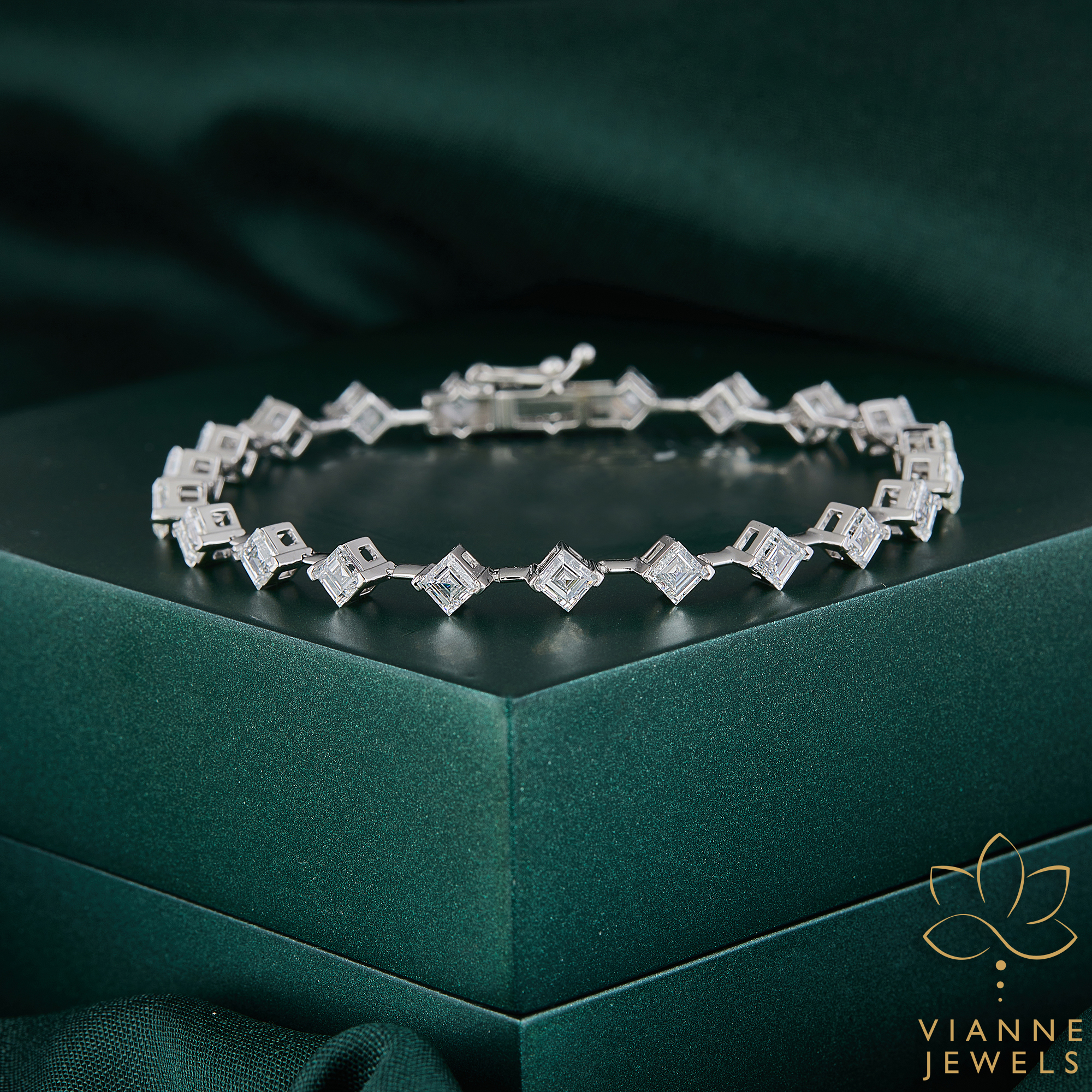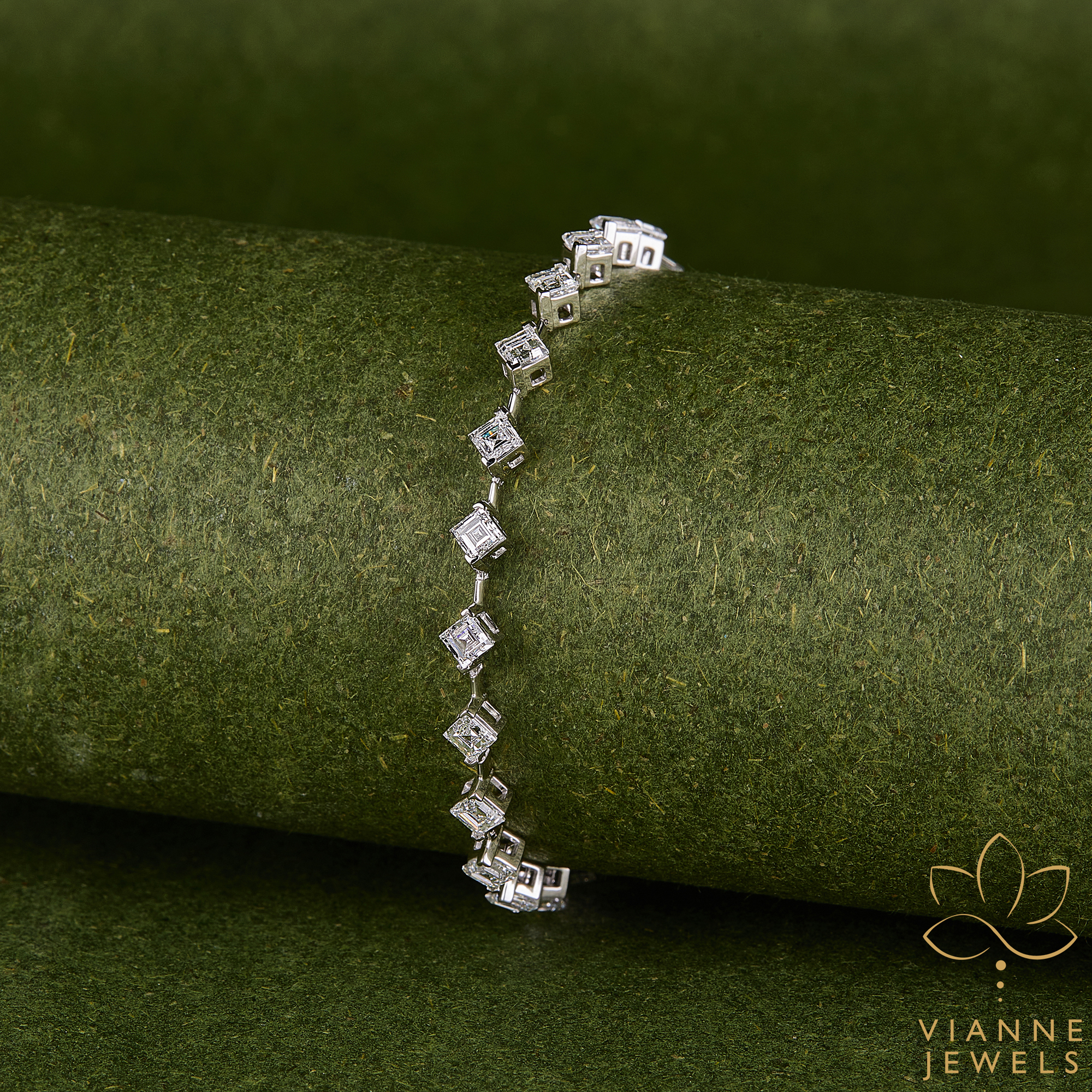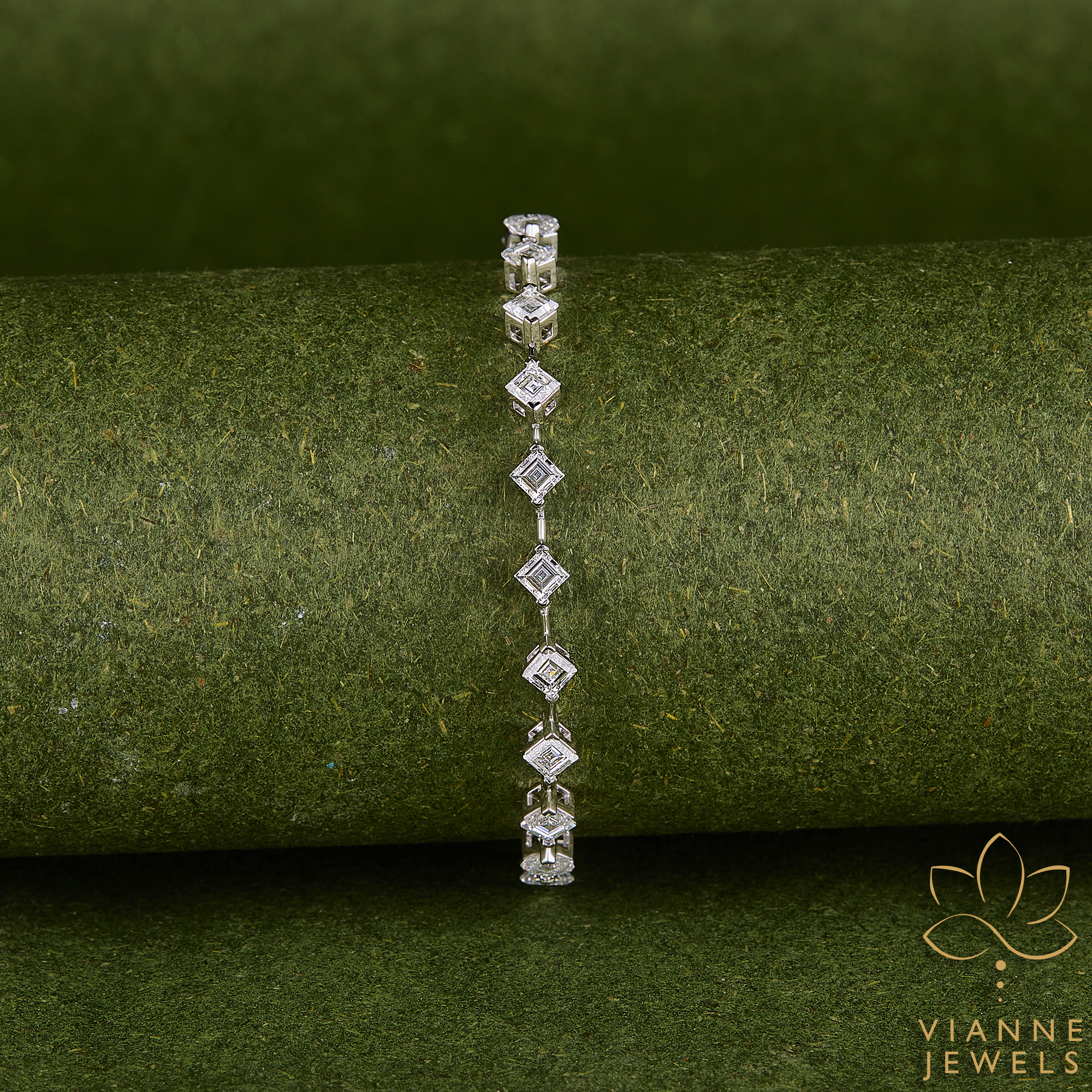 Our “Deco Dazzle” bracelet is a contemporary homage to the bygone Art Deco era, renowned for its opulent and geometric designs. This piece is intricately crafted from 14K white gold and adorned with a series of lab-grown diamonds, each one precision-set within a miniature octagonal frame reminiscent of classic Deco style.