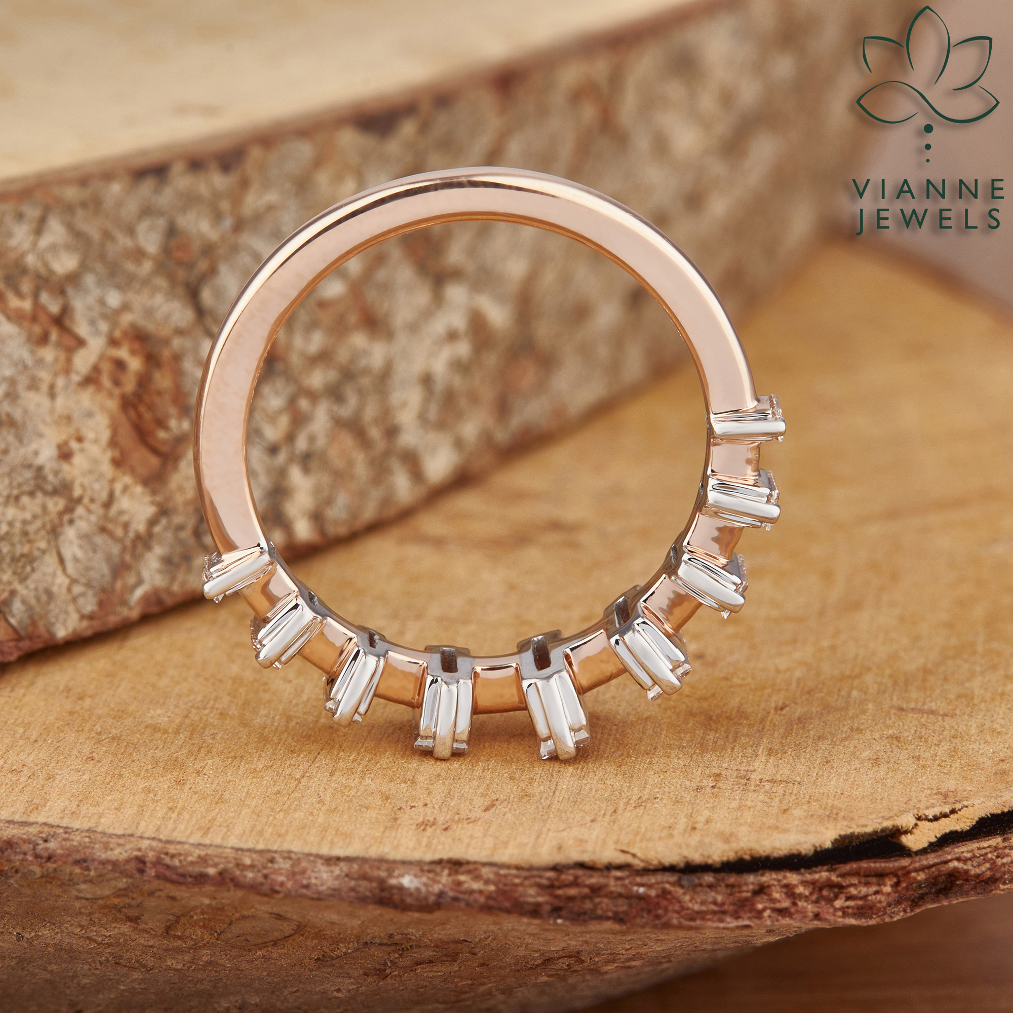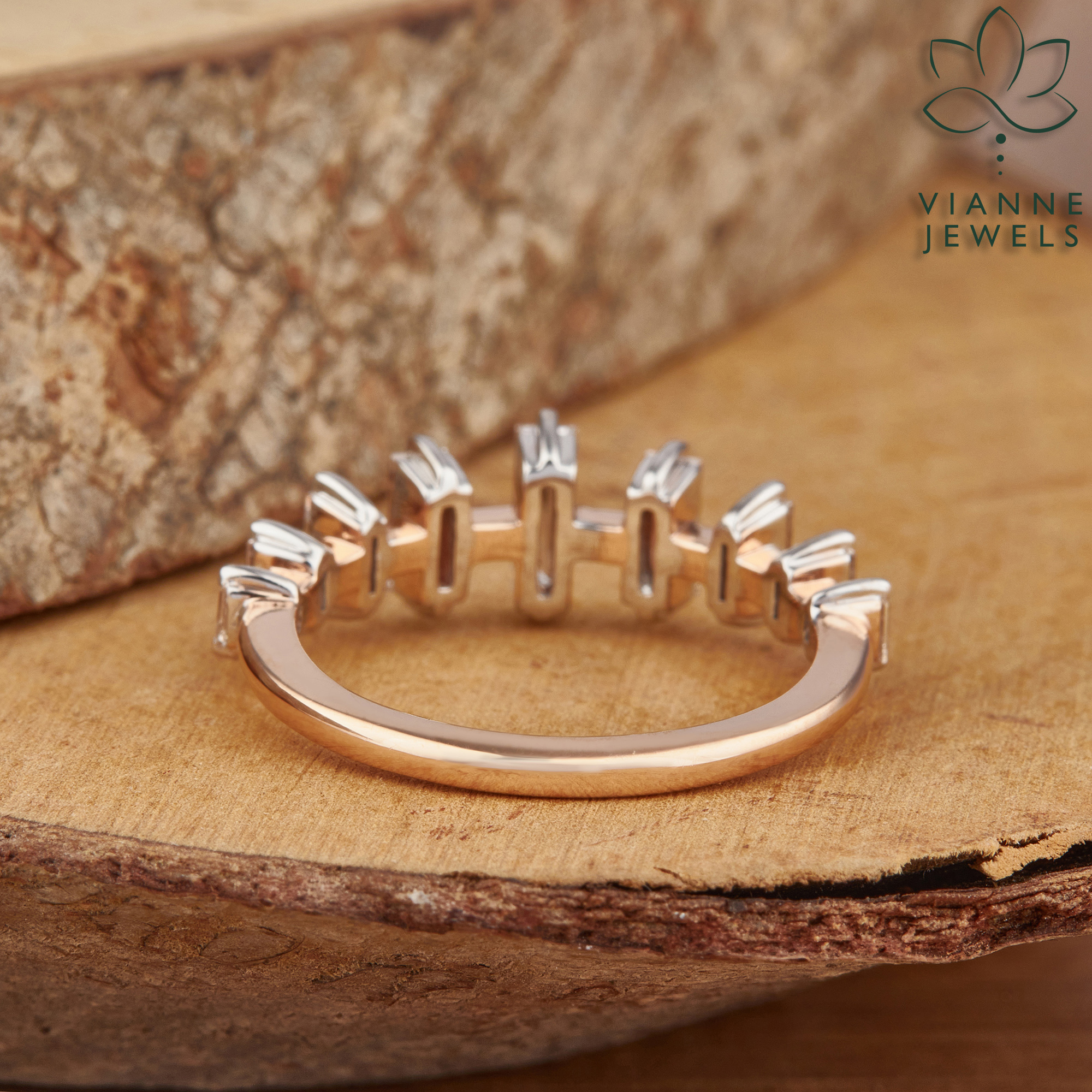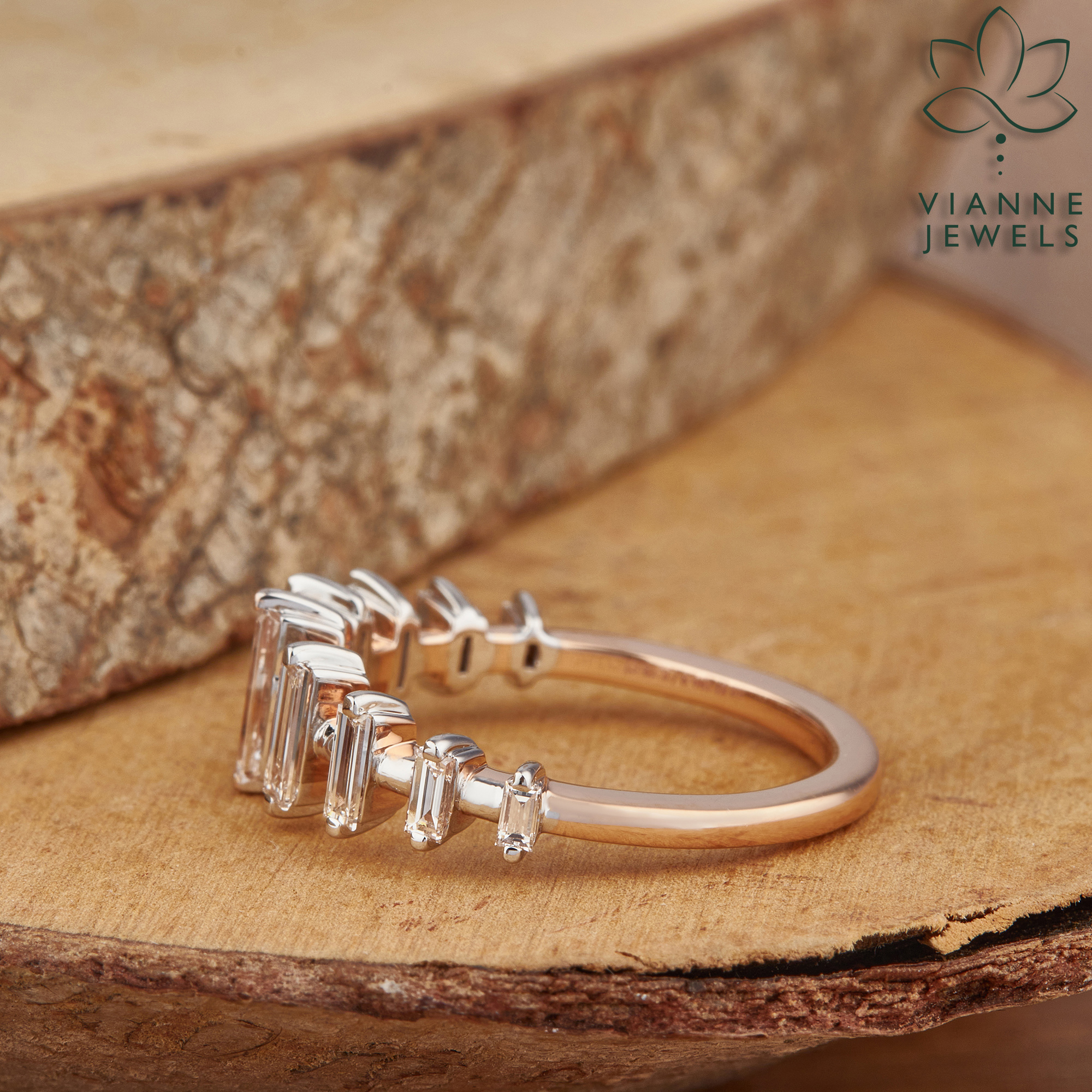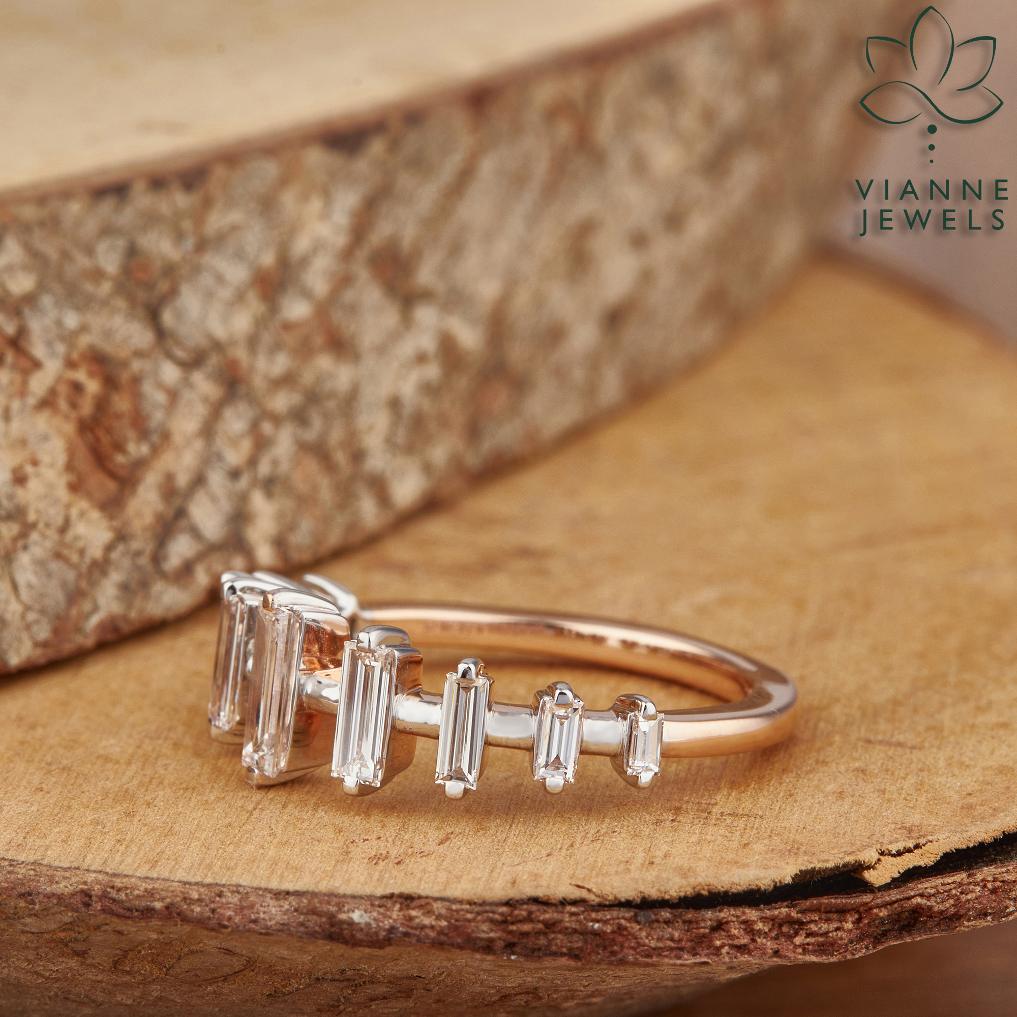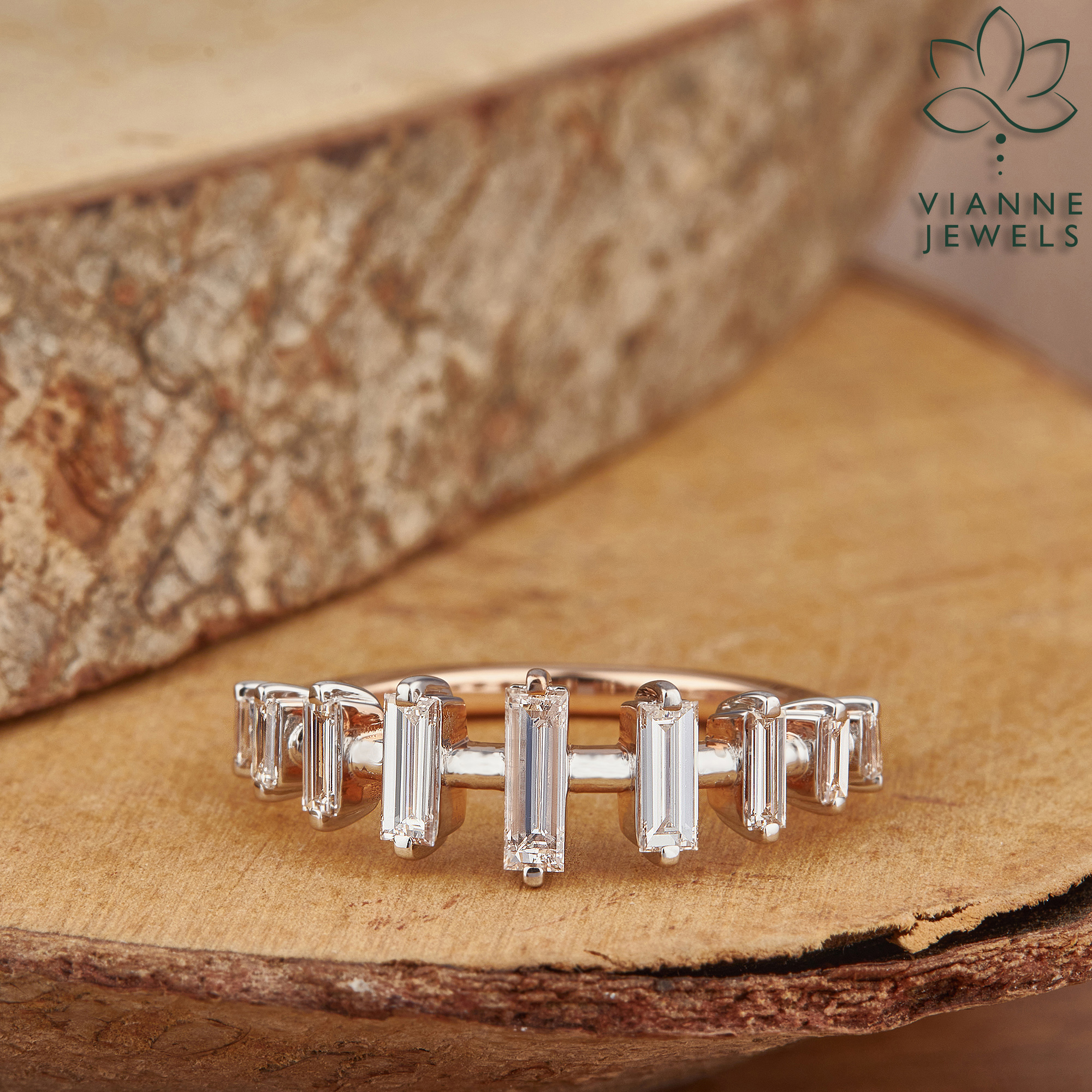 Each diamond is a marvel of modern gemmology, lab-grown to perfection, ensuring that your ring is not only beautiful but also a symbol of sustainability and ethical fashion. The baguette cut is chosen for its clean lines and contemporary feel, allowing the diamonds to catch the light and create a continuous band of brilliance.