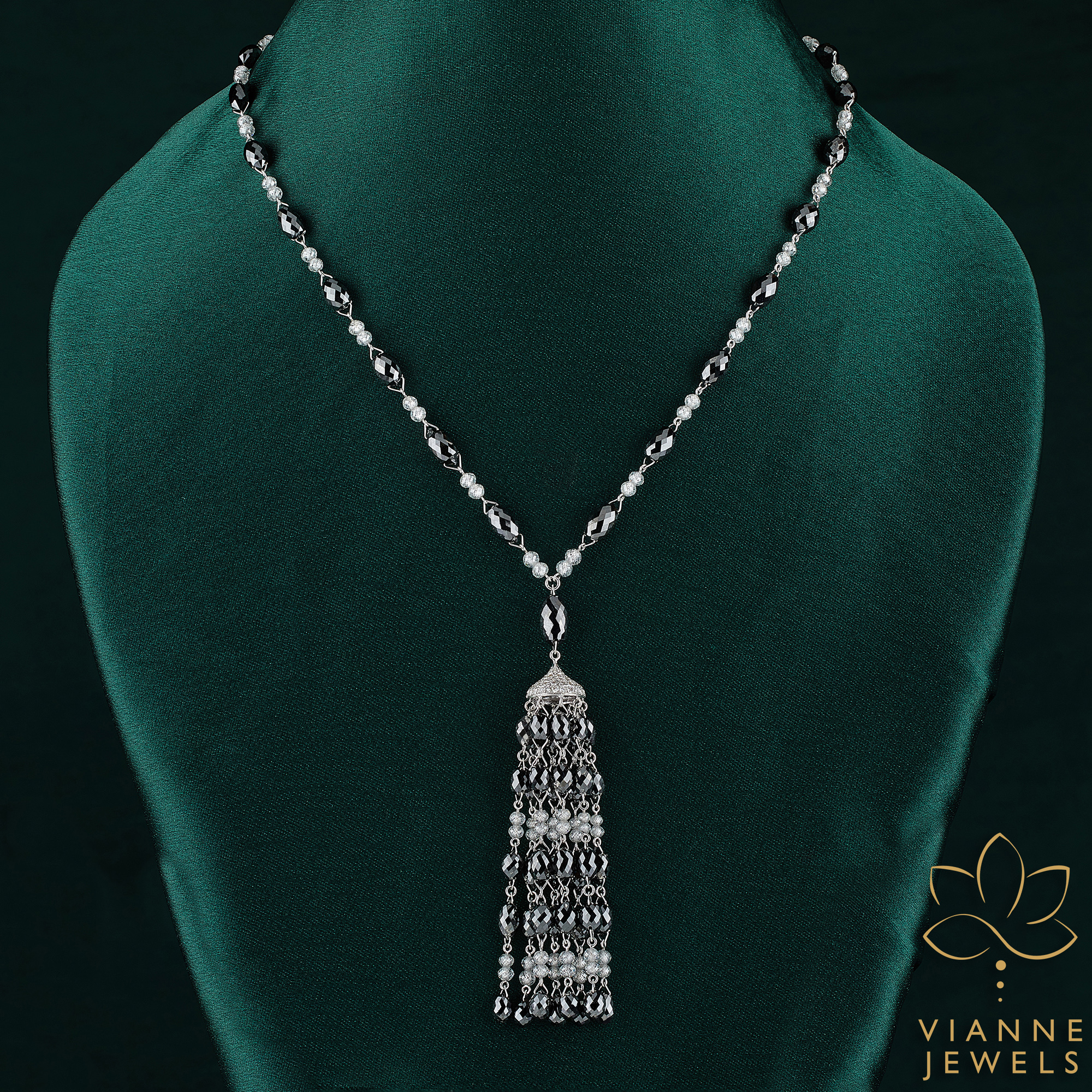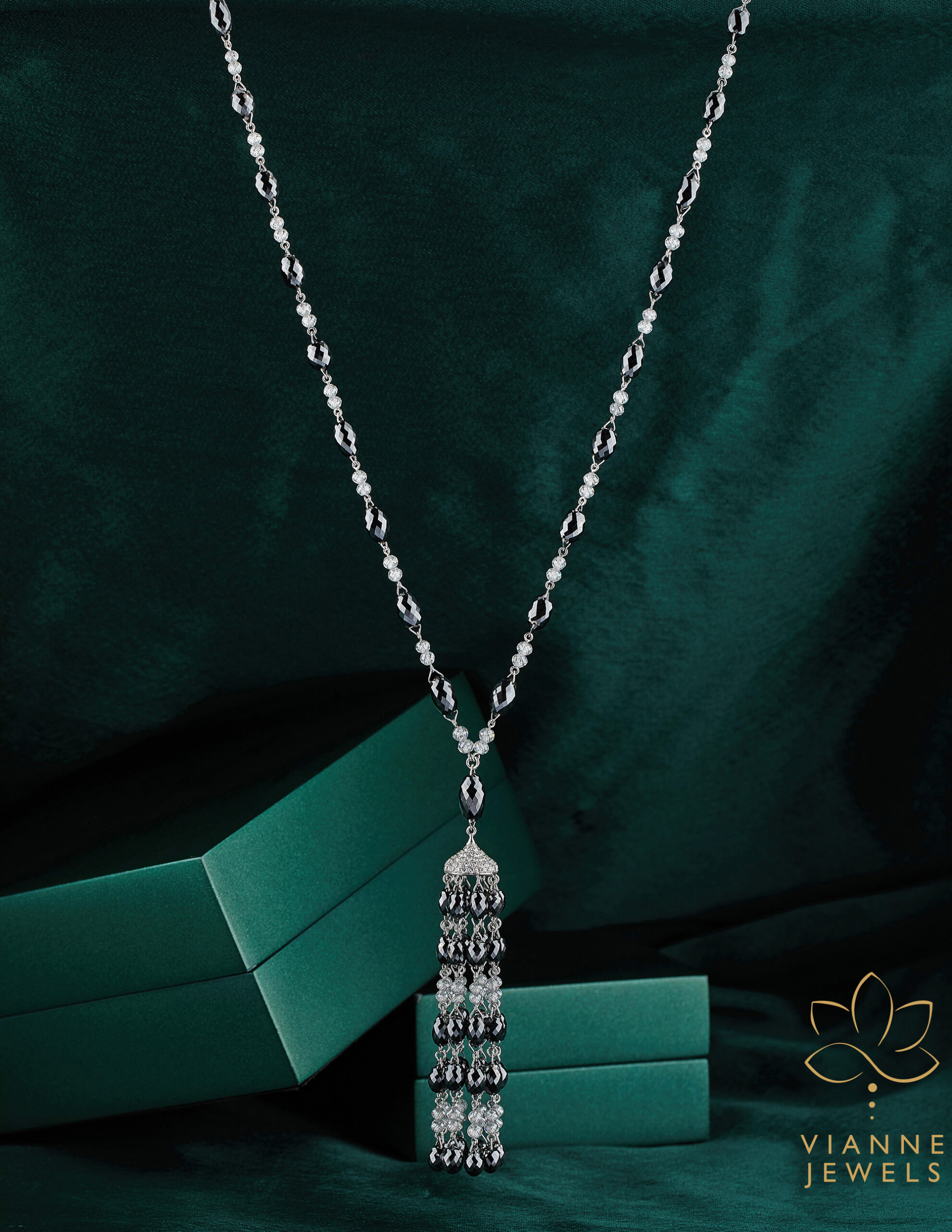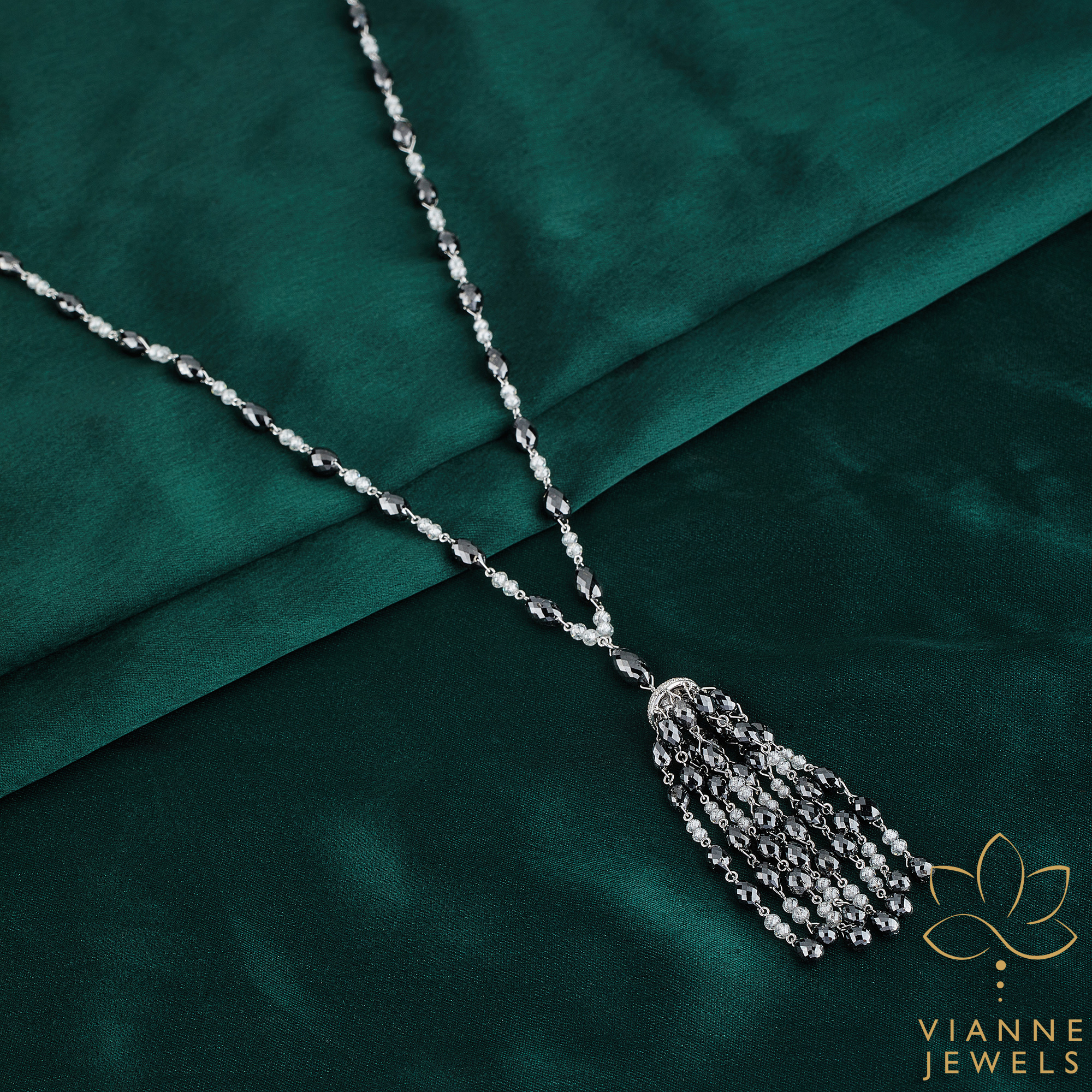 “Elegance Unveiled” is a statement necklace that marries the intricate beauty of a bygone era with the ethical innovation of today. This sterling silver necklace features a classic chain with interspersed lab-grown diamonds leading to an opulent tassel pendant. Each diamond is lab-grown, assuring ethical sourcing and environmental responsibility while providing the same mesmerizing sparkle as the best mined diamonds.