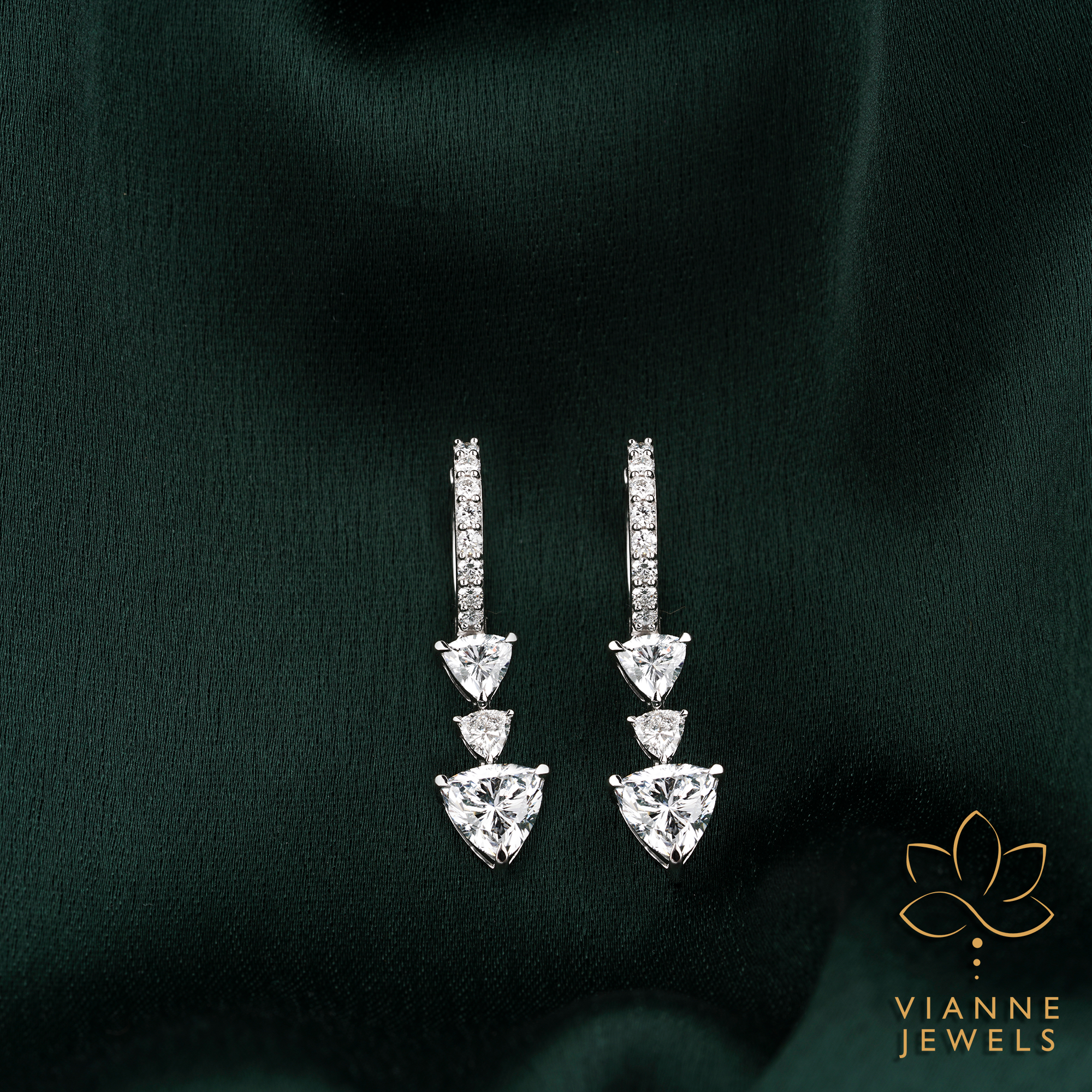 Each earring begins with a line of petite, lab-grown diamonds that lead to a stunning sequence of geometrically cut stones, culminating in a striking pear-shaped diamond. These lab-grown diamonds are not only flawless in their cut and clarity but also represent a new era of ethical jewelry, providing peace of mind alongside exquisite beauty.
