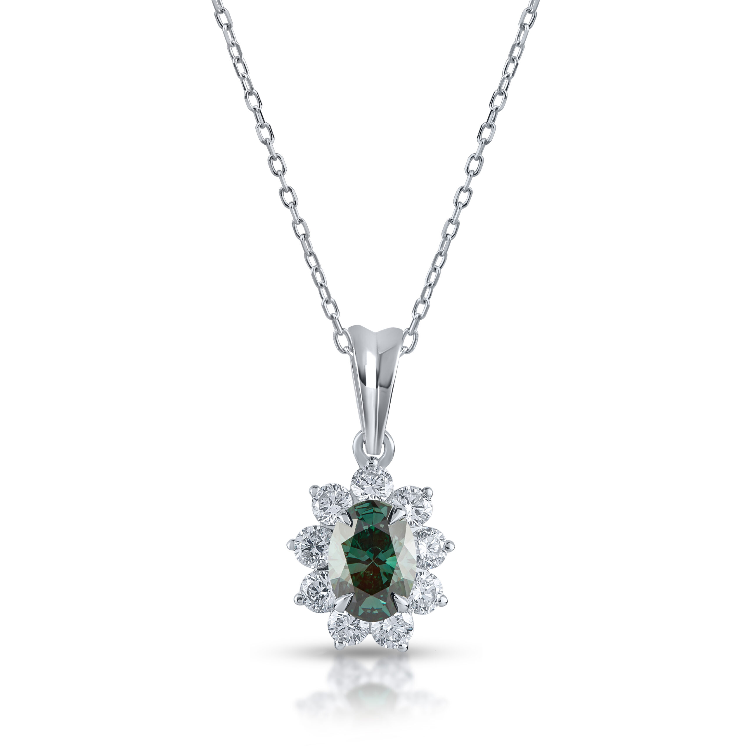 Lab-grown gemstones not only mirror the beauty of their natural counterparts but also represent a step towards a more sustainable and ethical approach to fine jewelry. The pendant’s timeless oval cut and the surrounding diamond halo create a play of light and color that is both eye-catching and elegant.