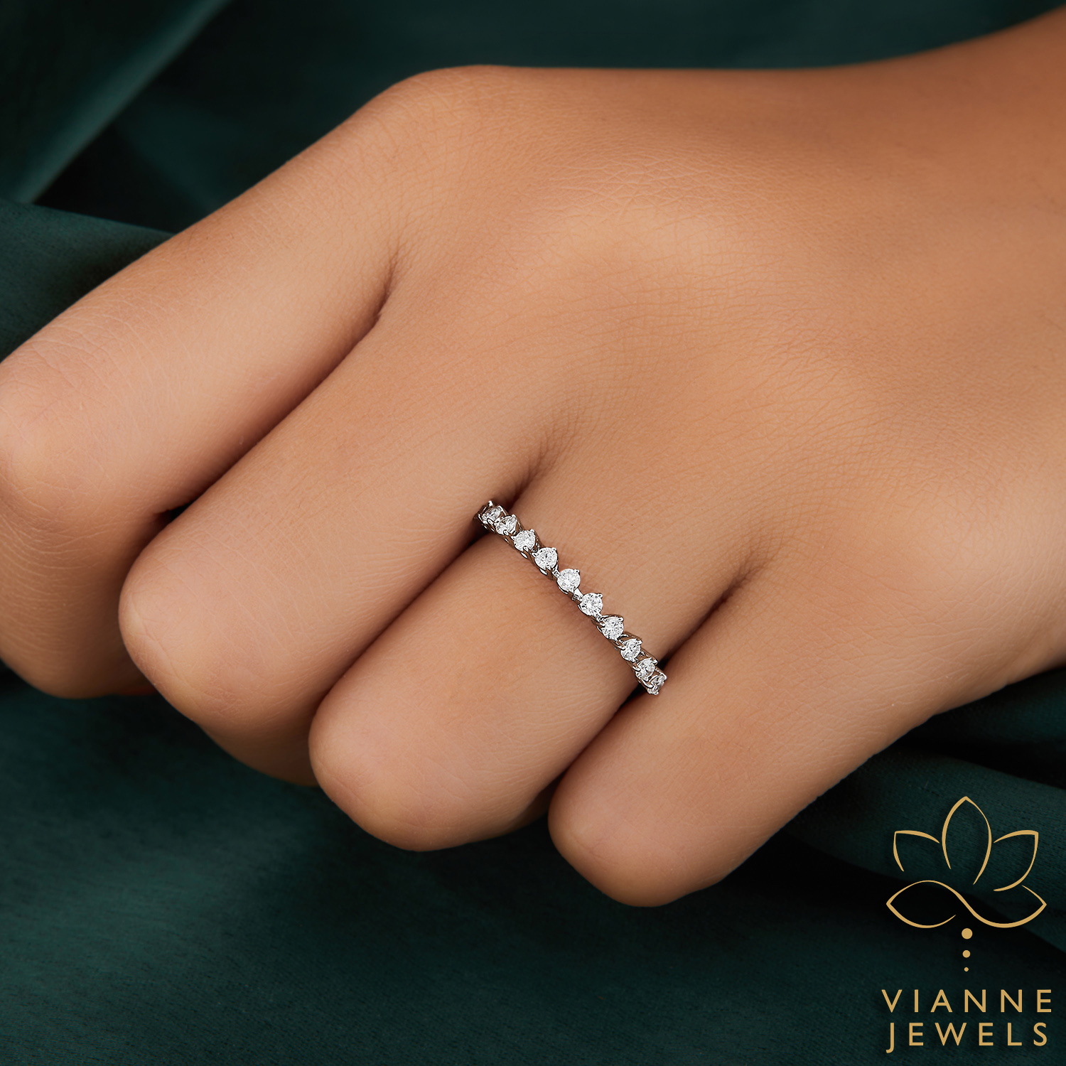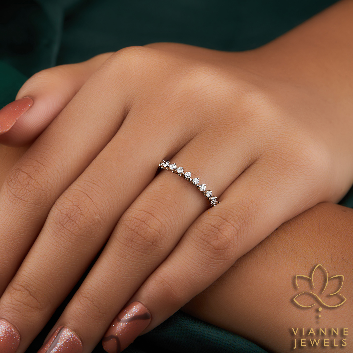 The ‘Eternal Sparkle’ Tiara Band stands out for its intricate craftsmanship and the romantic allure of its design. It’s a fitting choice for weddings, as an anniversary band, or simply to add a touch of everyday luxury. Whether worn alone or stacked with other favorites, it brings a regal touch to any outfit.