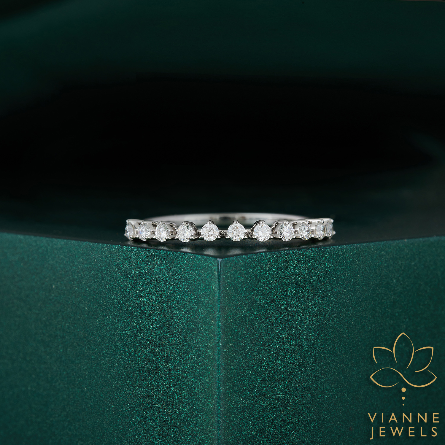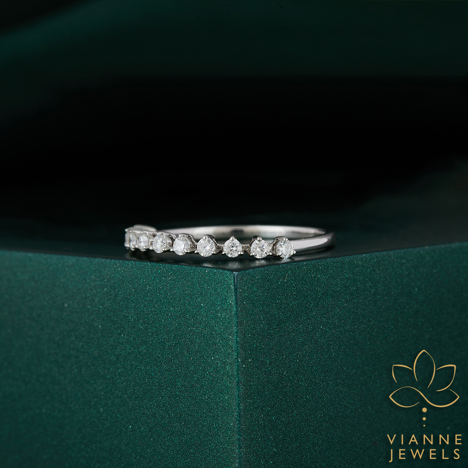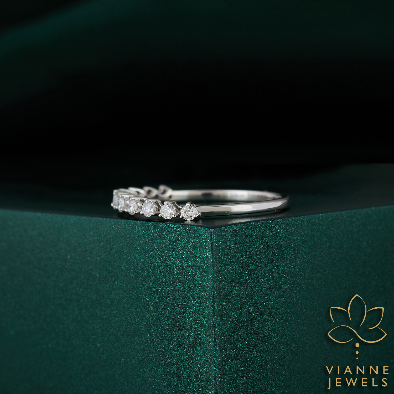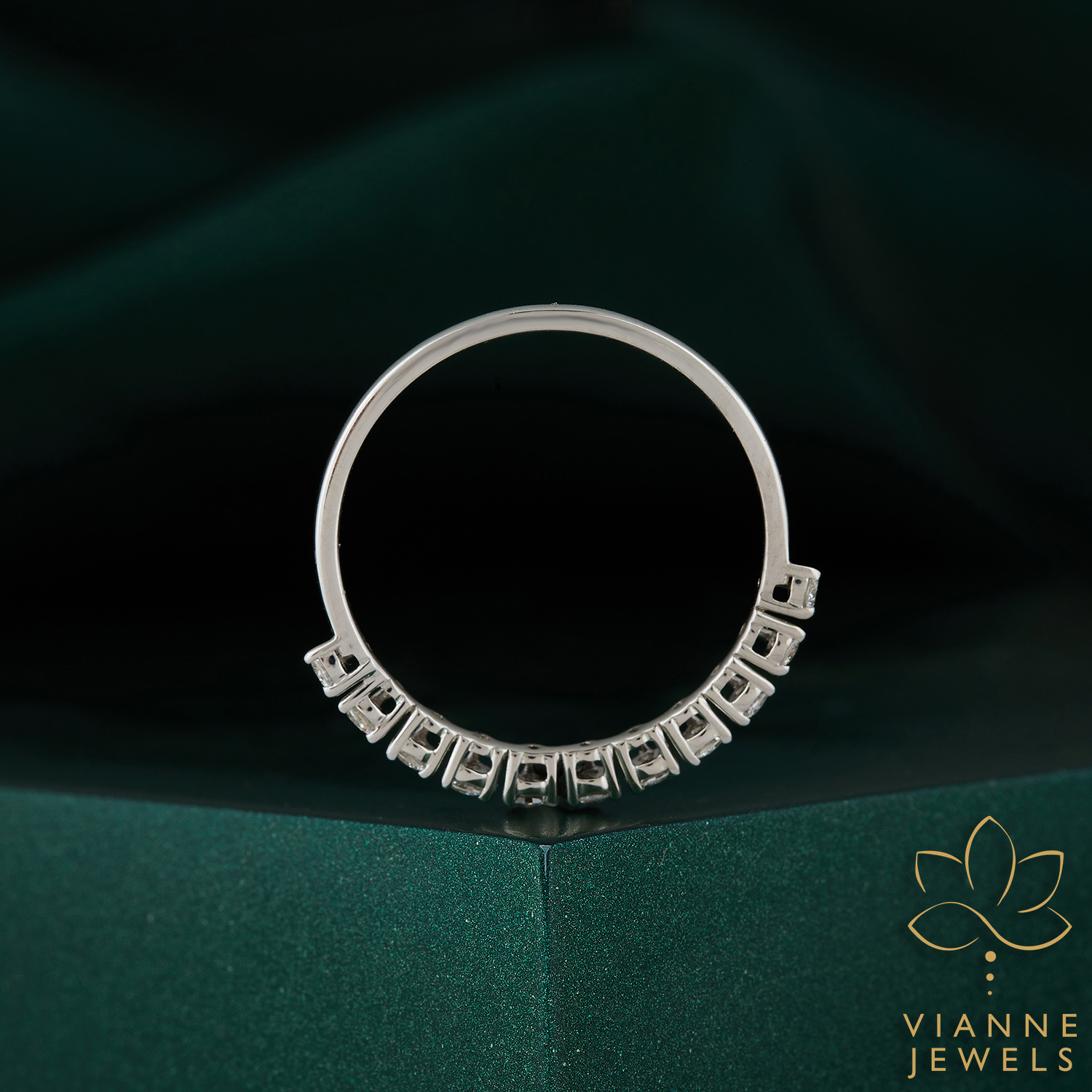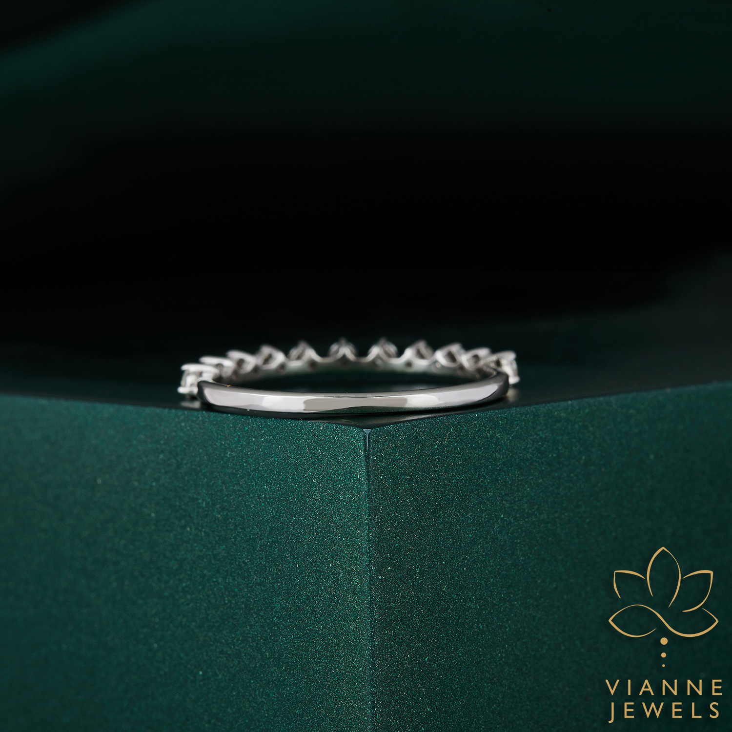 : “Revel in the splendor of this tiara-inspired band, crowned with lab-grown diamonds in a delicate white gold setting, a regal addition to your jewelry trove.”