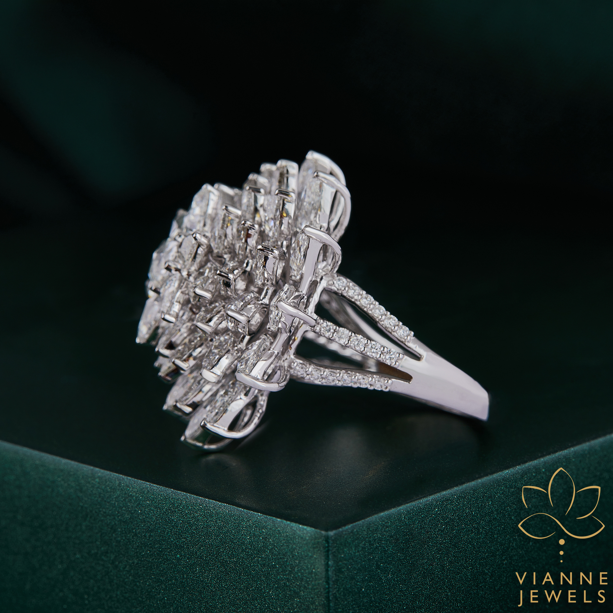 “Adorn your hand with the artistry of our ‘Exquisite Marquise Mosaic’ Cluster Ring, a masterpiece of modern jewelry design. This exquisite ring features an intricate cluster of marquise-cut lab-grown diamonds, each positioned to form a dazzling floral mosaic that blooms with life on your finger. The white gold setting provides the perfect stage for these sparkling gems, enhancing their natural radiance.