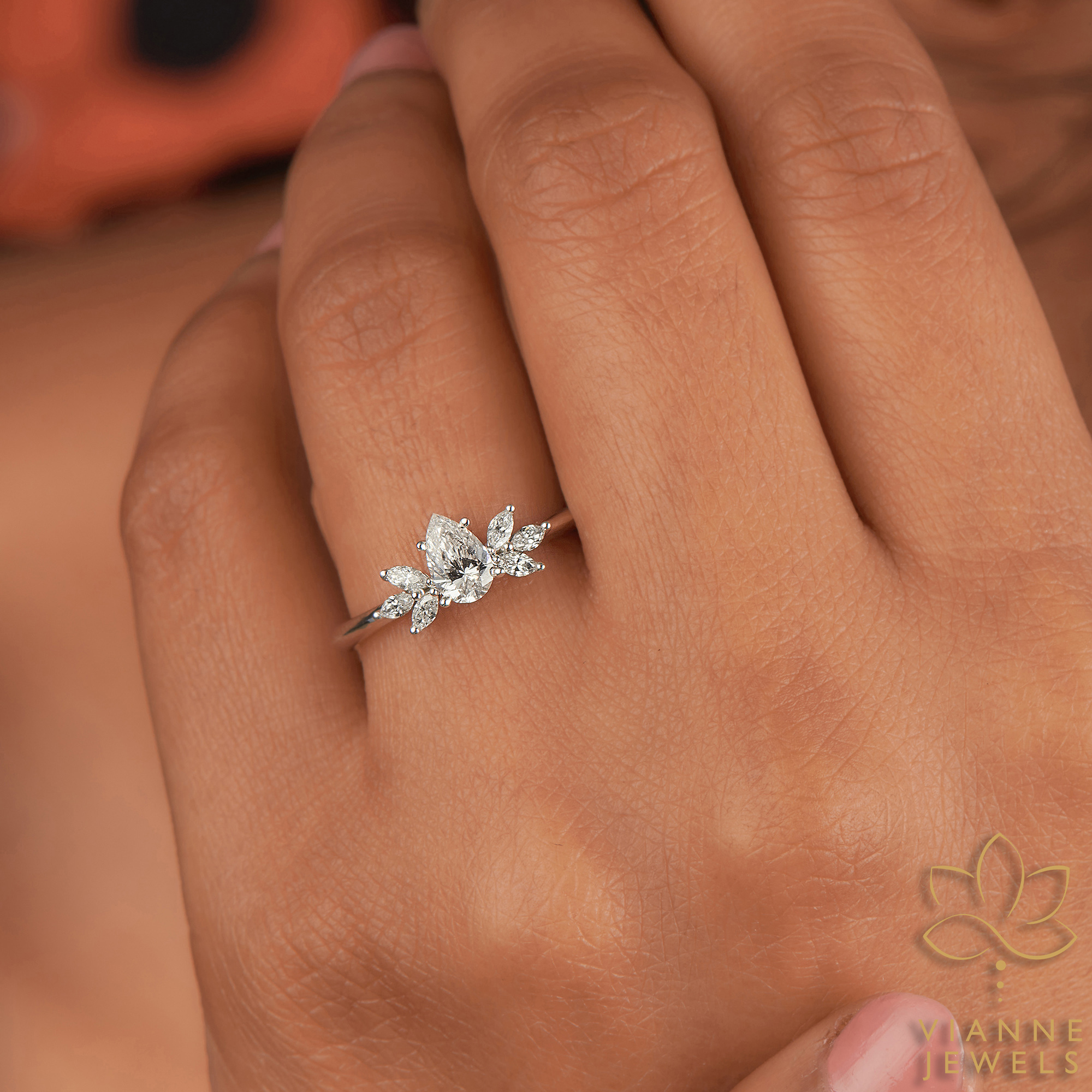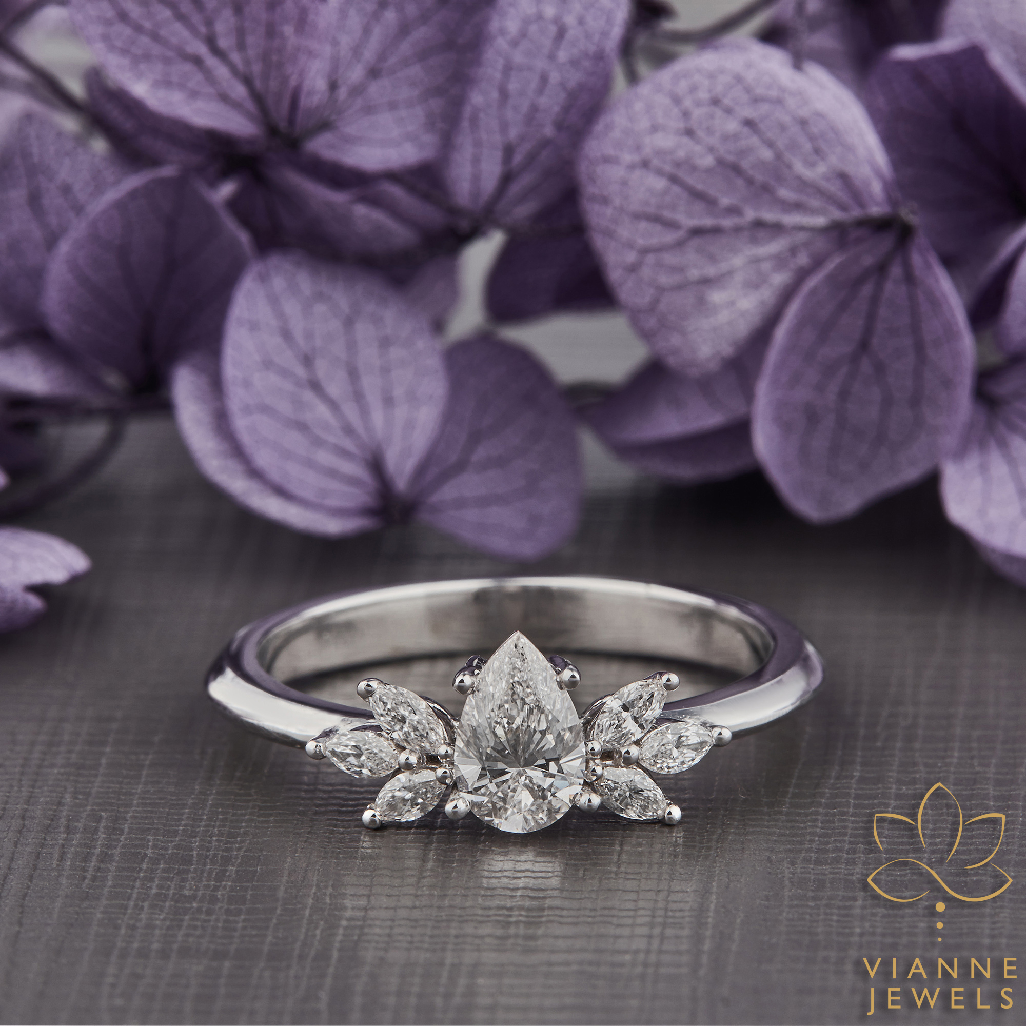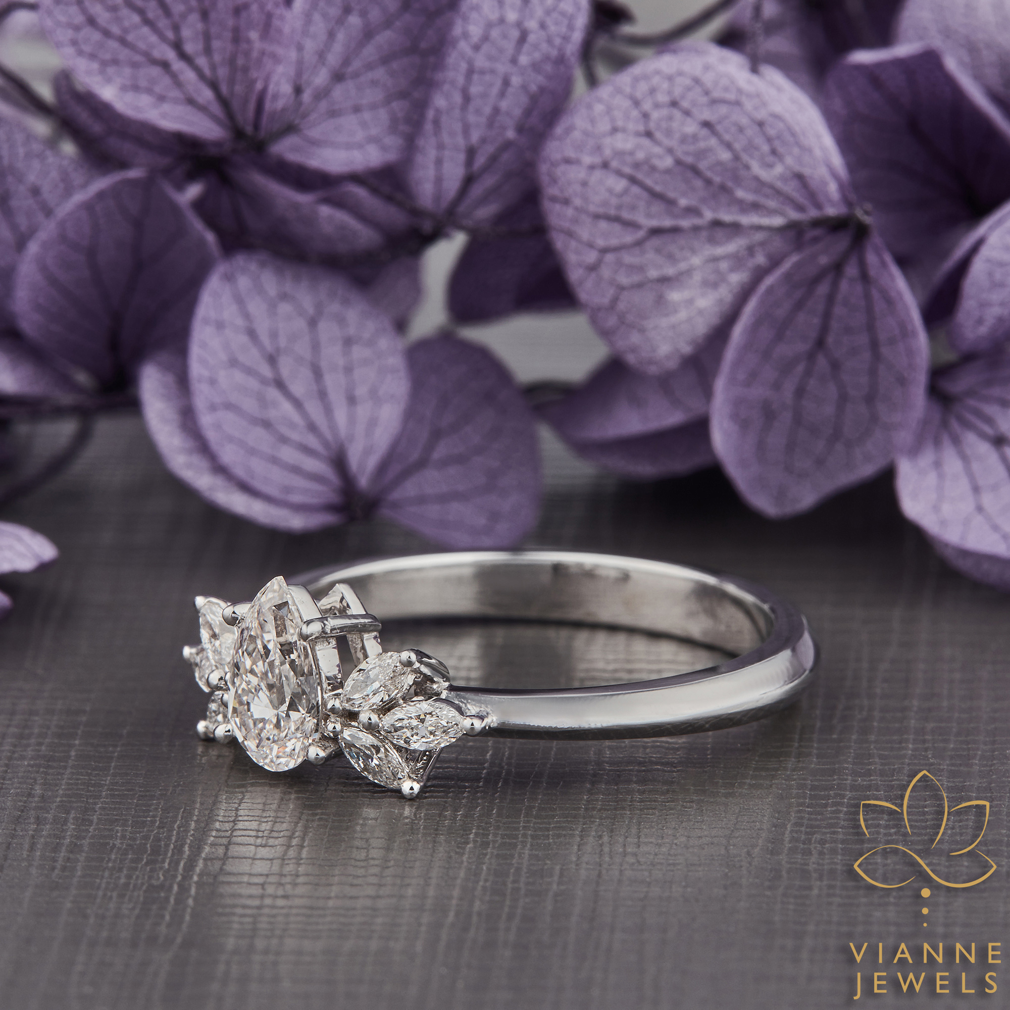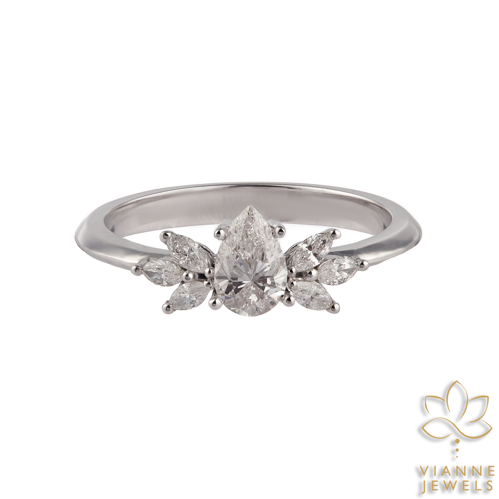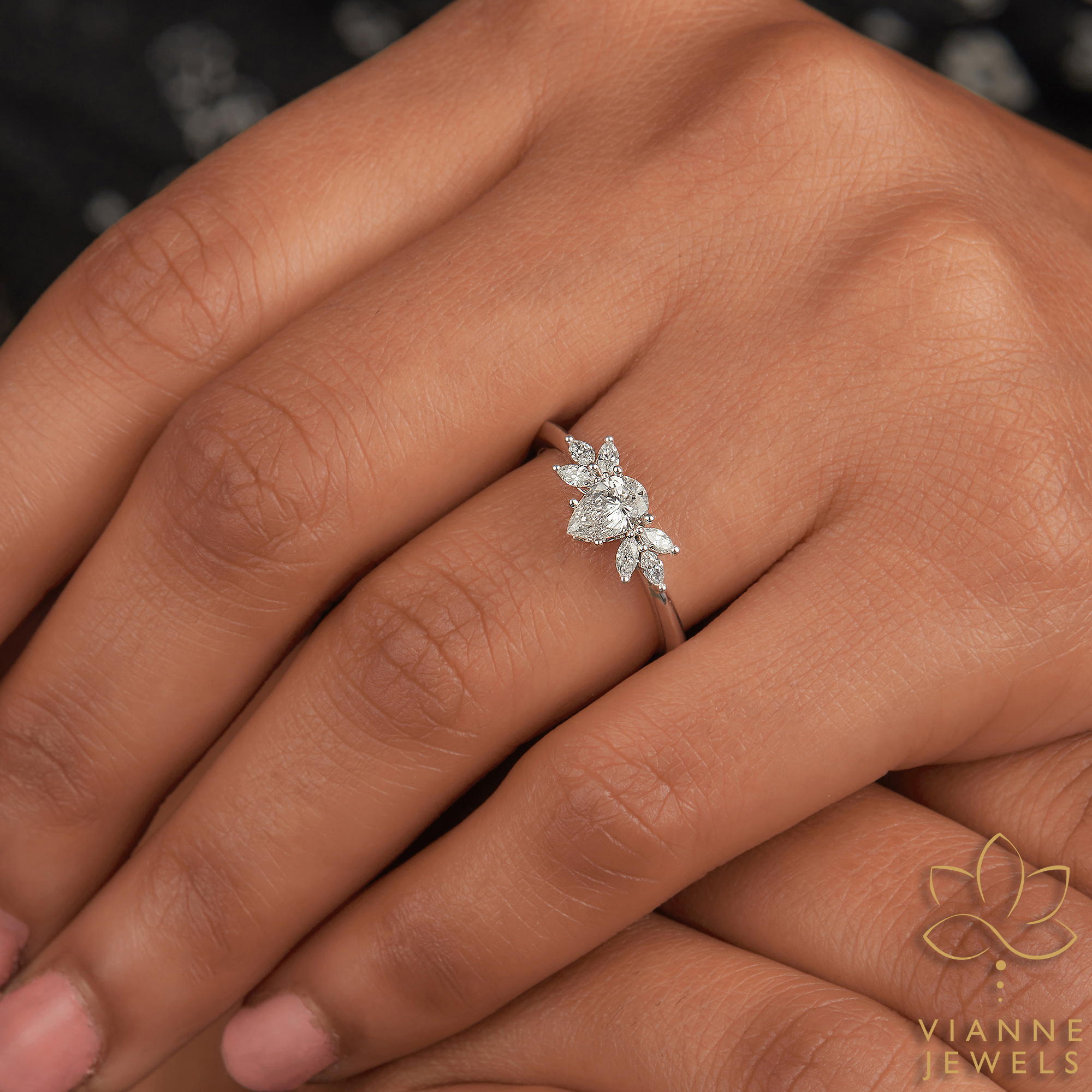 Our Floral Radiance Ring captures the enchanting allure of a blooming flower using the art of fine jewelry. At the center of this botanical-inspired piece is a marquise-cut lab-grown diamond, its pointed ends and brilliant faceting resembling the delicate petal of a flower. Surrounding this central gem are round lab-grown diamonds, each carefully placed to mimic the natural symmetry of floral beauty.