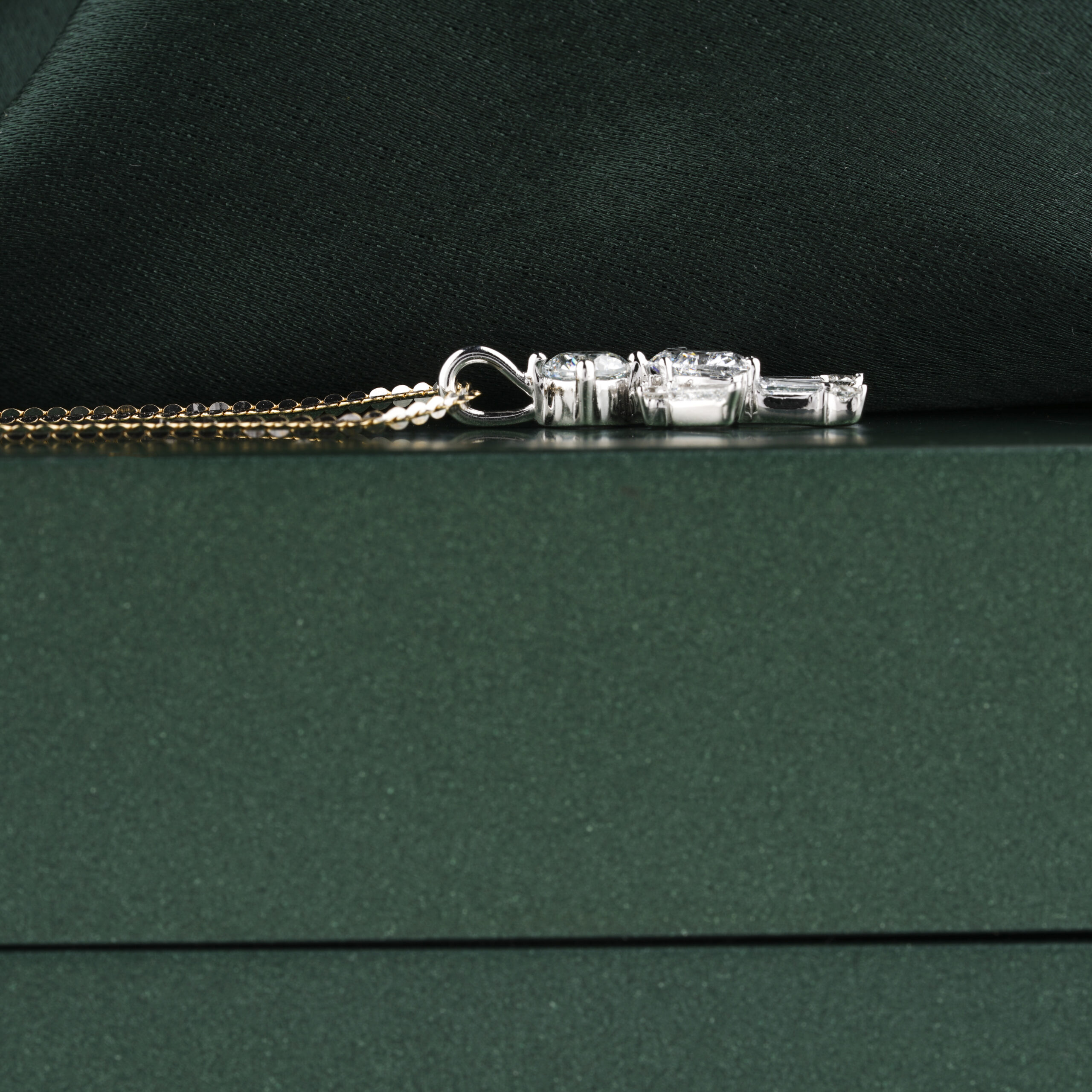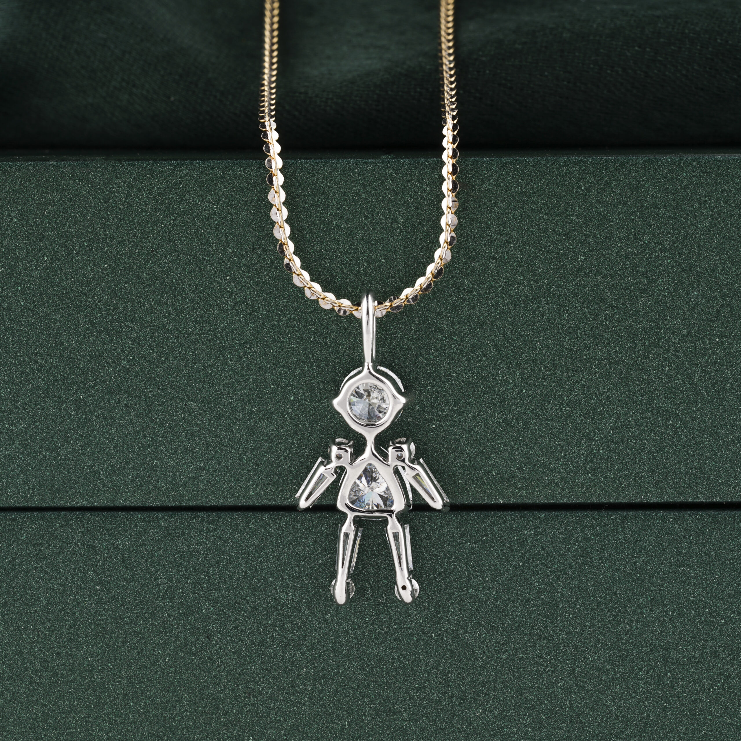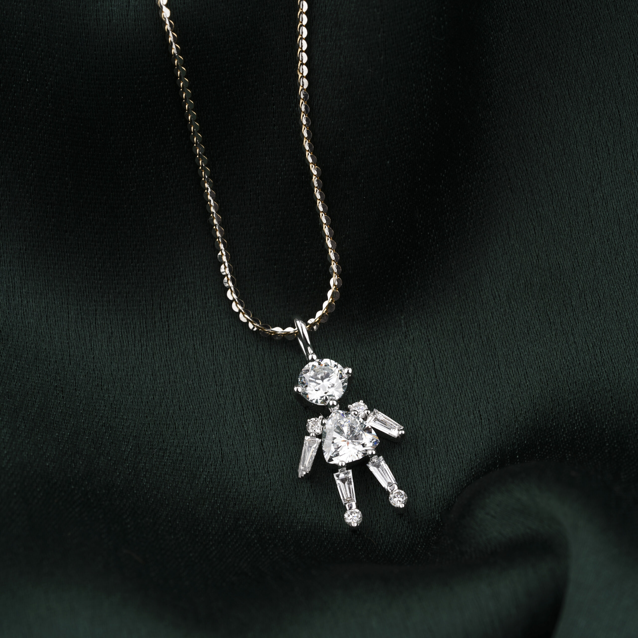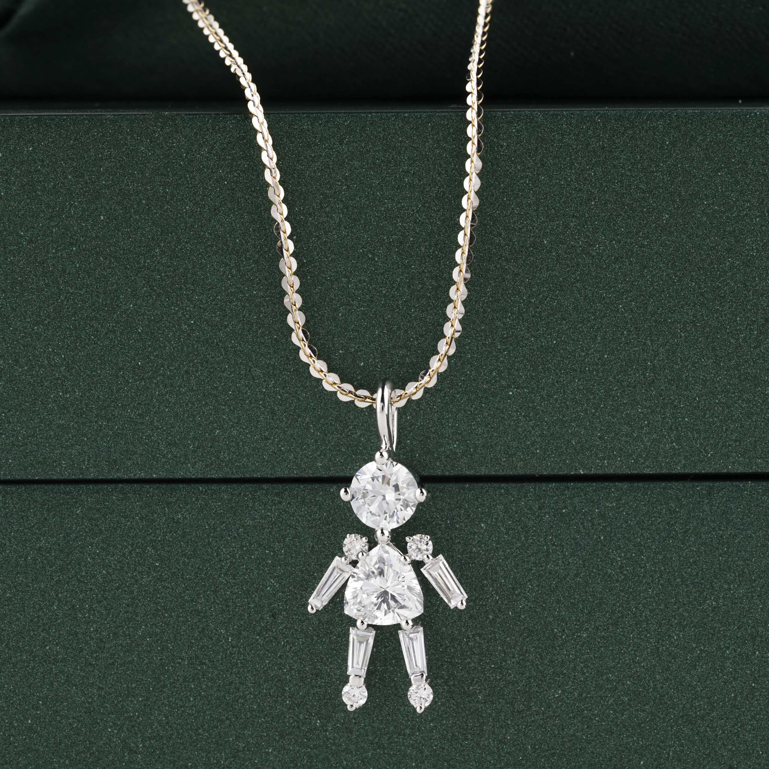 “Discover the ‘Astro-Bot’ Pendant, where innovative design meets the timeless beauty of diamonds. This pendant showcases a miniature robot, whimsically composed of lab-grown diamonds, each meticulously chosen for their exceptional sparkle and placed upon a gleaming gold chain that adds a touch of classic elegance.