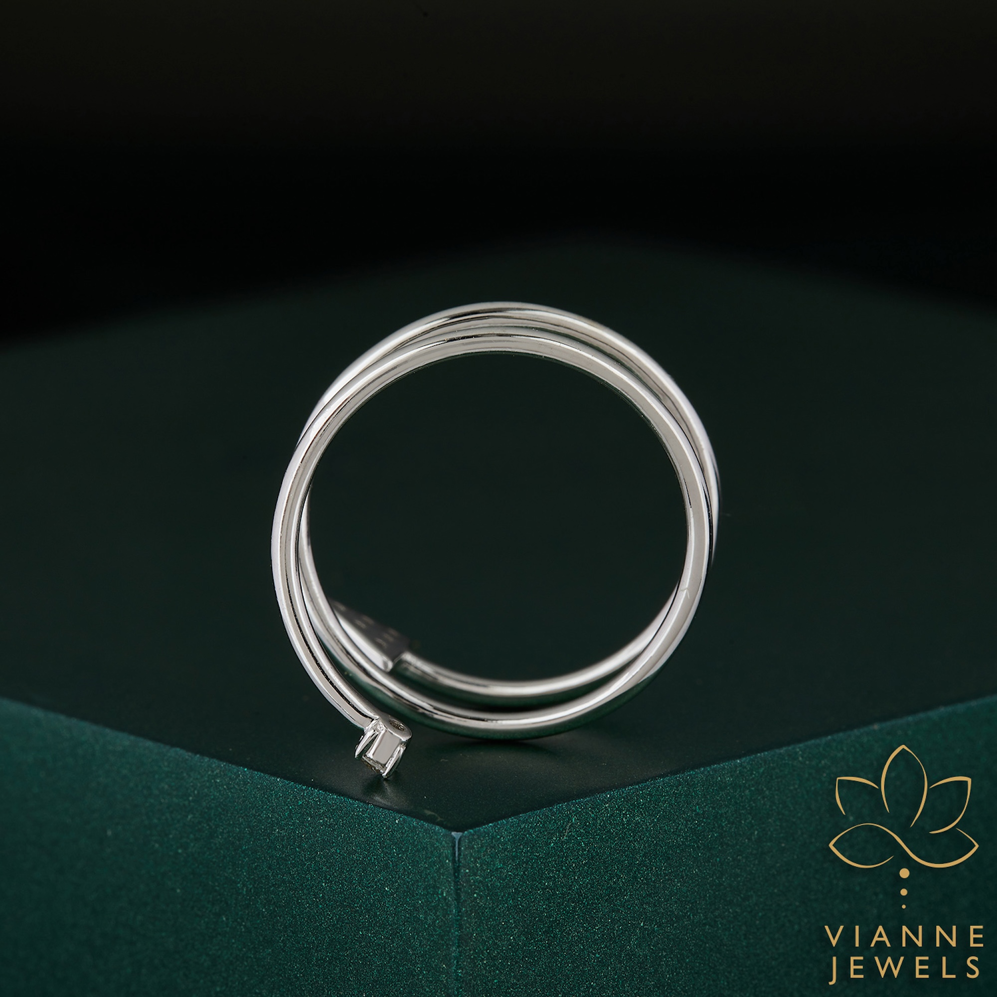 The sleek white gold band is polished to a mirror-like finish, wrapping around the finger with an elegant grace that leaves space for the skin to be part of the aesthetic. This open ring is versatile enough for day-to-night wear and can stand alone as a statement piece or be layered with other rings for a personalized stack.