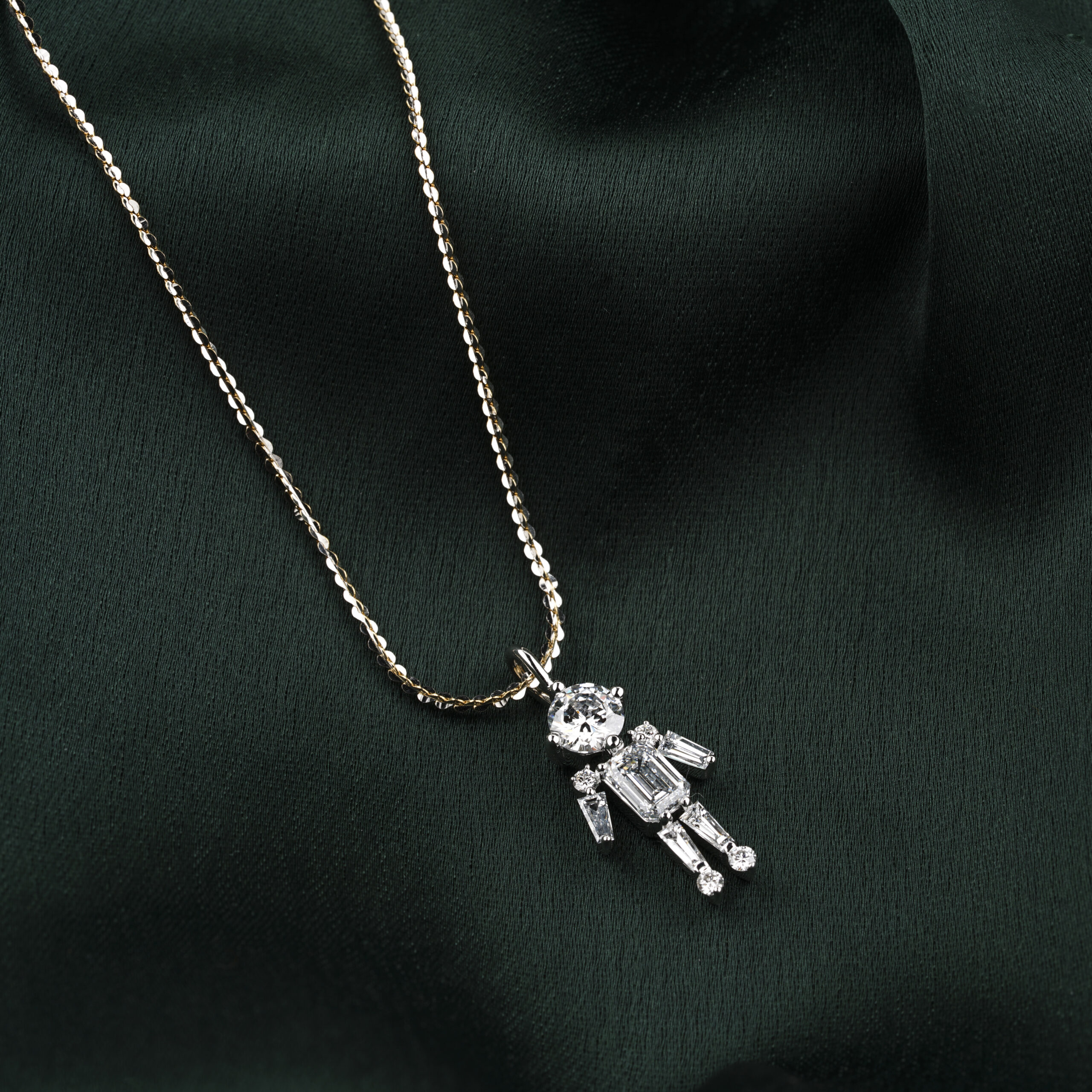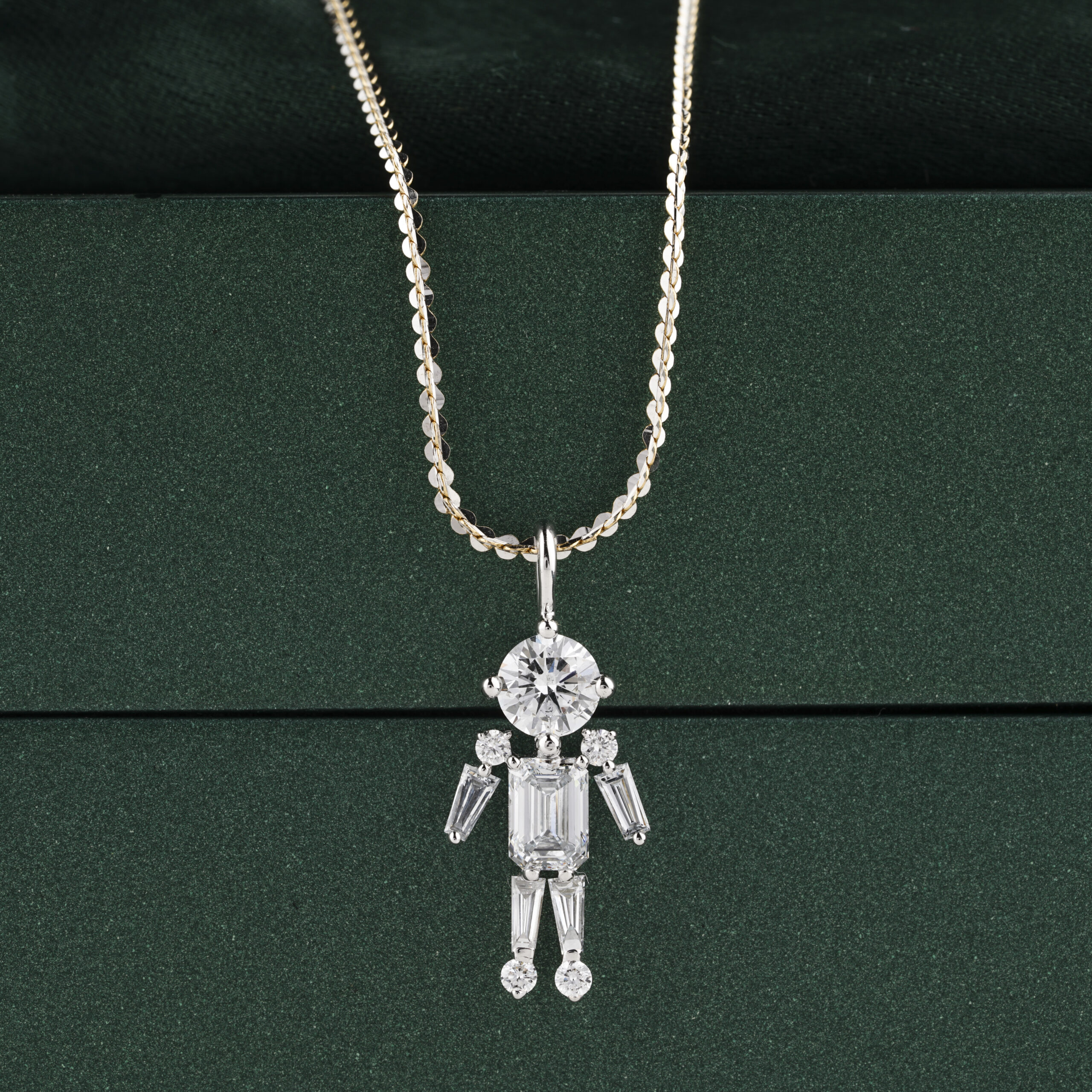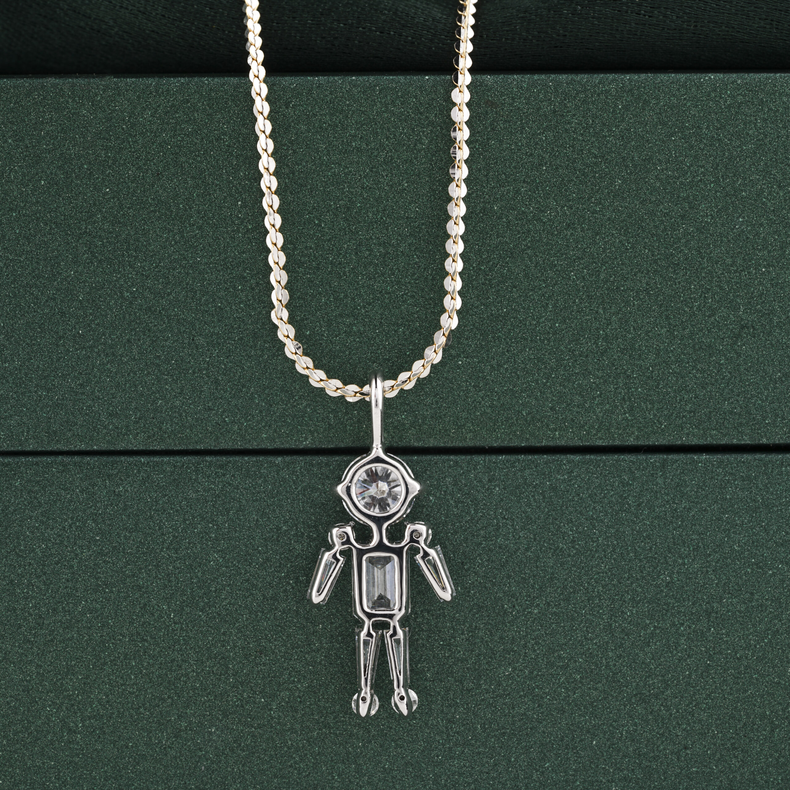 At the heart of this pendant is a captivating arrangement of lab-grown diamonds, carefully selected for their clarity and brilliance. The diamonds are arranged to form the shape of a friendly robot, complete with a round head, rectangular body, and articulated limbs. Each diamond is precision-cut to enhance its geometric beauty, reflecting light from every angle.