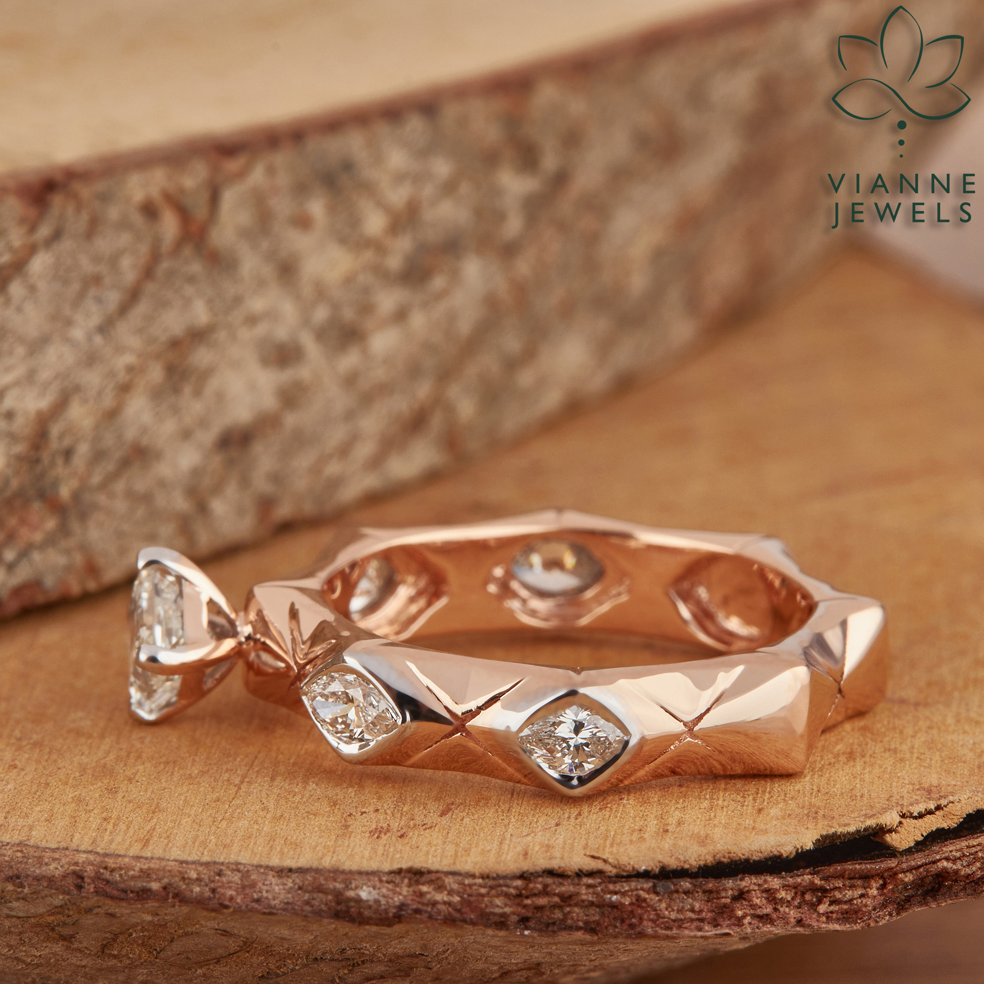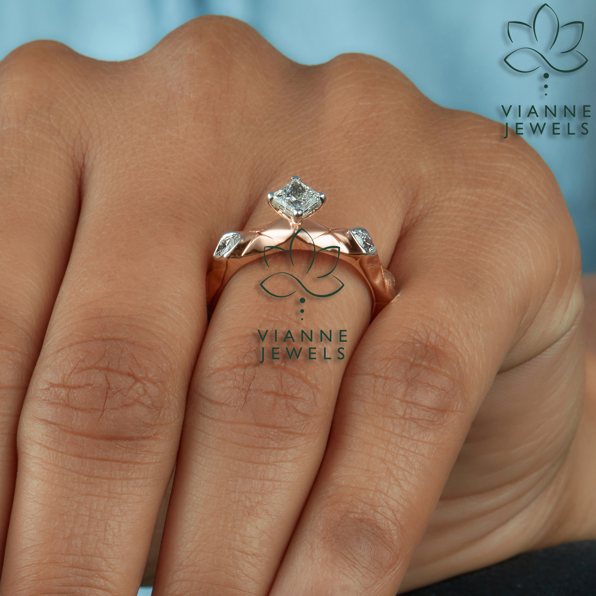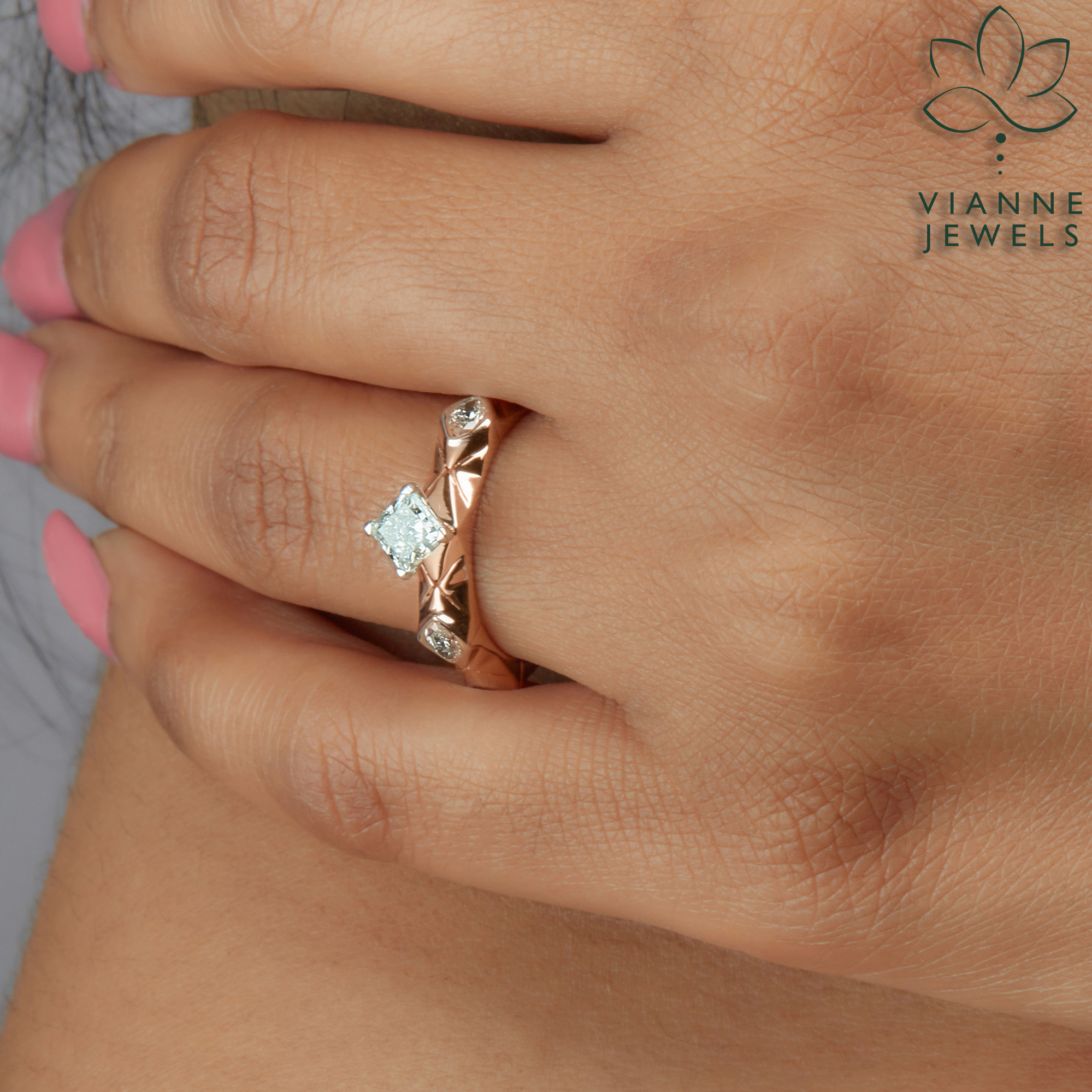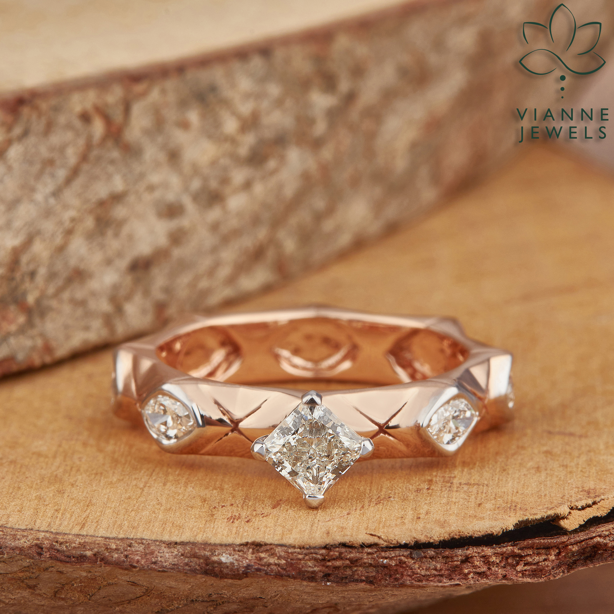 “Step into the realm of chic sophistication with our ‘Geometric Glamour’ ring, a piece where futuristic elegance meets sustainable beauty. This exquisite ring features a lab-grown, princess-cut diamond that radiates with eco-friendly brilliance, nestled within the embrace of a textured rose gold band.
