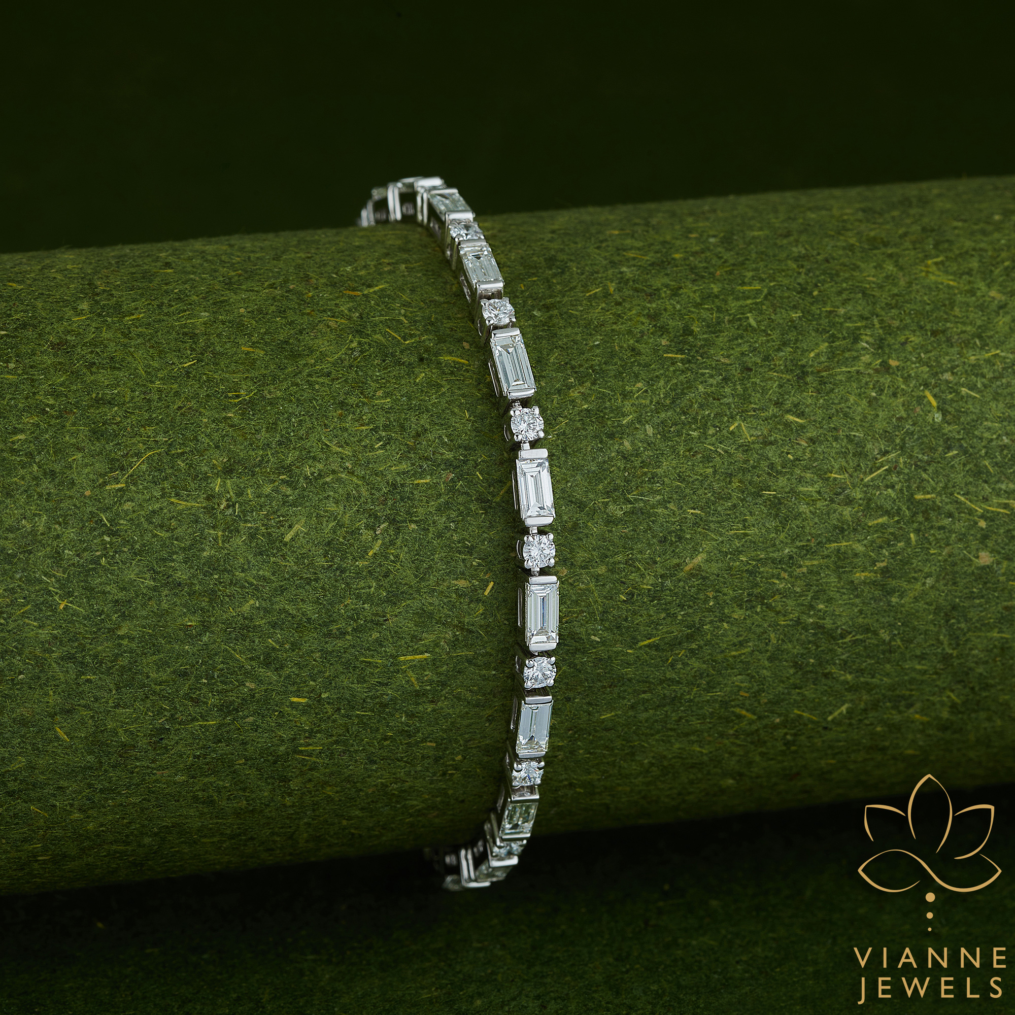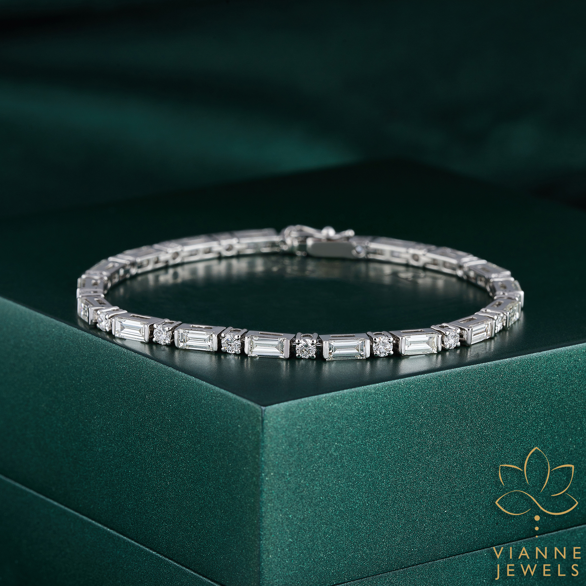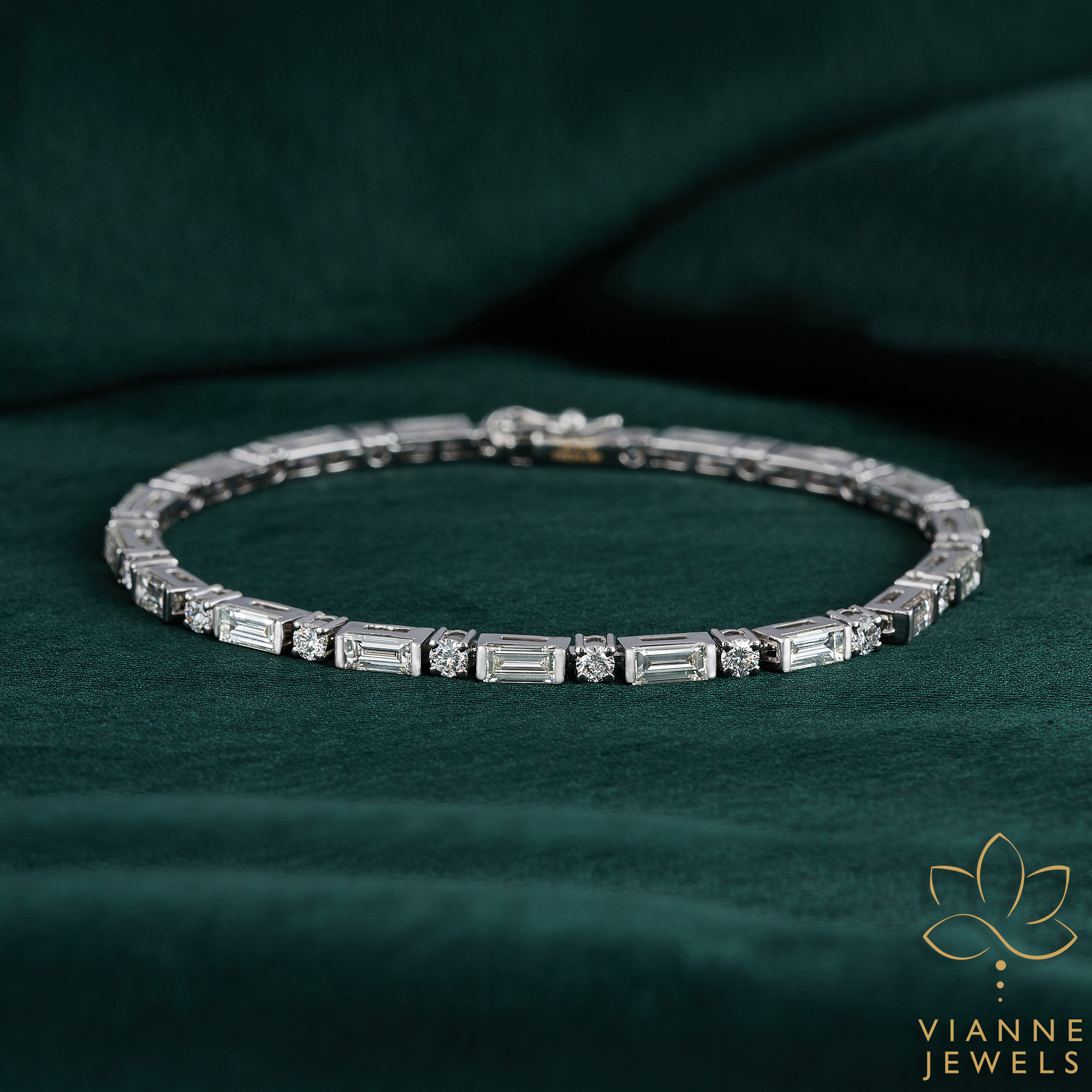 The ‘Geometric Gleam’ bracelet is a celebration of sharp angles and clean lines, a stunning piece that embodies both the art of jewelry design and the ethos of sustainable luxury. This bracelet features a collection of lab-grown diamonds, each one precision-cut and carefully placed within a sleek sterling silver setting to form a series of geometric patterns that catch the light with every movement.