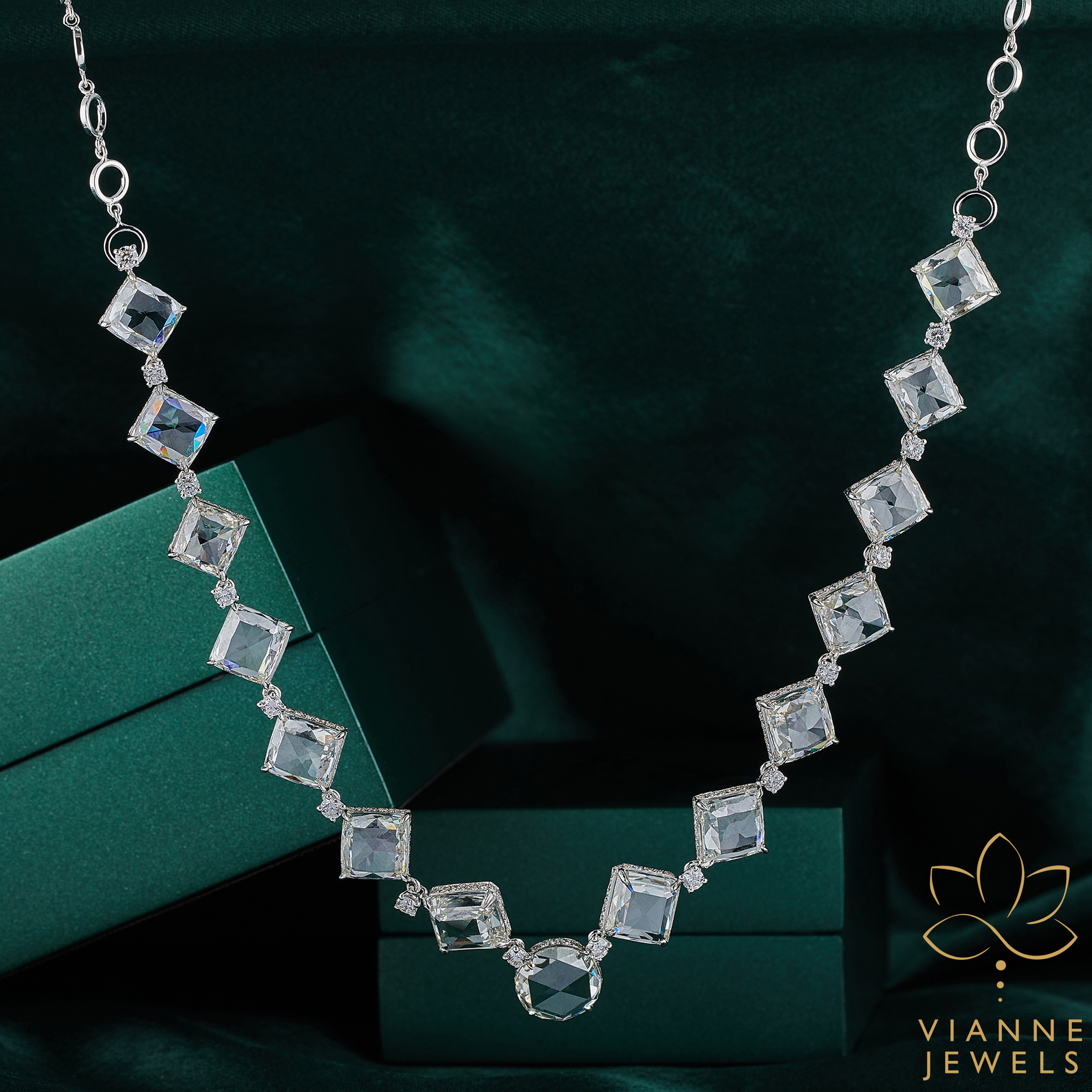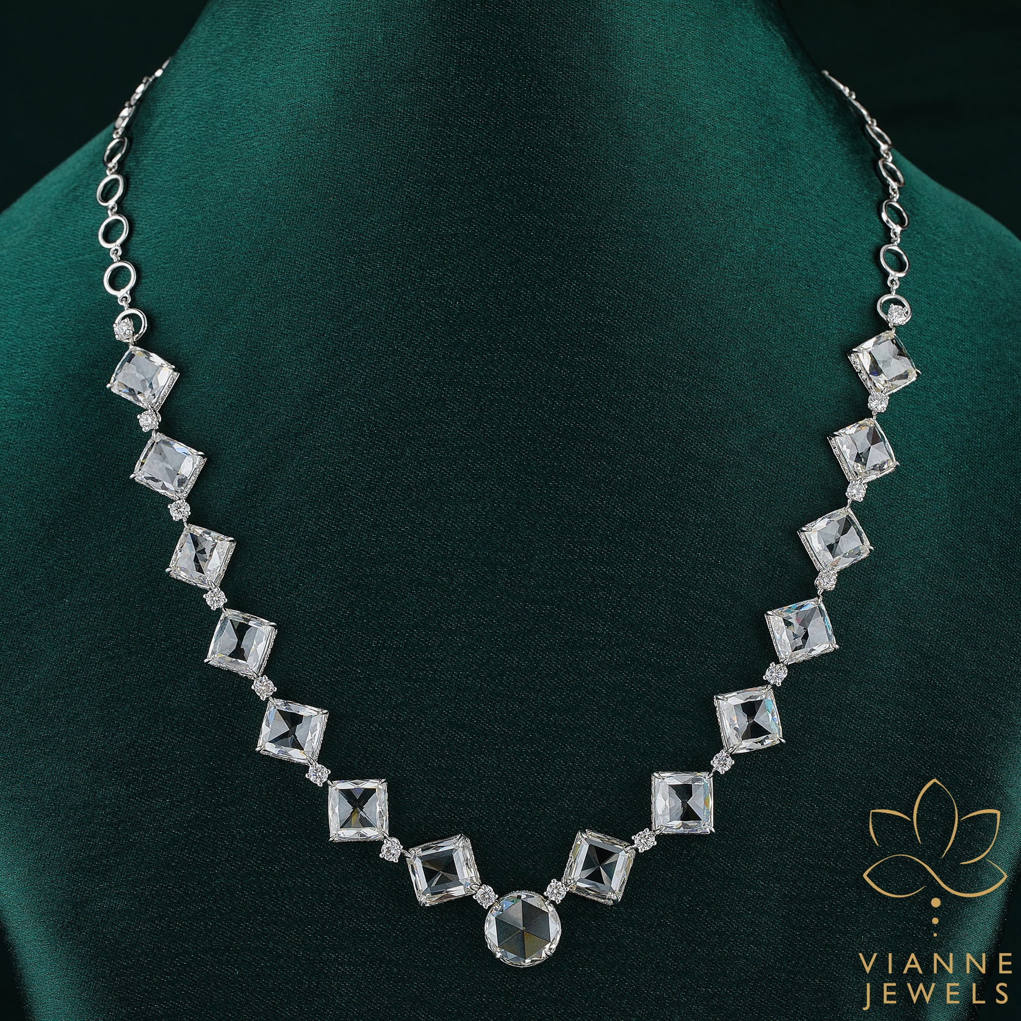 Each diamond in this piece has been chosen for its clarity and precision cut, ensuring that the necklace sparkles from every angle. The geometric settings are a nod to contemporary art and architecture, making this piece an avant-garde addition to any jewelry collection. The necklace is designed to lie gracefully along the collarbone, making a statement without overwhelming.