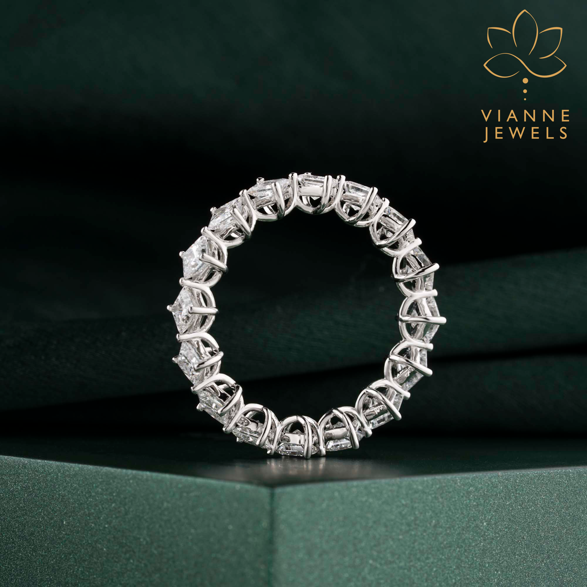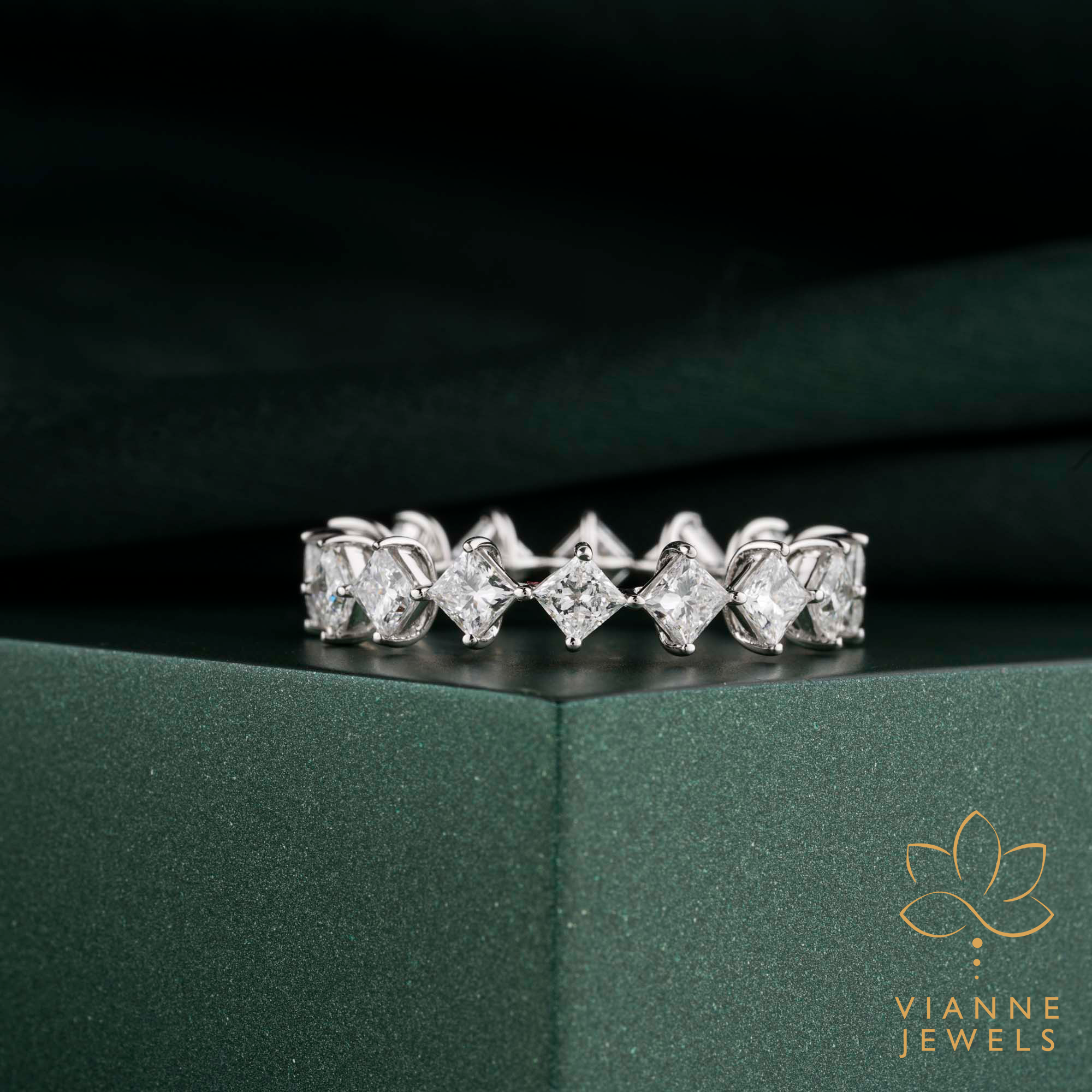 “Introducing our Geometric Sparkle Lab-Grown Diamond Eternity Band, an embodiment of modern elegance and precision. This distinctive ring features a full circle of lab-grown diamonds, each cut into unique geometric shapes and meticulously set in a polished white gold band. The result is a ring that catches the light from every angle, offering a dazzling display of fire and brilliance.