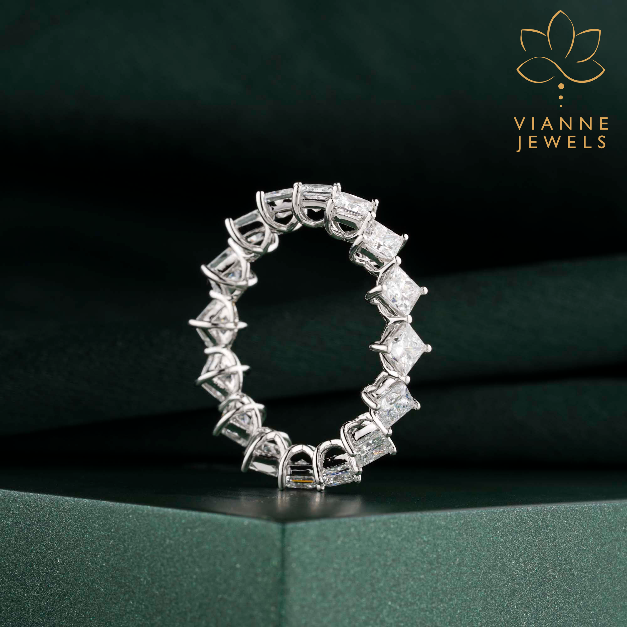 “Adorn your hand with this geometrically inspired eternity band, featuring a continuous circle of lab-grown diamonds set in a chic white gold design. It’s a fusion of modern aesthetics and timeless romance.”