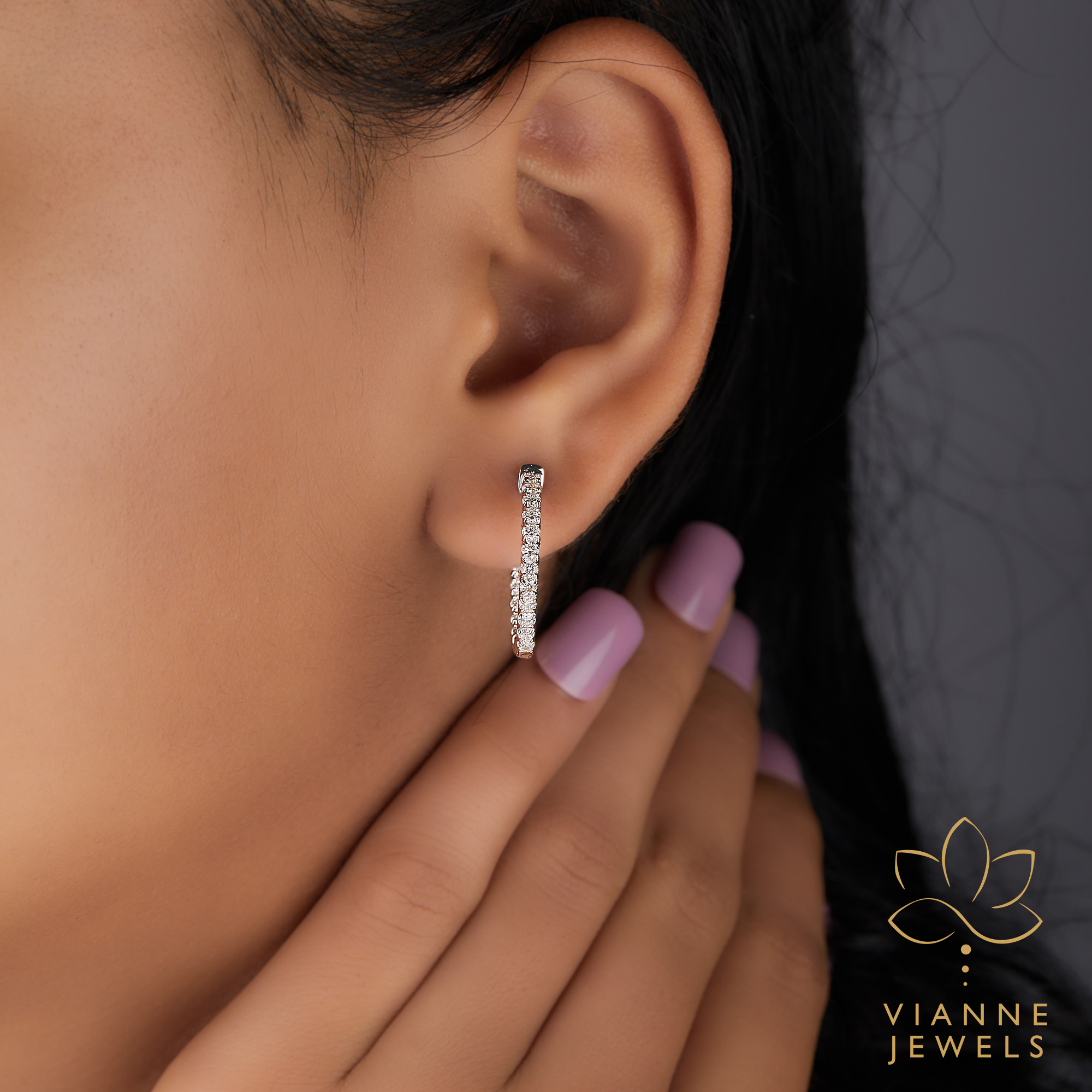 “Delight in the timeless elegance of our ‘Glistening Hoop Dreams’ earrings, a pair that redefines the classic hoop with a modern and sustainable twist. Each earring is meticulously adorned with a row of brilliant lab-grown diamonds, offering an endless loop of luster and a lightweight feel for comfortable daily wear.