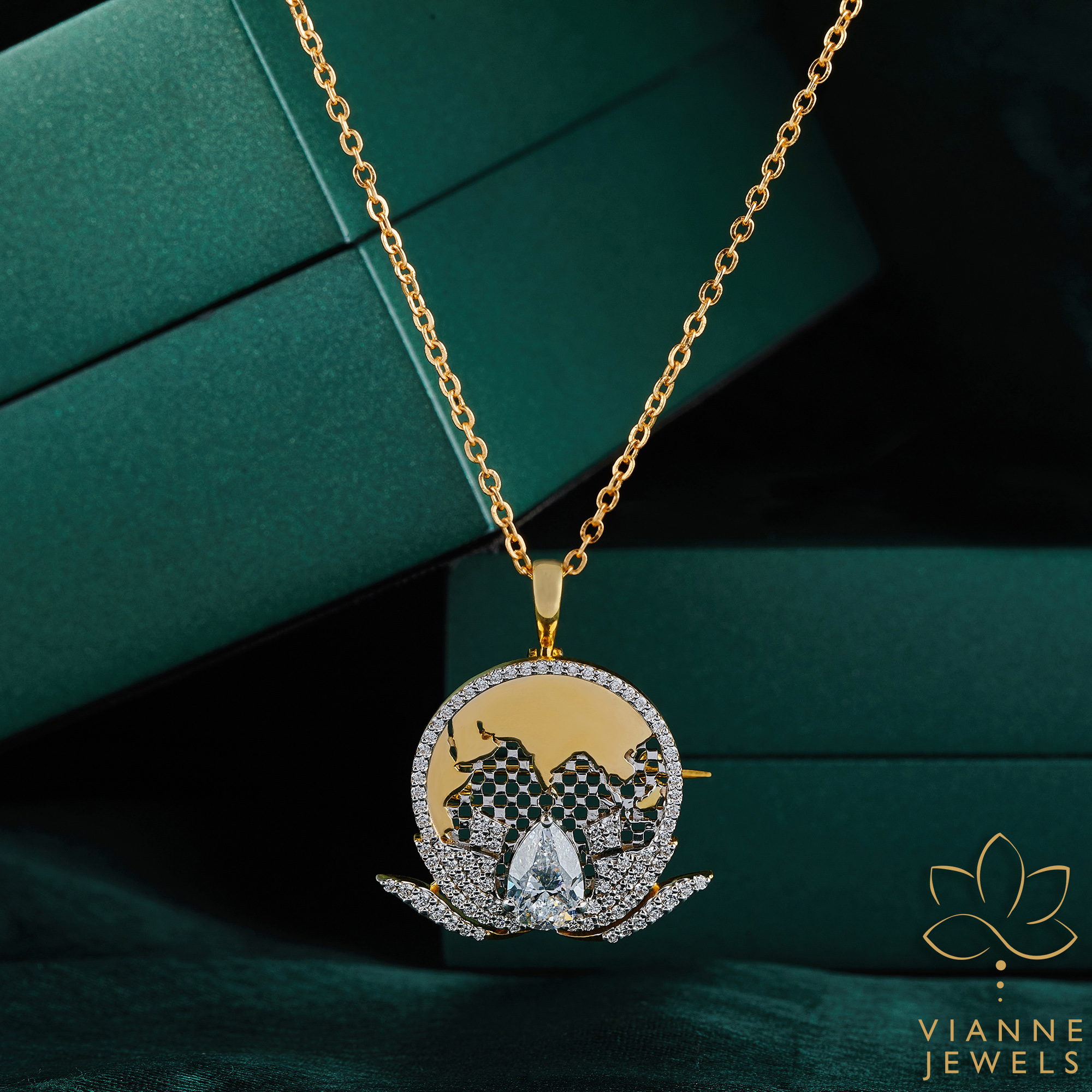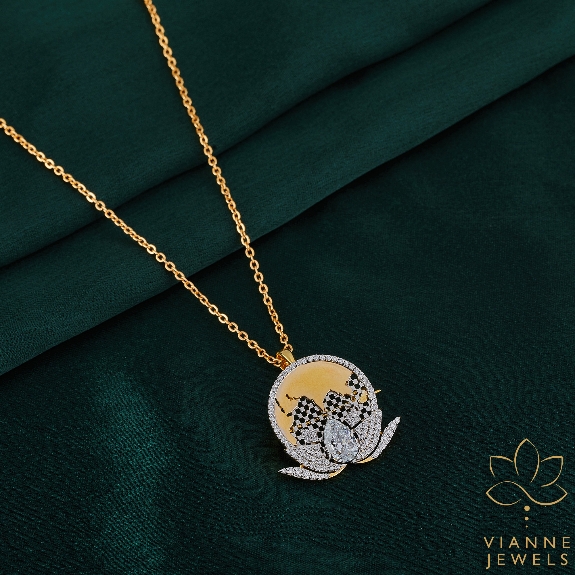 - Worldly Design: The centerpiece is a beautifully crafted golden silhouette of the world map, ensconced within a sparkling diamond halo, symbolizing a global connection.