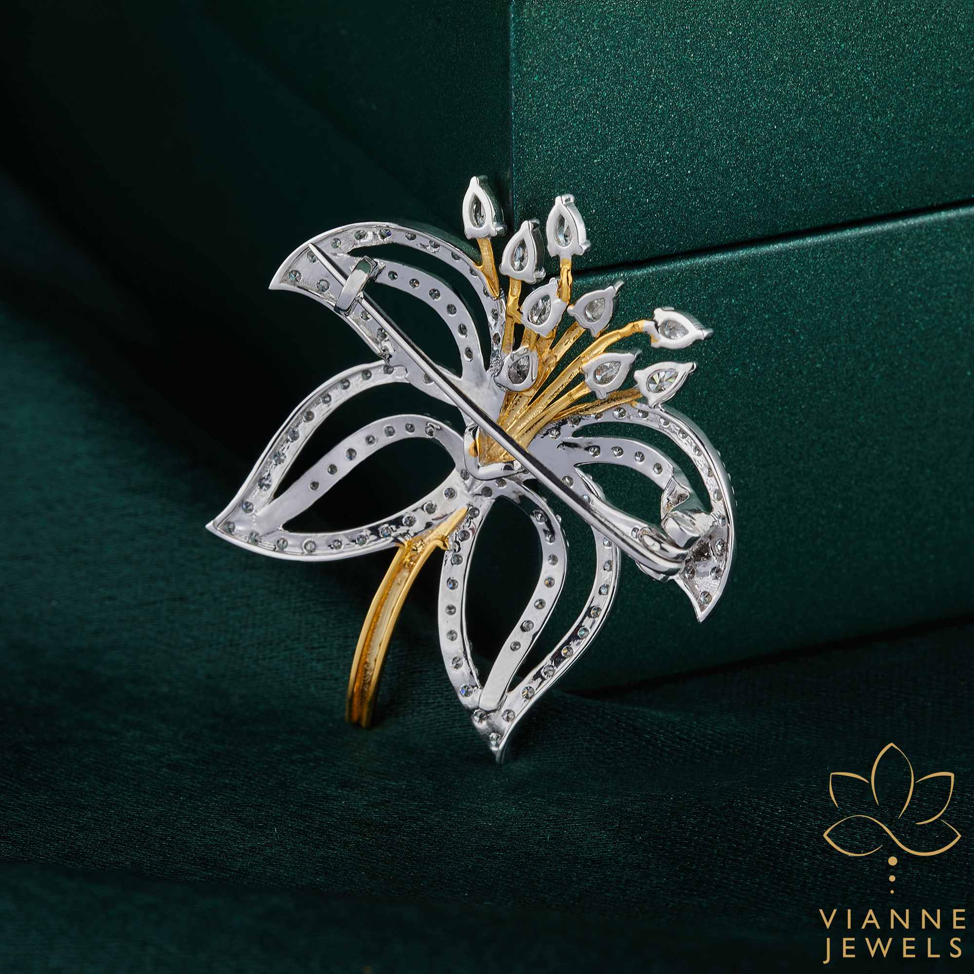 - Dual-Tone Craftsmanship: This brooch showcases a beautiful contrast with its silver-tone diamond-studded petals and golden stems, offering a modern twist on a classic design.