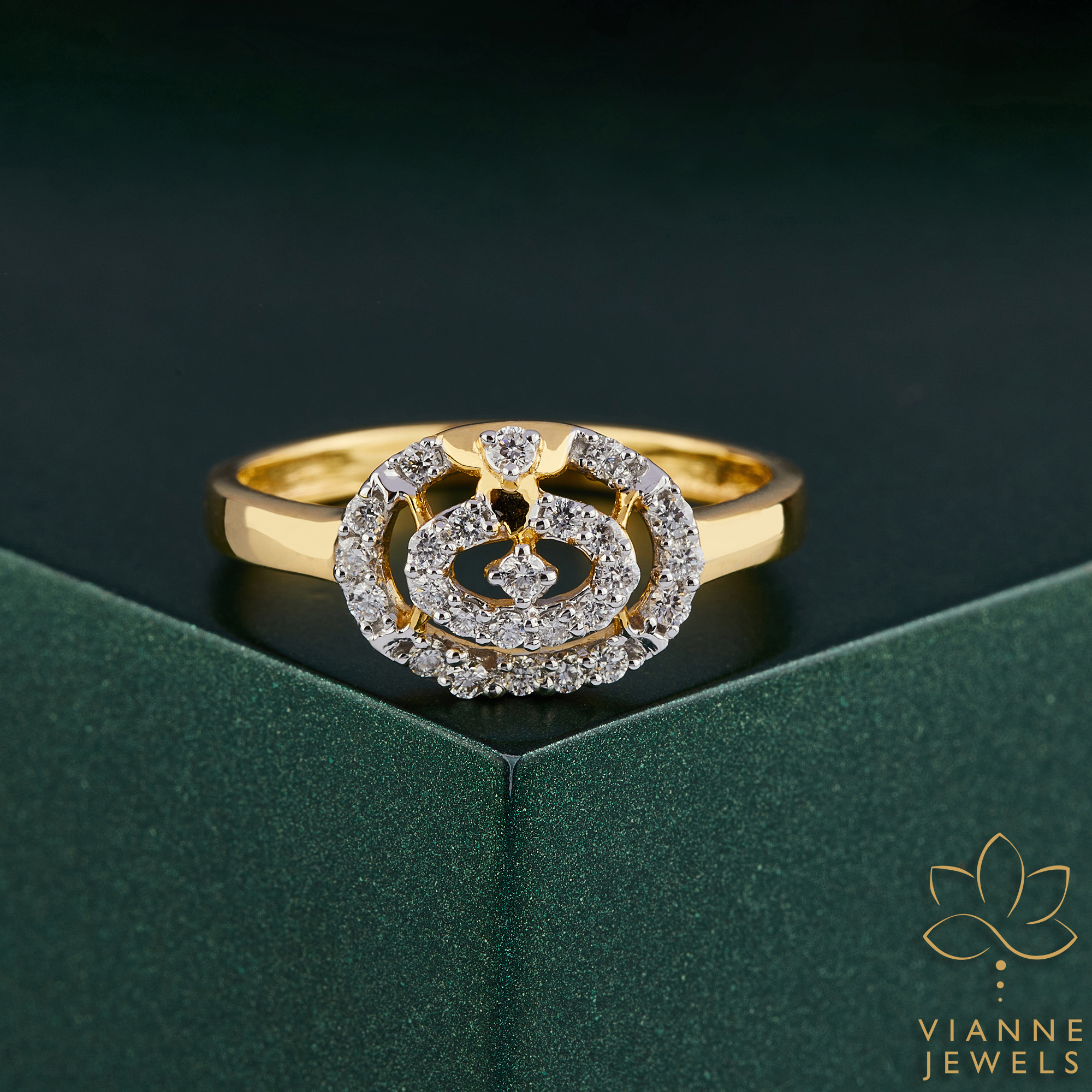 “Introducing the Golden Harmony Circle Ring – a masterpiece that captures the essence of balance and beauty. This ring is a testament to modern craftsmanship, blending the time-honored allure of 14K yellow gold with the innovation of lab-grown diamonds. The focal point is a mesmerizing pattern of concentric circles, symbolizing unity and eternity, each circle adorned with dazzling lab-grown diamonds that catch the light with every movement.