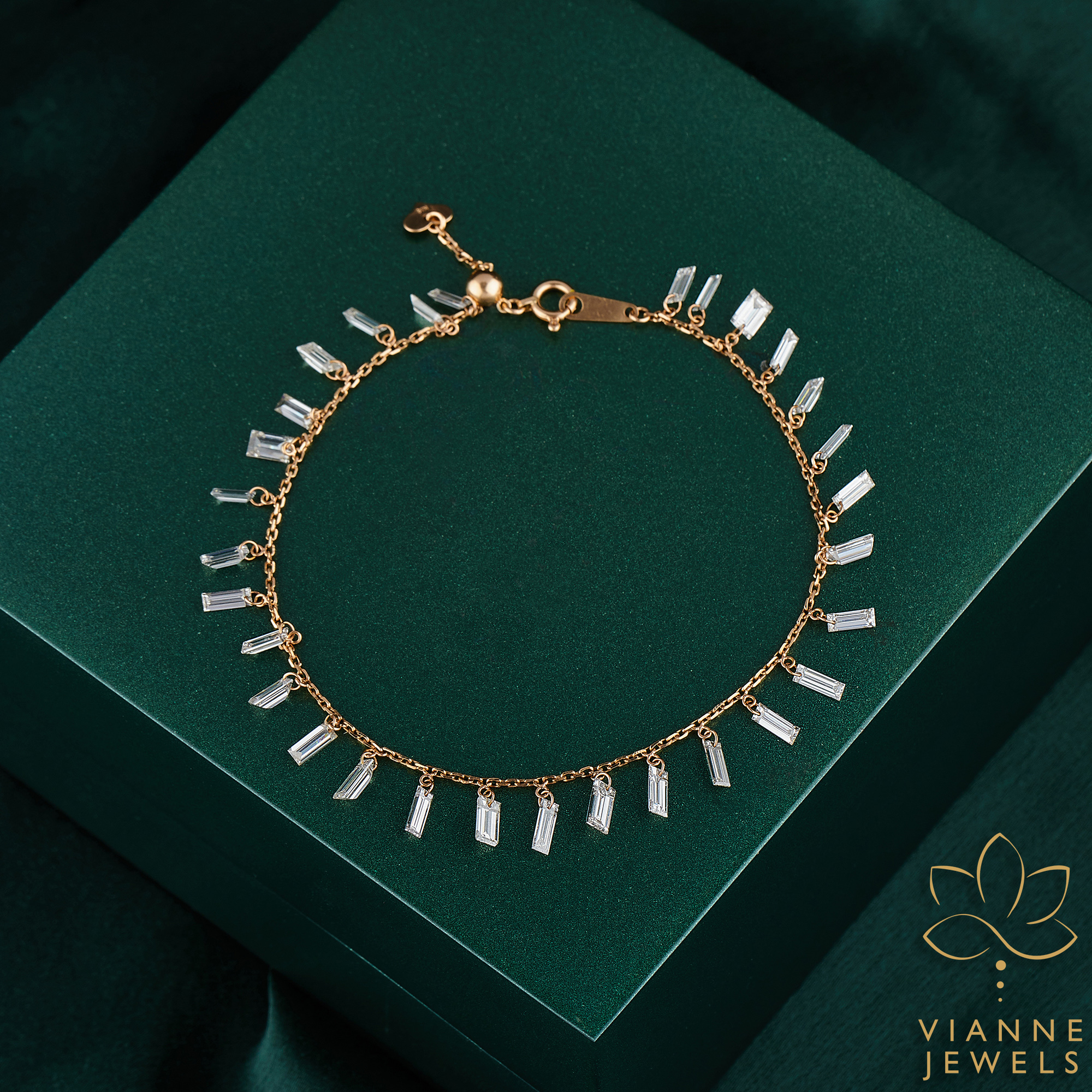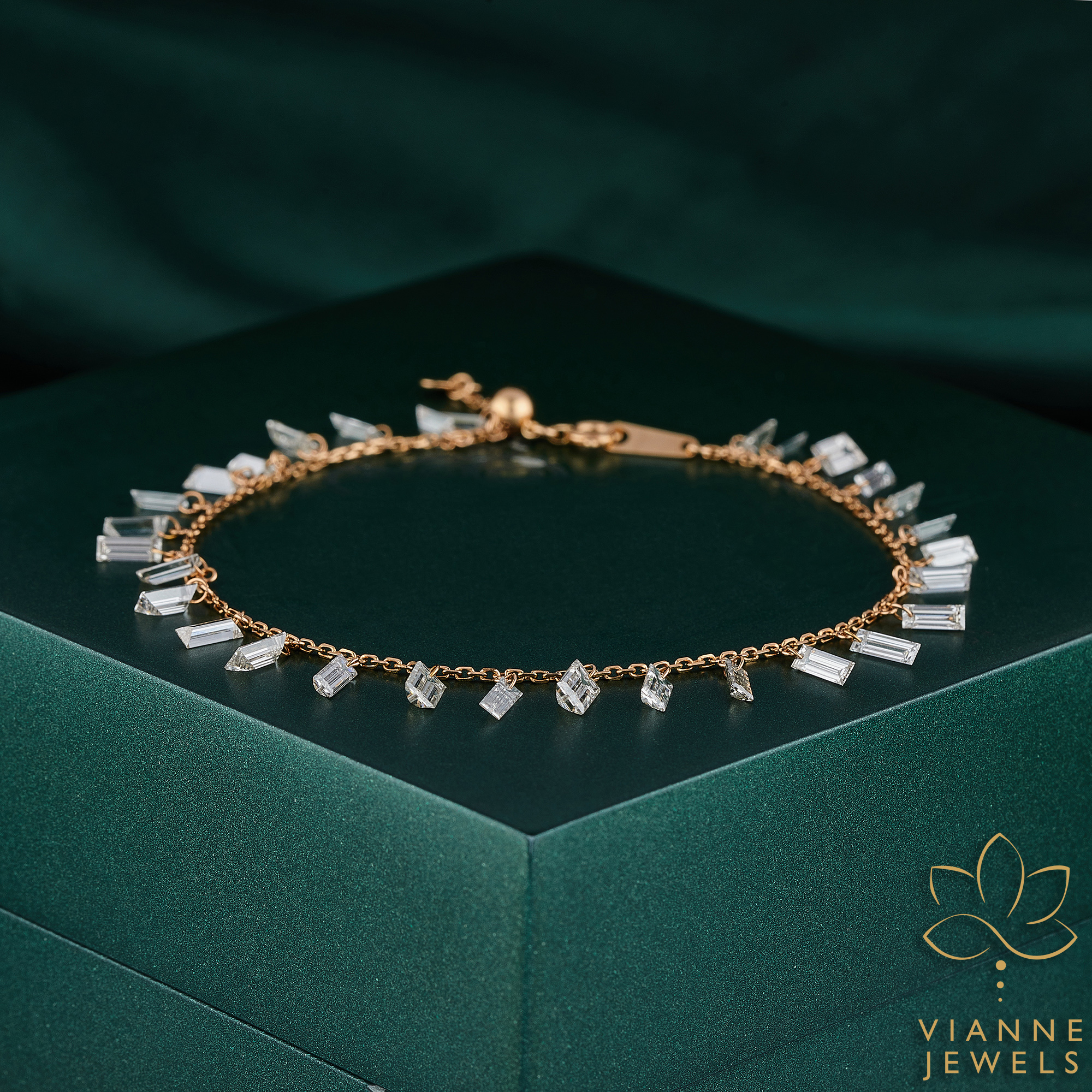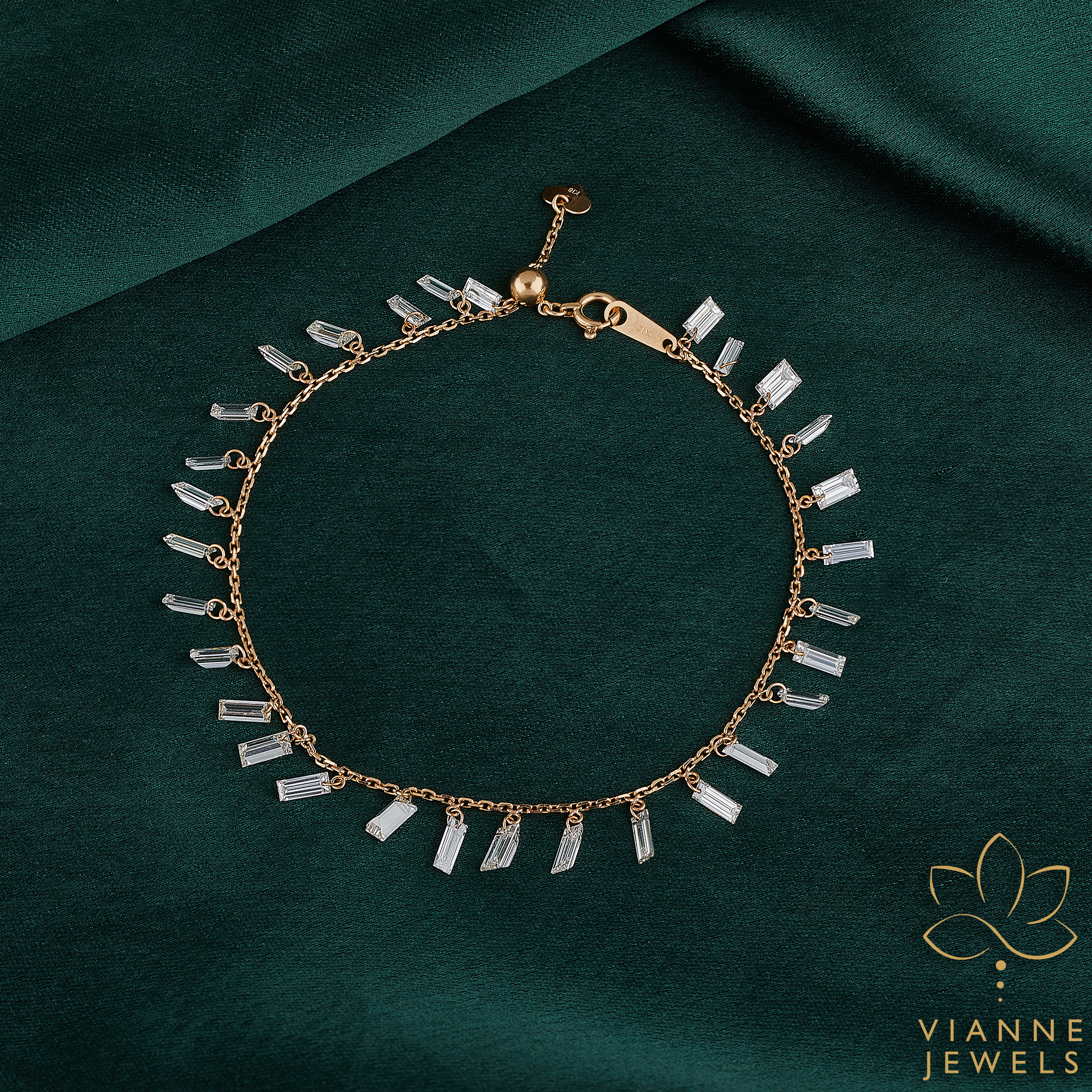 “Our Golden Luminescence Fringe Bracelet is a captivating piece that combines the timeless beauty of diamonds with the warm radiance of 18K gold. Each lab-grown diamond is masterfully cut to exhibit stunning brilliance and is meticulously hung like a miniature chandelier from the gold chain, creating a fringe that sways elegantly with your movements.