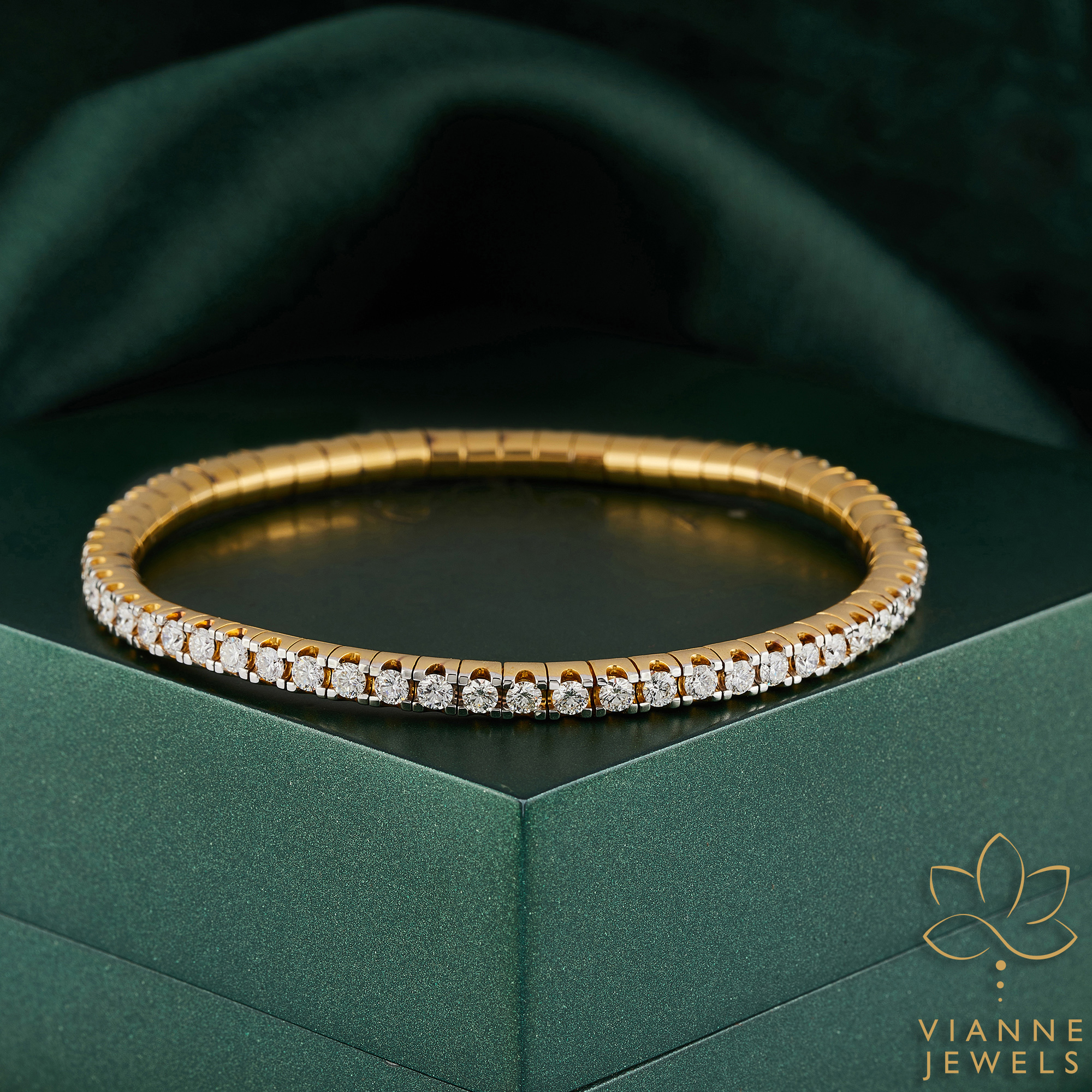 “The Golden Radiance Tennis Bracelet is a symphony of meticulous design and sustainable luxury. This exquisite piece features a seamless row of lab-grown diamonds, each one expertly selected and set within a polished 18K yellow gold band that exudes warmth and sophistication.