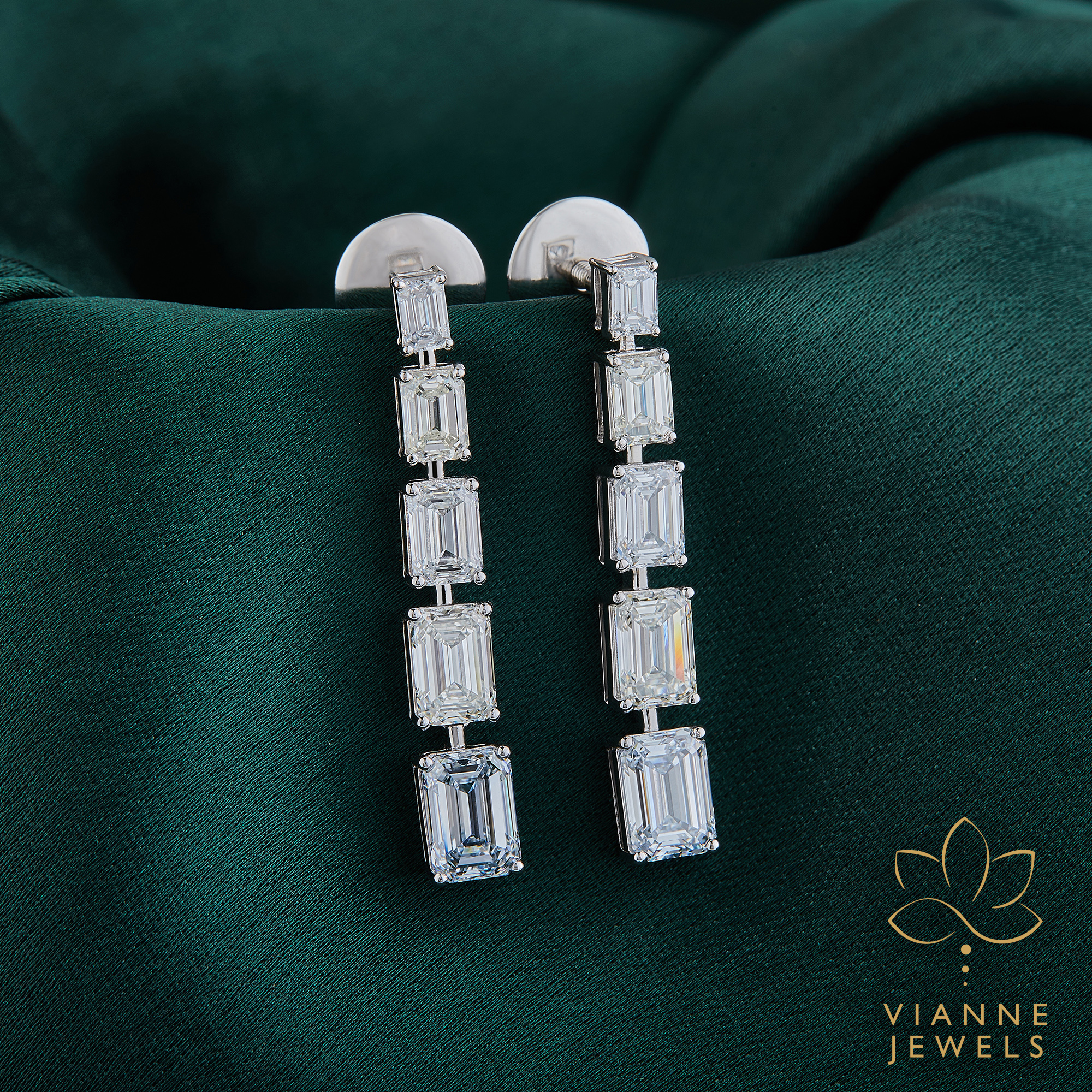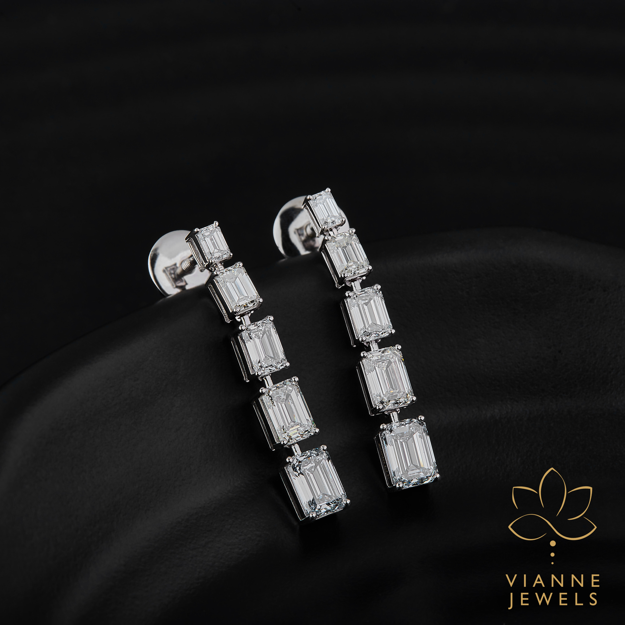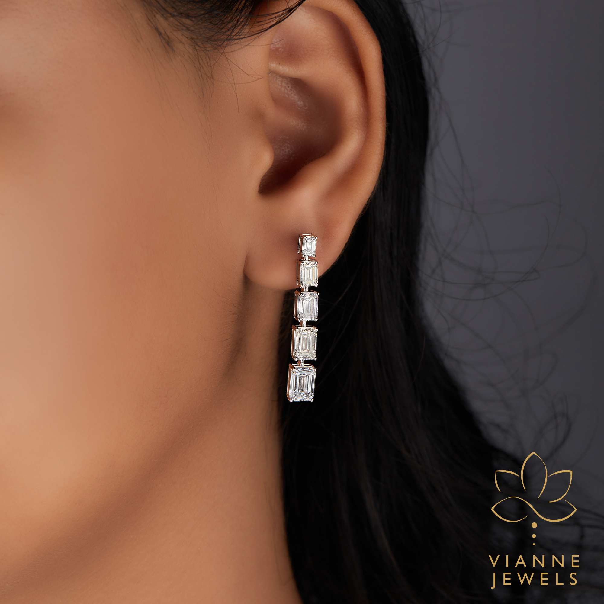 “Introducing our Linear Luxe Earrings, the embodiment of contemporary elegance and refined taste. These earrings are a true masterpiece, each showcasing a vertical array of emerald-cut lab-grown diamonds that exude sophistication. The precision of the emerald cut brings out the clarity and architectural beauty of each diamond, while the linear drop design creates a stunning visual elongation that enhances any neckline.