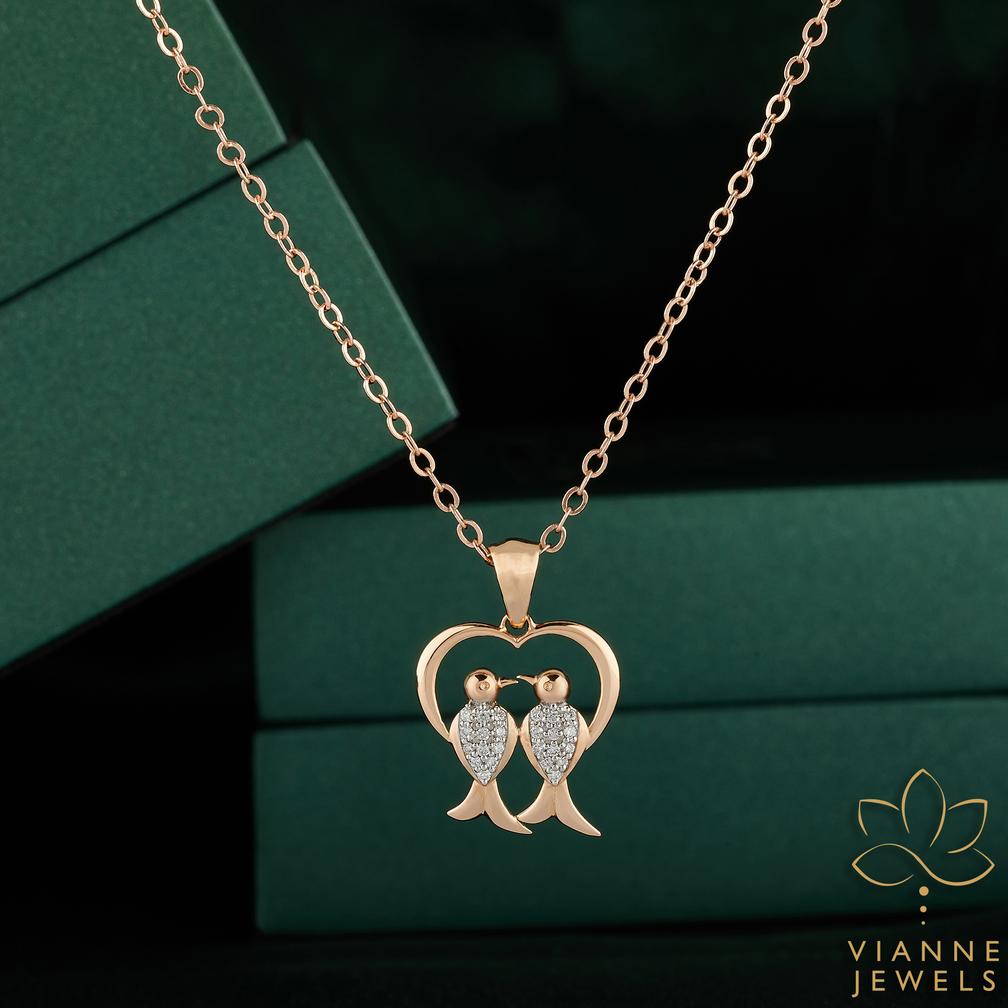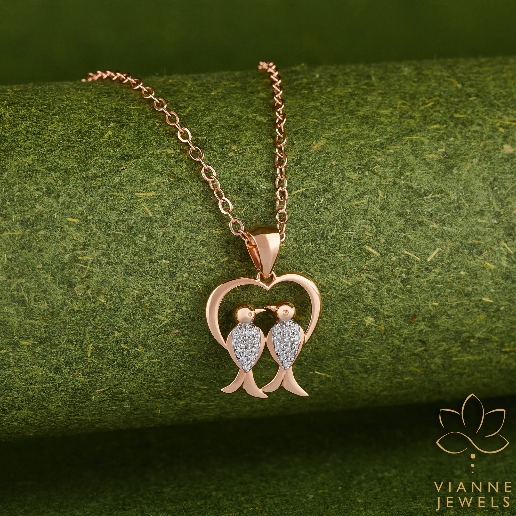 “Cherish an eternal bond with our Rose Gold Lovebirds Pendant, adorned with shimmering lab-grown diamonds, encapsulating a tale of romance and companionship.”