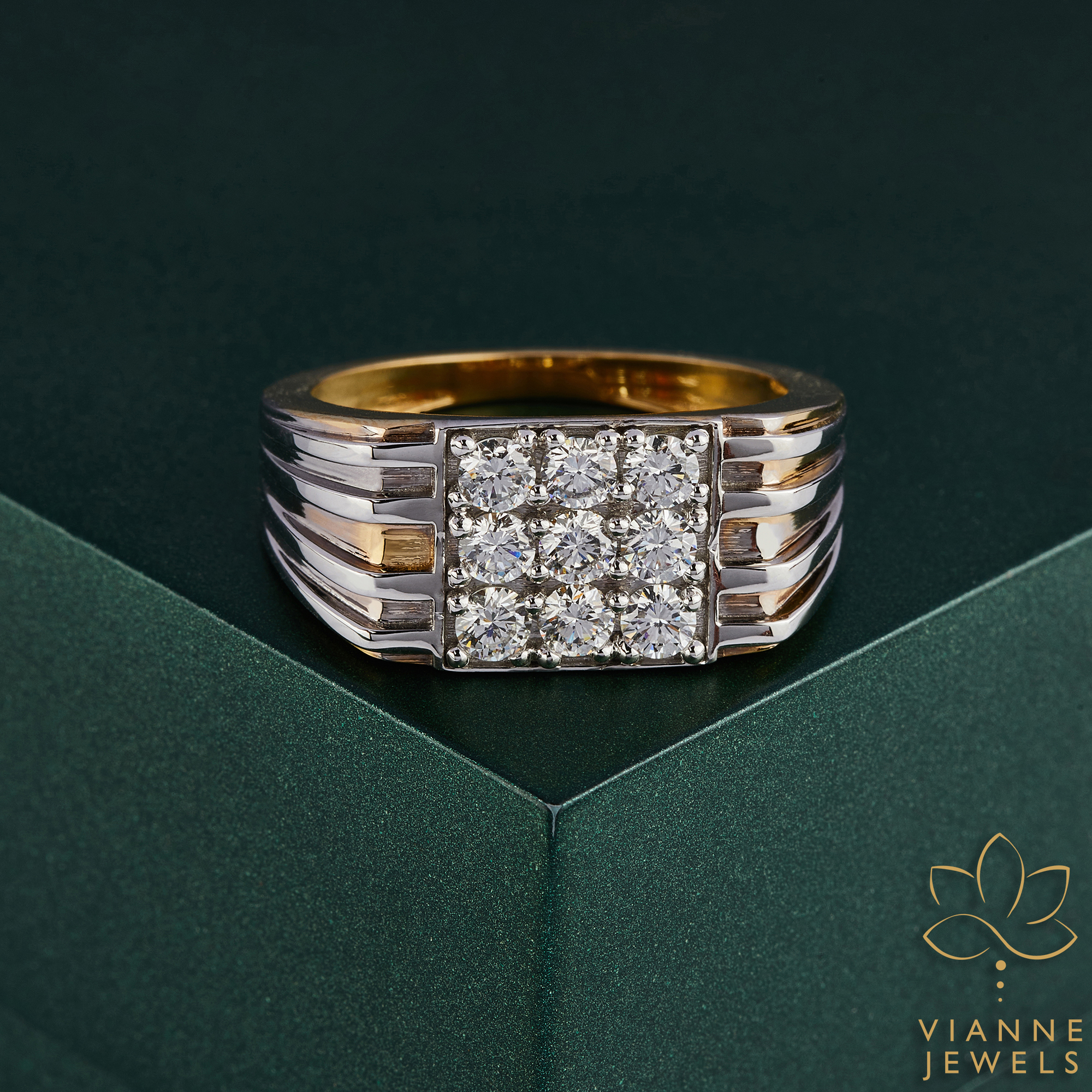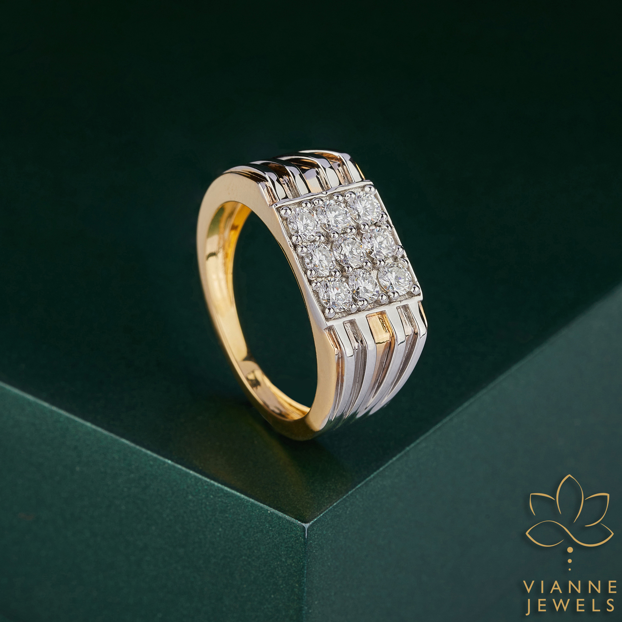 “Behold the ‘Luminous Gridwork’ ring – a celebration of contemporary design and innovative craftsmanship. This stunning piece features a 14K yellow gold band with a striking contrast inlay of white gold, creating a harmonious balance between warm and cool tones. The centrepiece is a meticulously arranged grid of lab-grown diamonds, offering a modern twist on classic luxury.