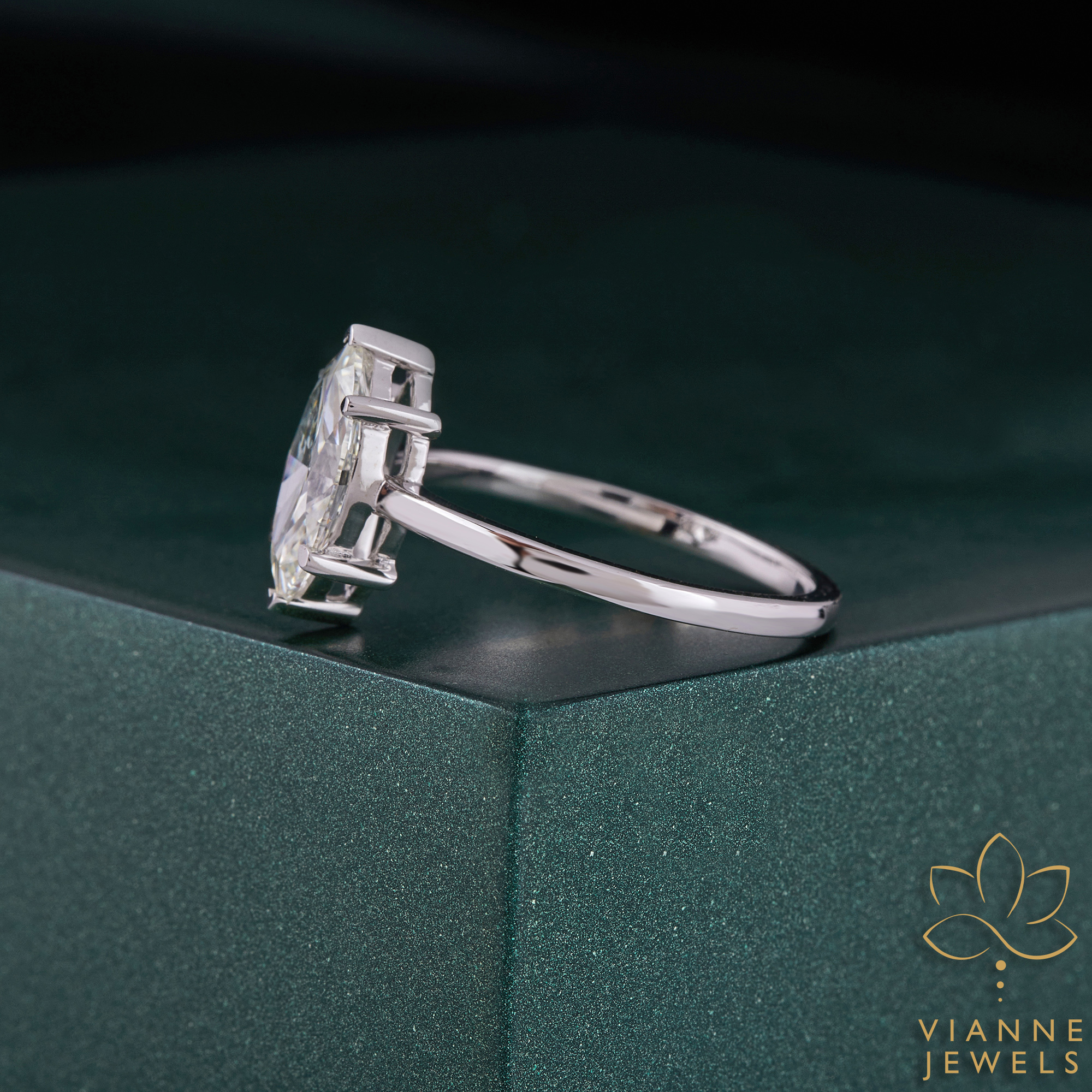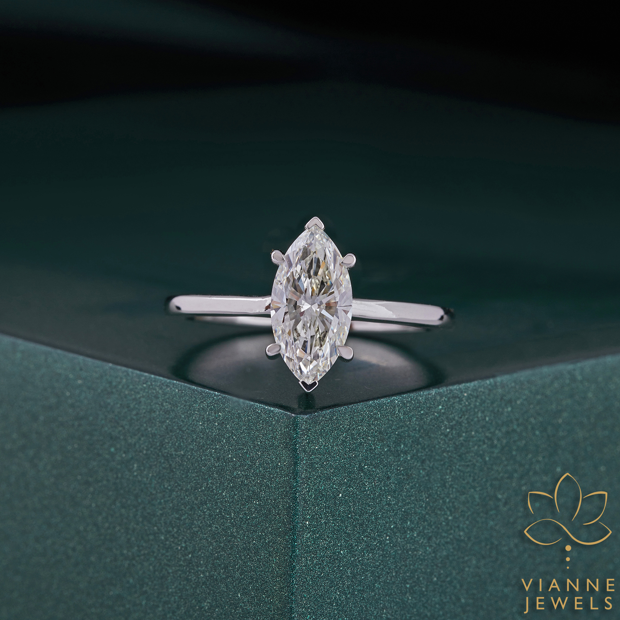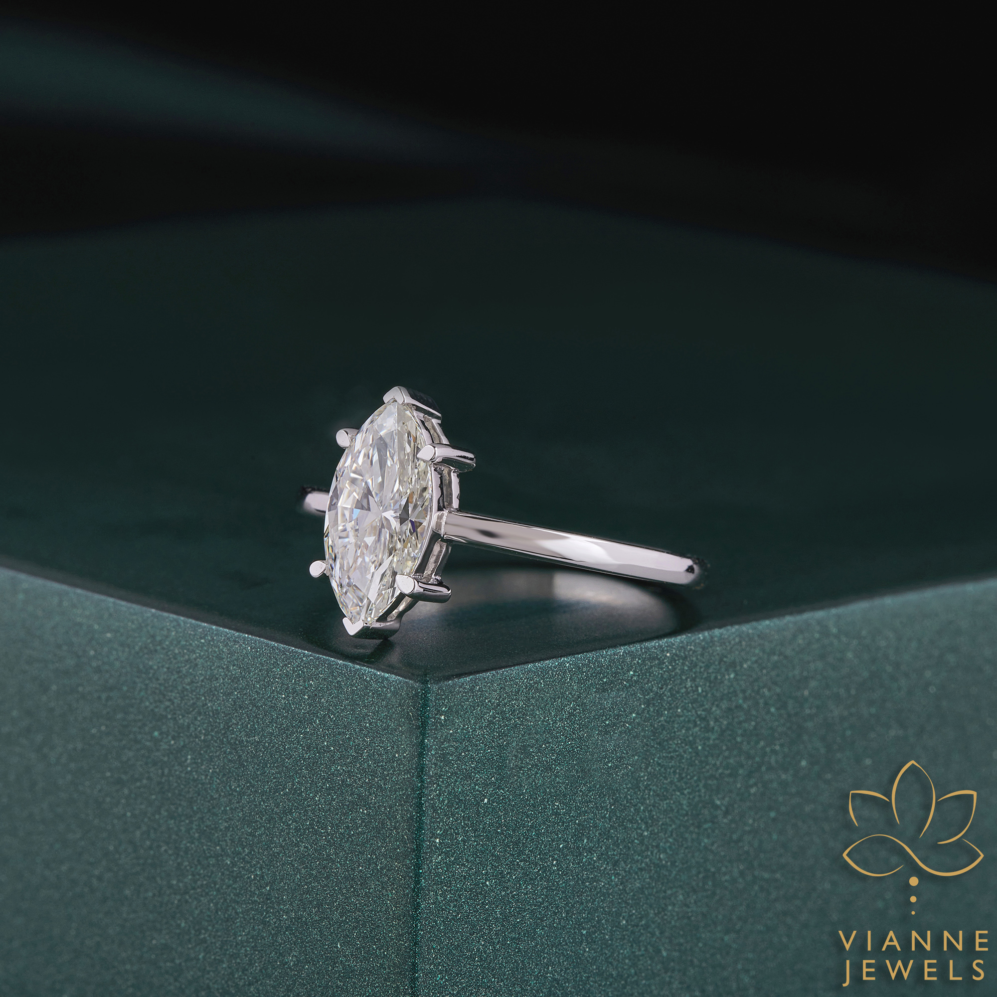 Our “Lustrous Apex” ring is crafted for the connoisseur of modern elegance. At its zenith, a beautifully proportioned marquise lab-grown diamond captures the light, its pointed ends creating a lengthening effect on the finger. The diamond, known for its boat-like shape, offers a distinct visual appeal with its elongated form and brilliant faceting pattern.