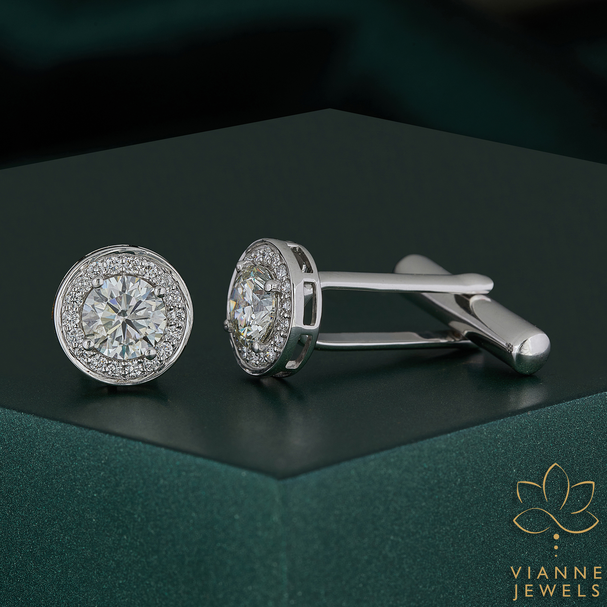 Discover the epitome of refined style with our “Luxe Halo” cufflinks—a testament to both modern innovation and classic design. Each cufflink centers around a lab-grown diamond that mimics the clarity and brilliance of the finest natural stones. This central gem is surrounded by a halo of delicately set, smaller diamonds, creating an effect of radiant light and sophistication.