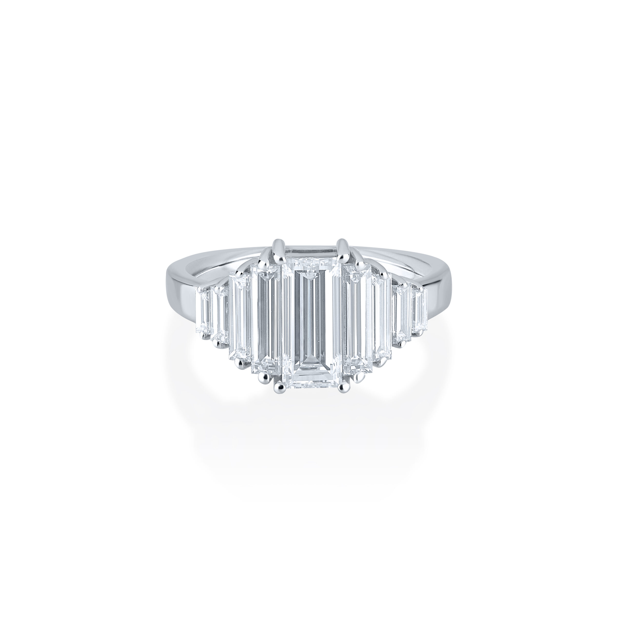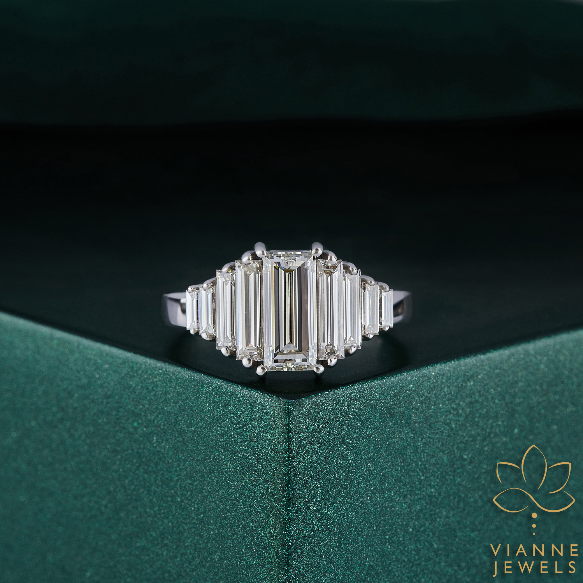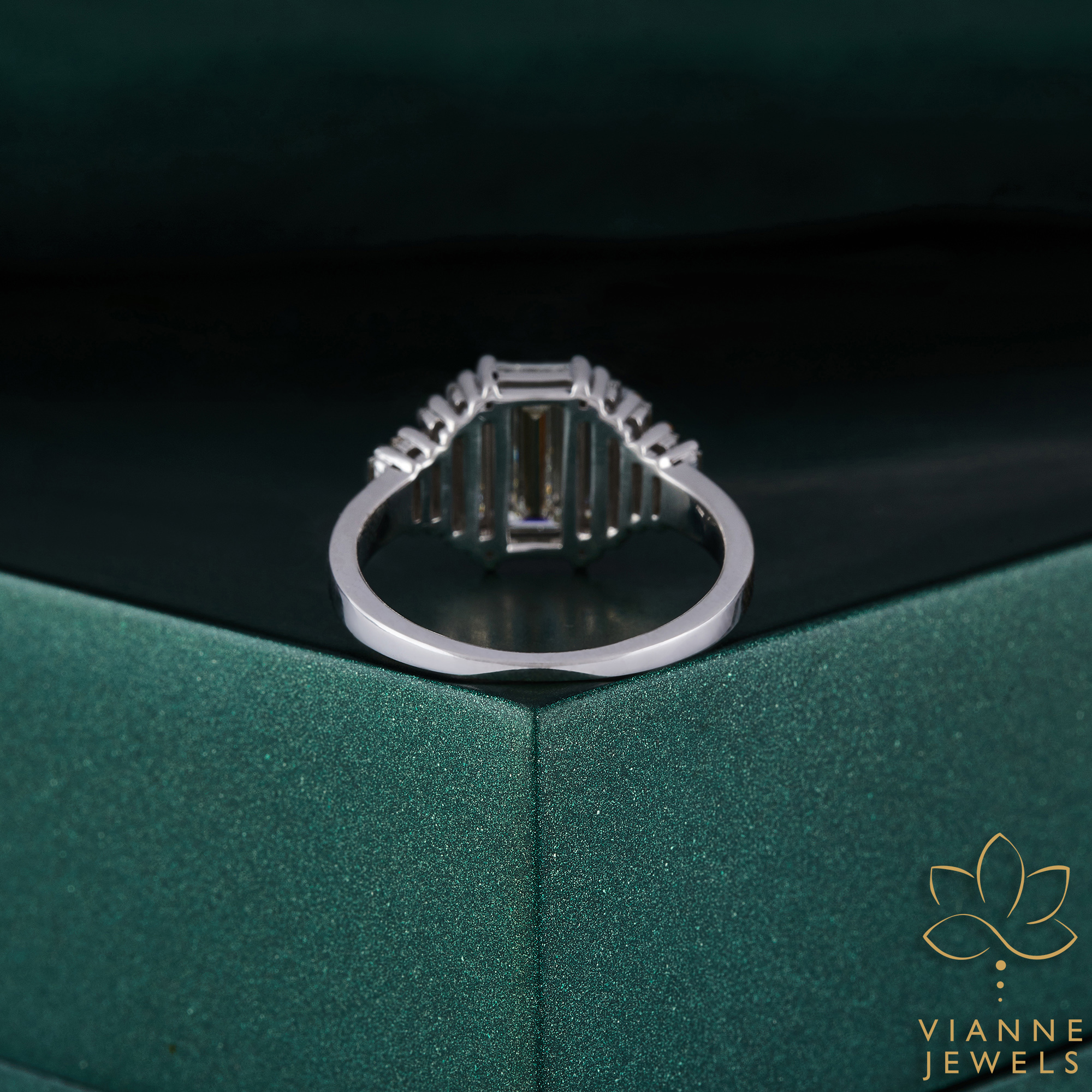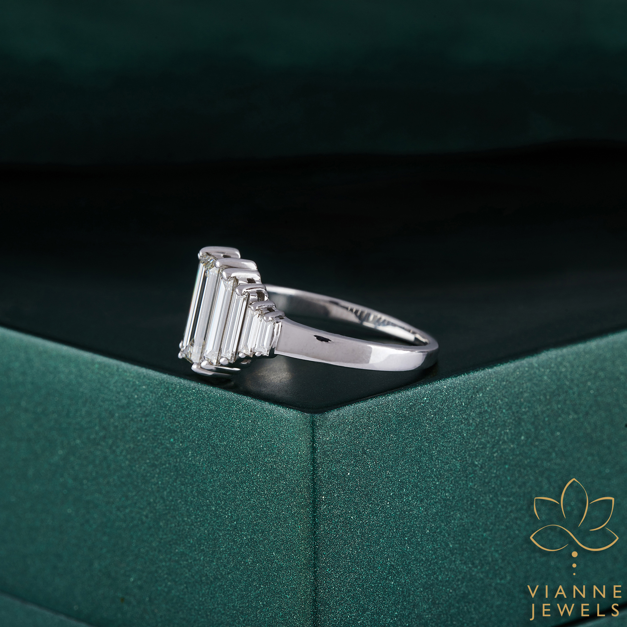 Each diamond is skillfully arranged to create a continuous stream of sparkle, symbolizing a love that is both endless and responsible. The diamonds are embraced by a band of premium 14K white gold, known for its durability and sleek, polished finish that adds to the ring’s modern appeal.