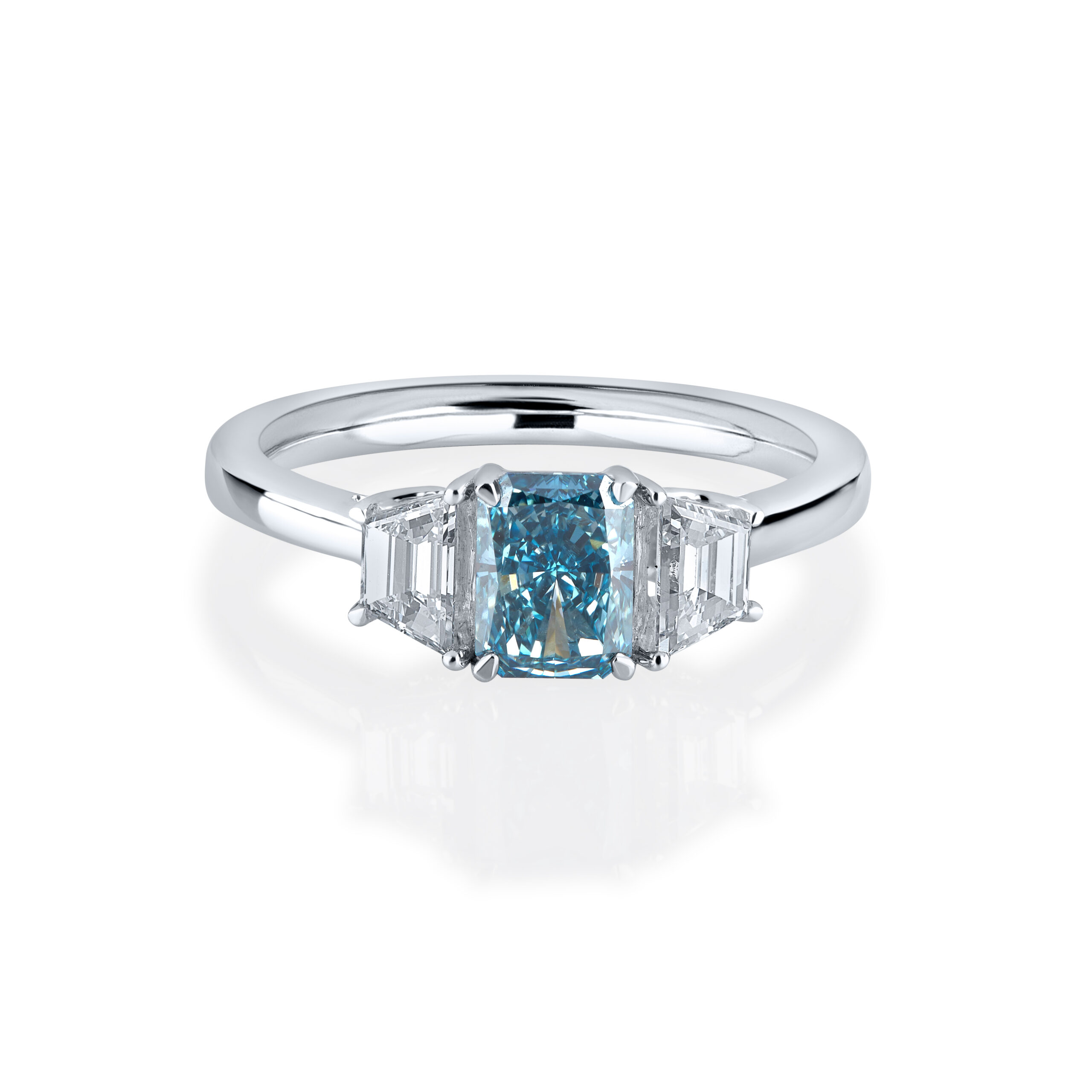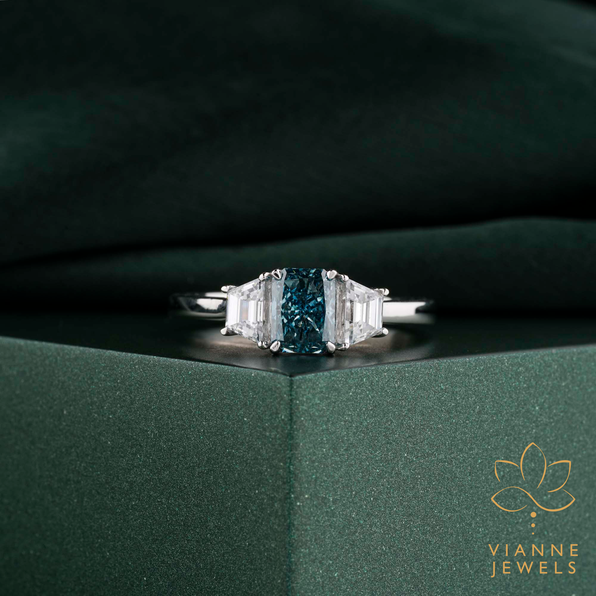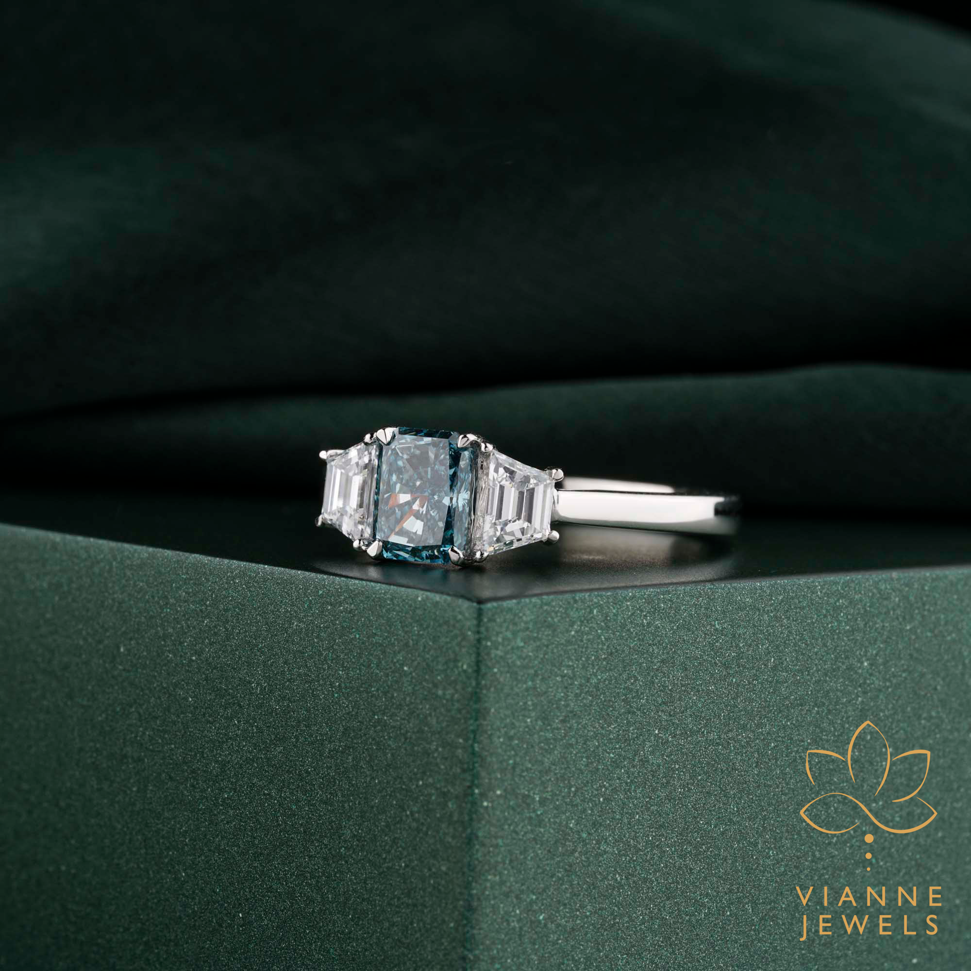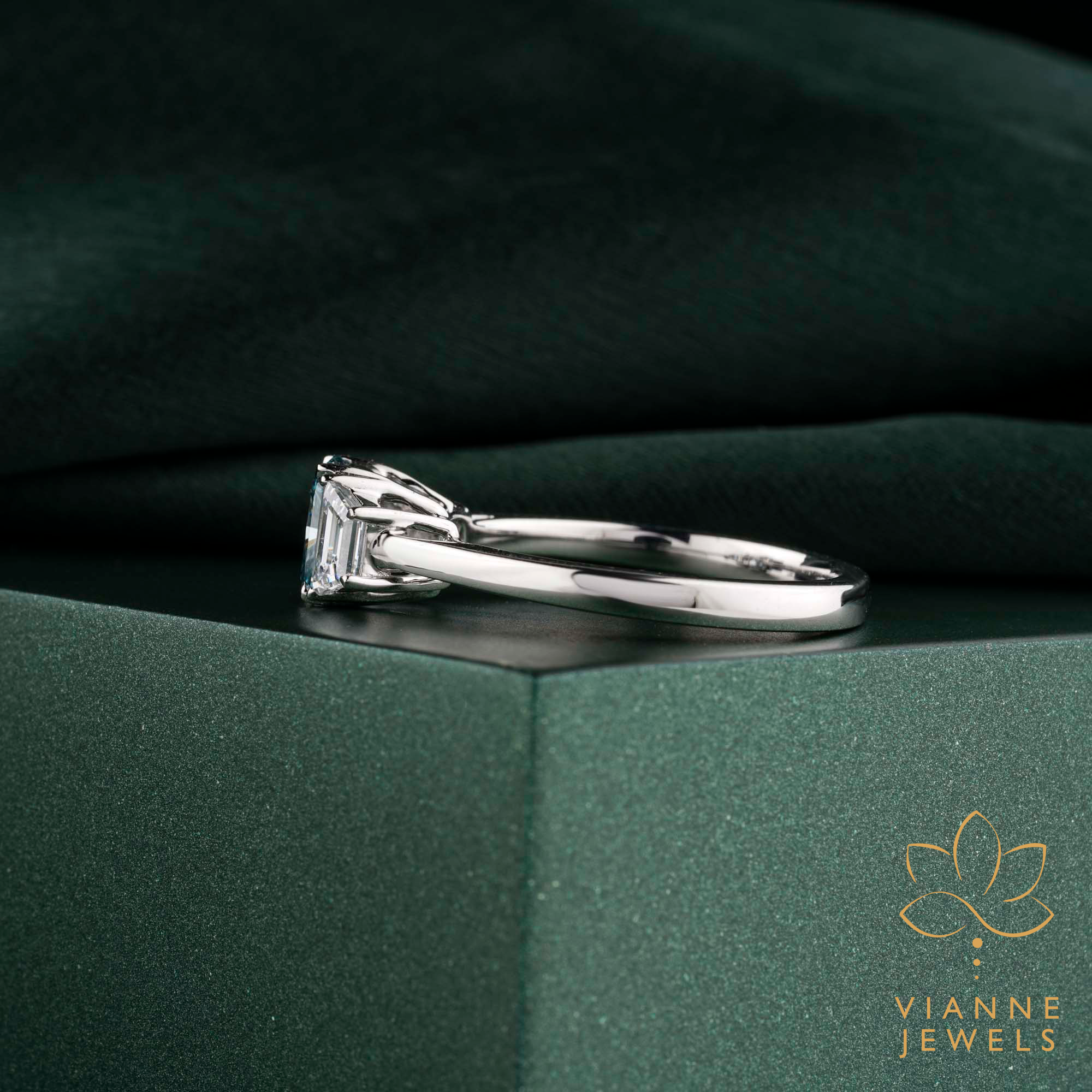 - Side Stones: Two Emerald-Cut Diamonds