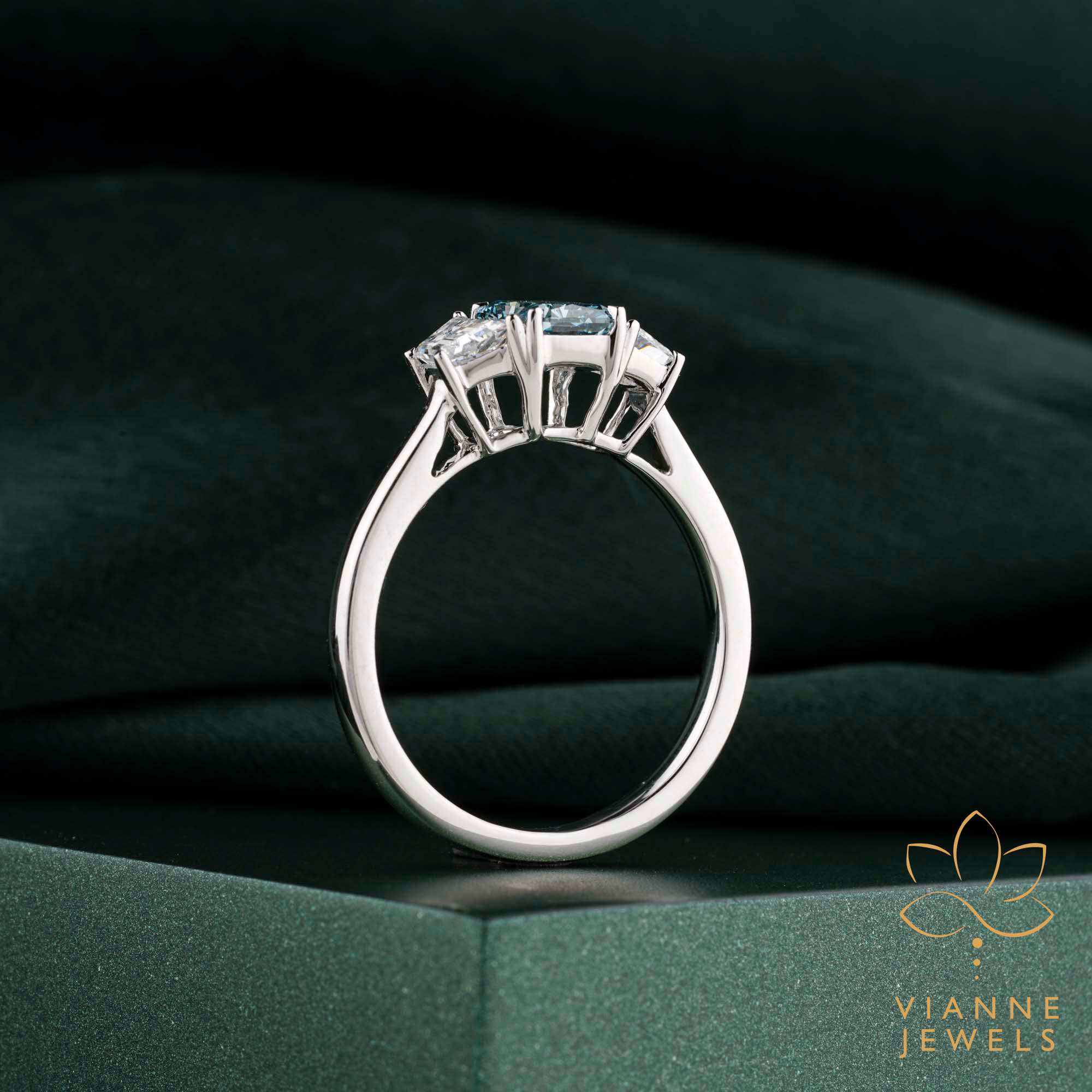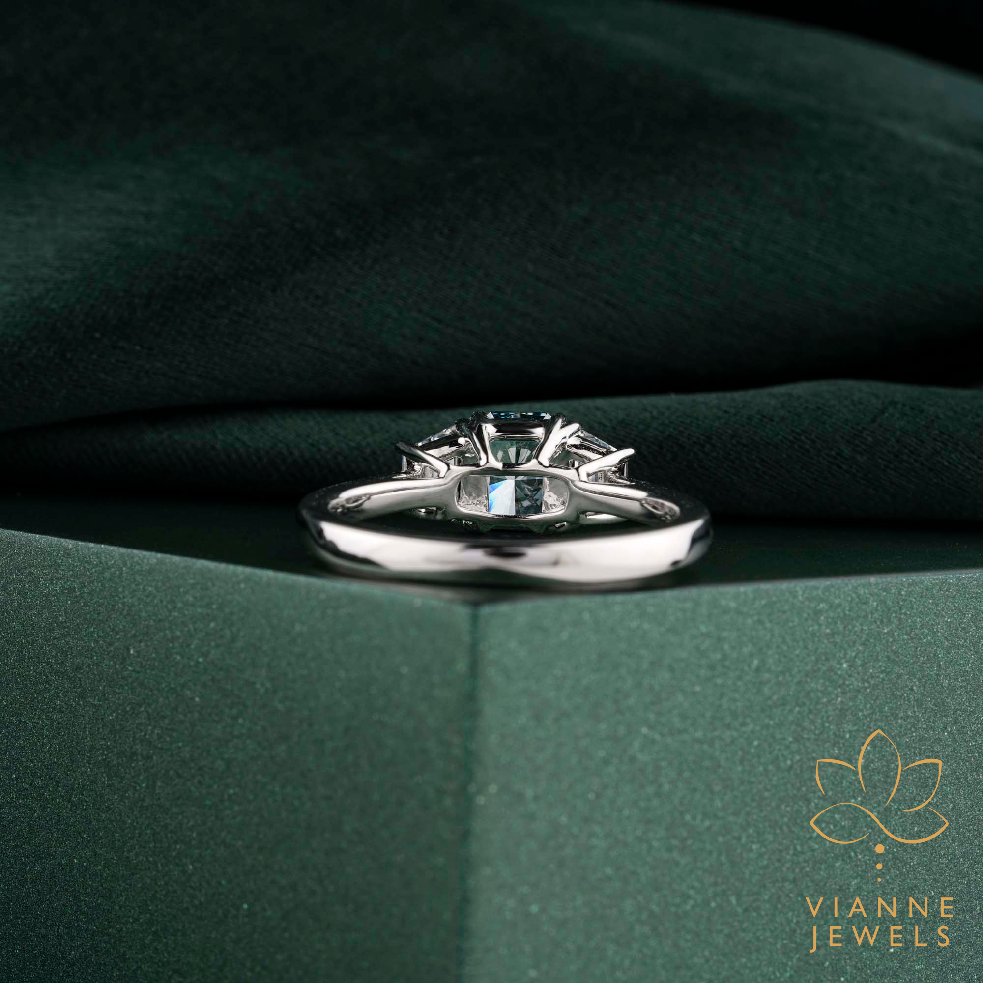 Design & Symbolism: The trilogy setting represents a couple’s past, present, and future, making it a profound emblem of your journey together. The aquamarine, with its soothing oceanic shade, embodies tranquility and clarity in your shared life.