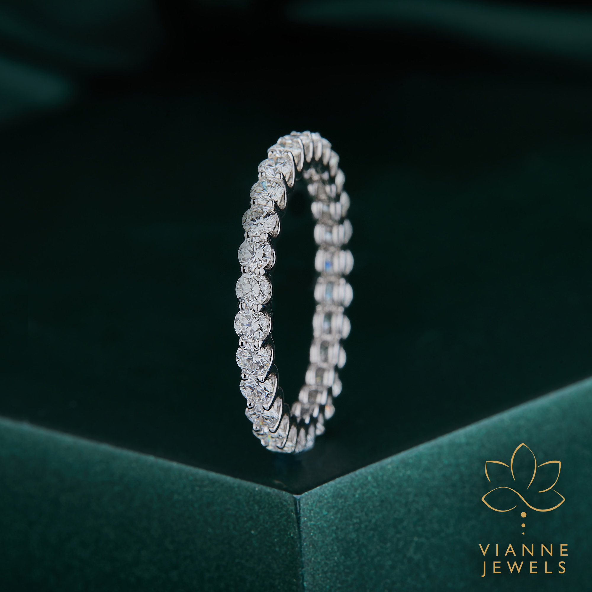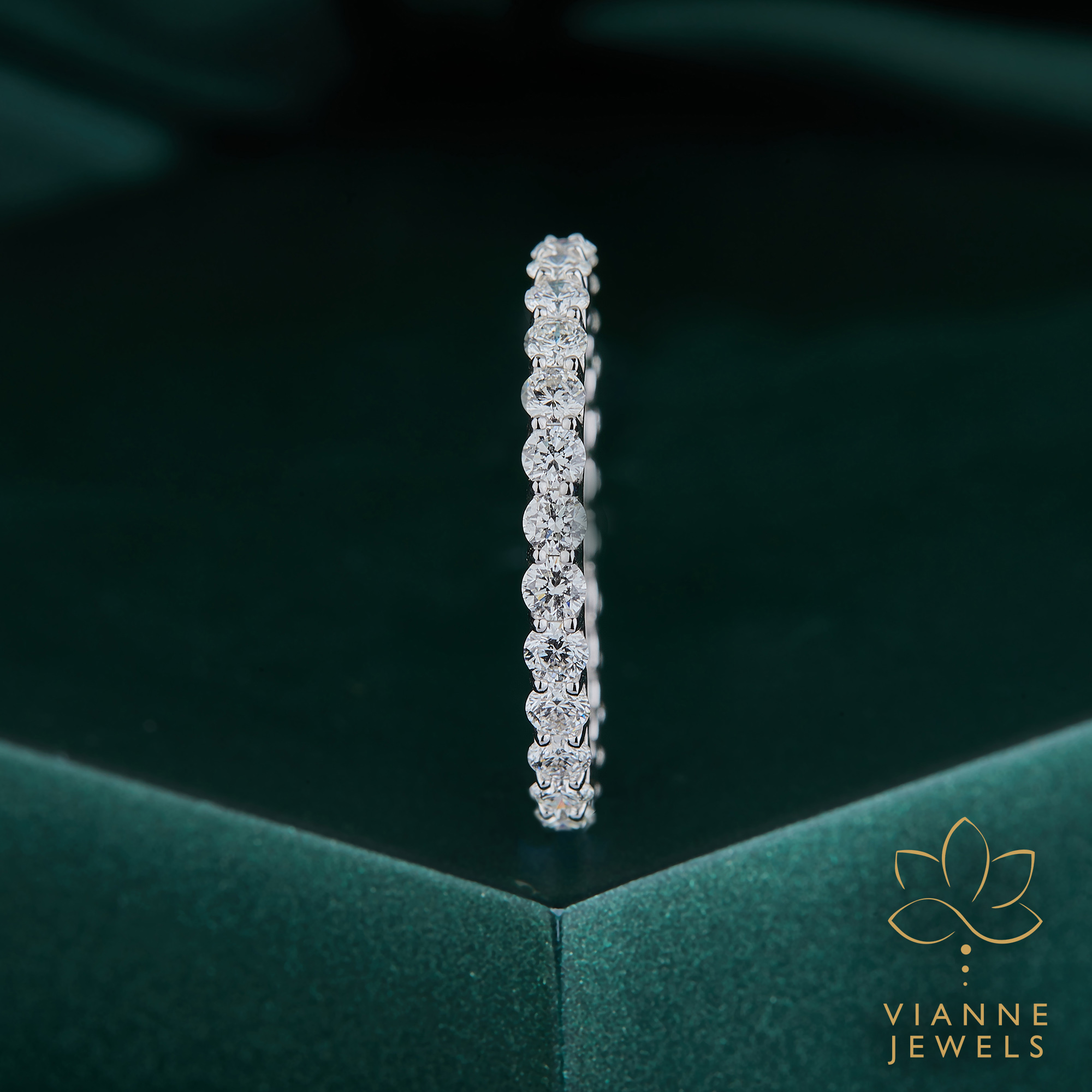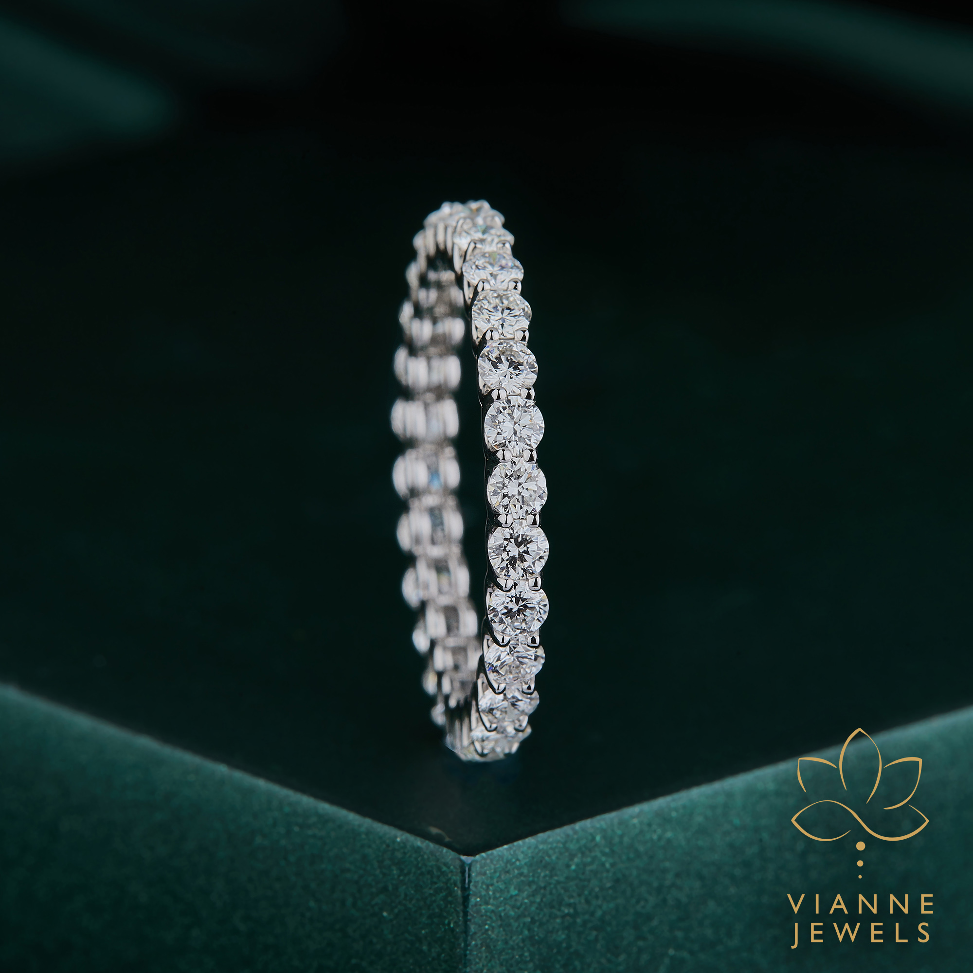 “Introducing the Petite Luxe Eternity Ring, where delicate design meets the brilliance of sustainable luxury. This ring is a symphony of light, created with a full circle of meticulously matched lab-grown diamonds, each one set with precision in a slim 14K white gold band that exudes elegance.