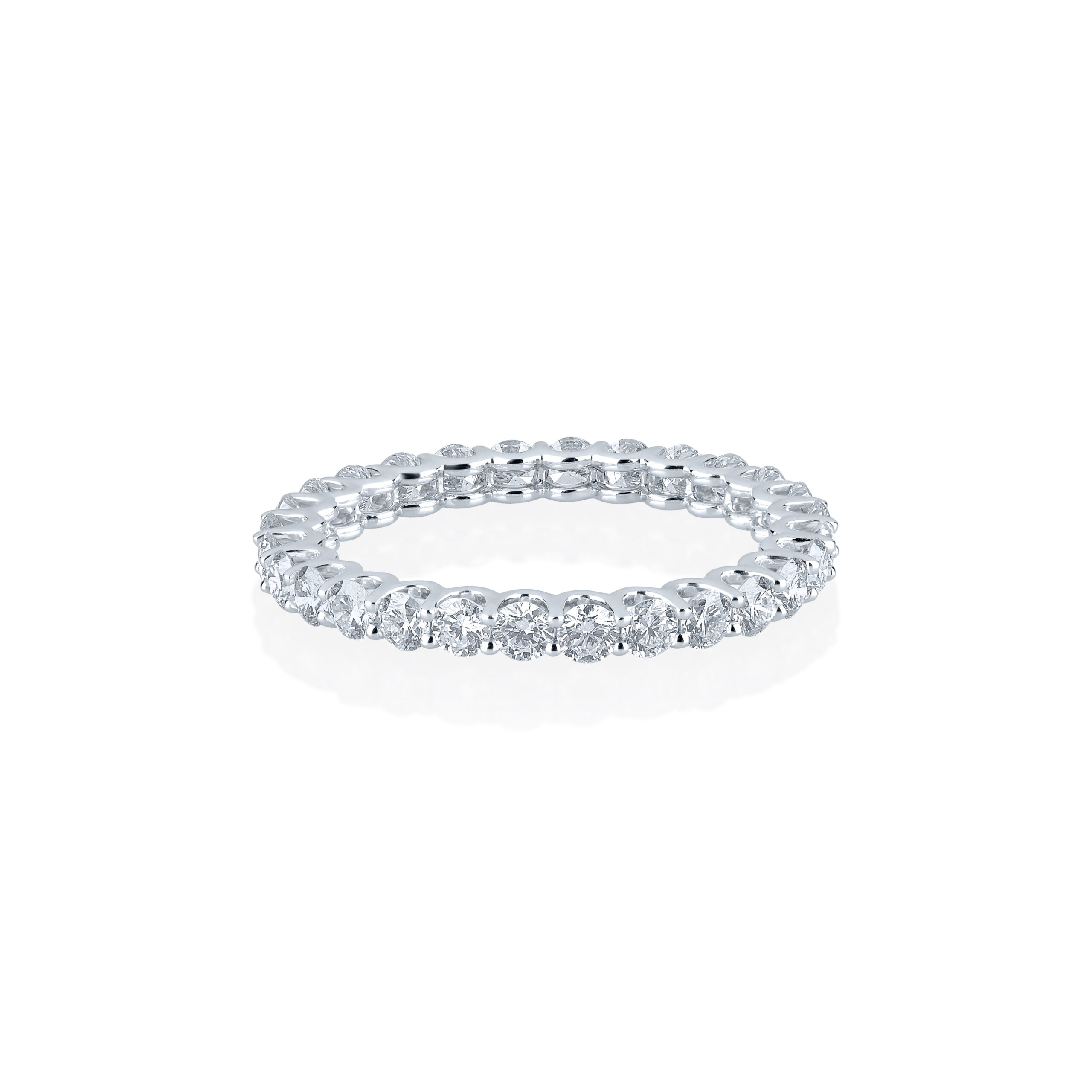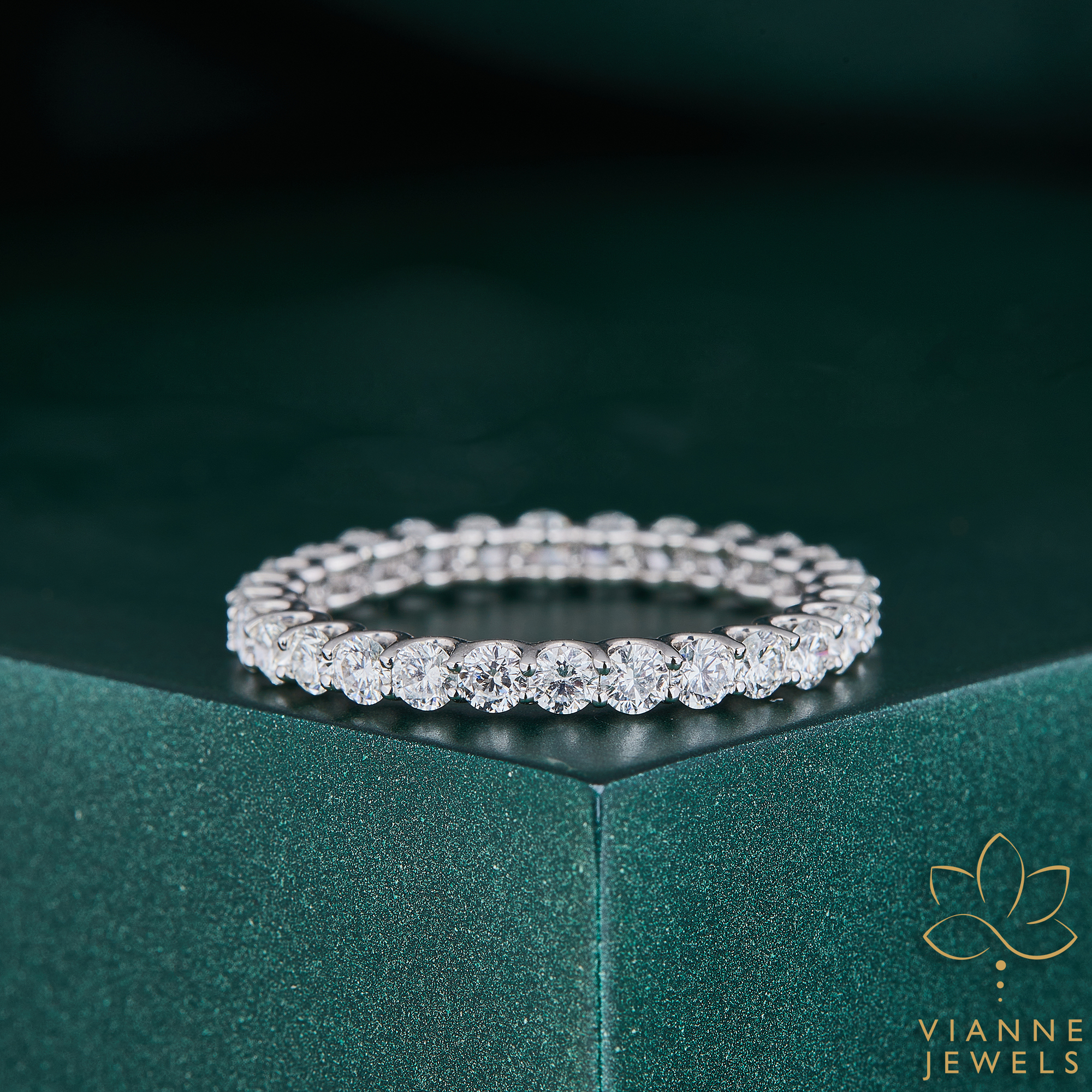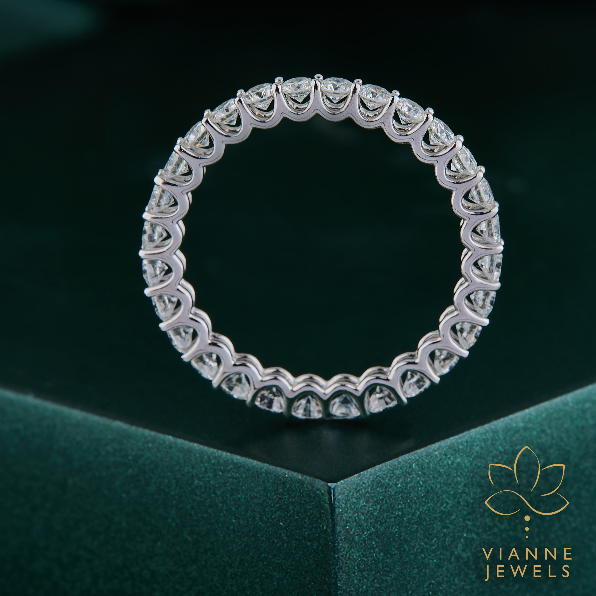 “Introducing the Petite Luxe Eternity Ring, where delicate design meets the brilliance of sustainable luxury. This ring is a symphony of light, created with a full circle of meticulously matched lab-grown diamonds, each one set with precision in a slim 14K white gold band that exudes elegance.